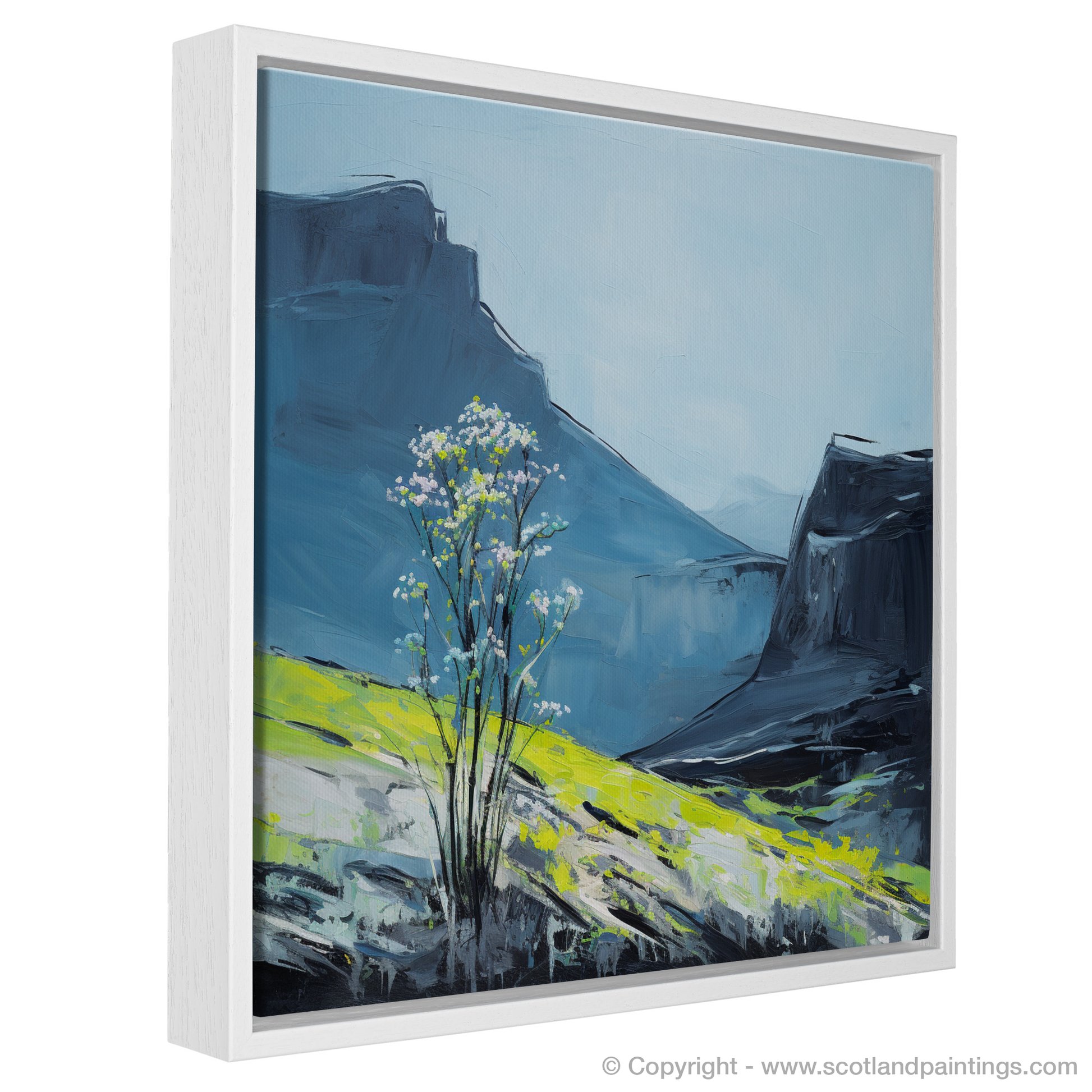 Amidst this dramatic scenery, a cluster of meadow-rue, depicted in ethereal whites and greens, emerges with youthful vibrancy on sunlit slopes. The vivid yellow-green hues, suggestive of light filtering through the rarefied Highland air, juxtapose against the shadowy mountains, accentuating the flora's delicate resilience.
