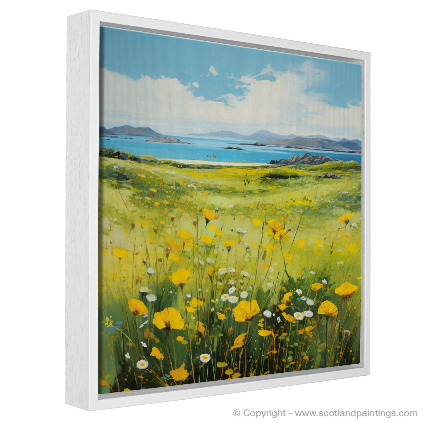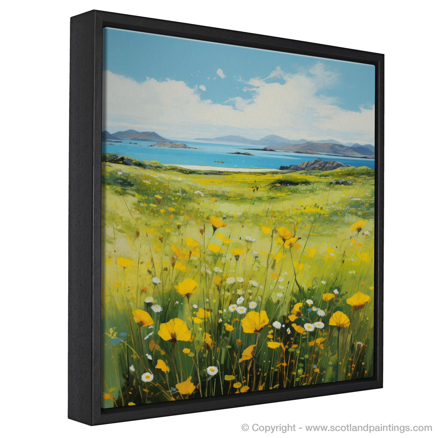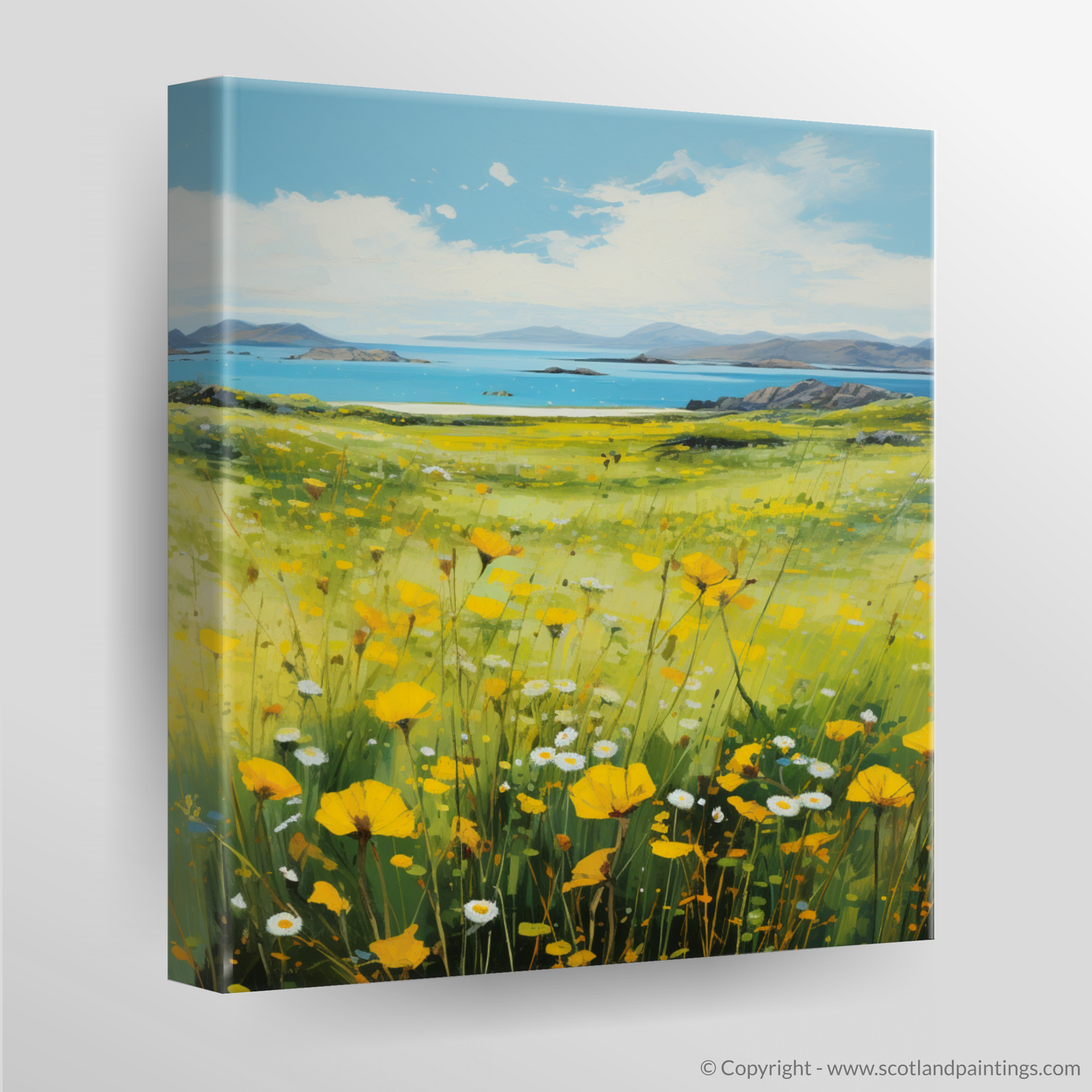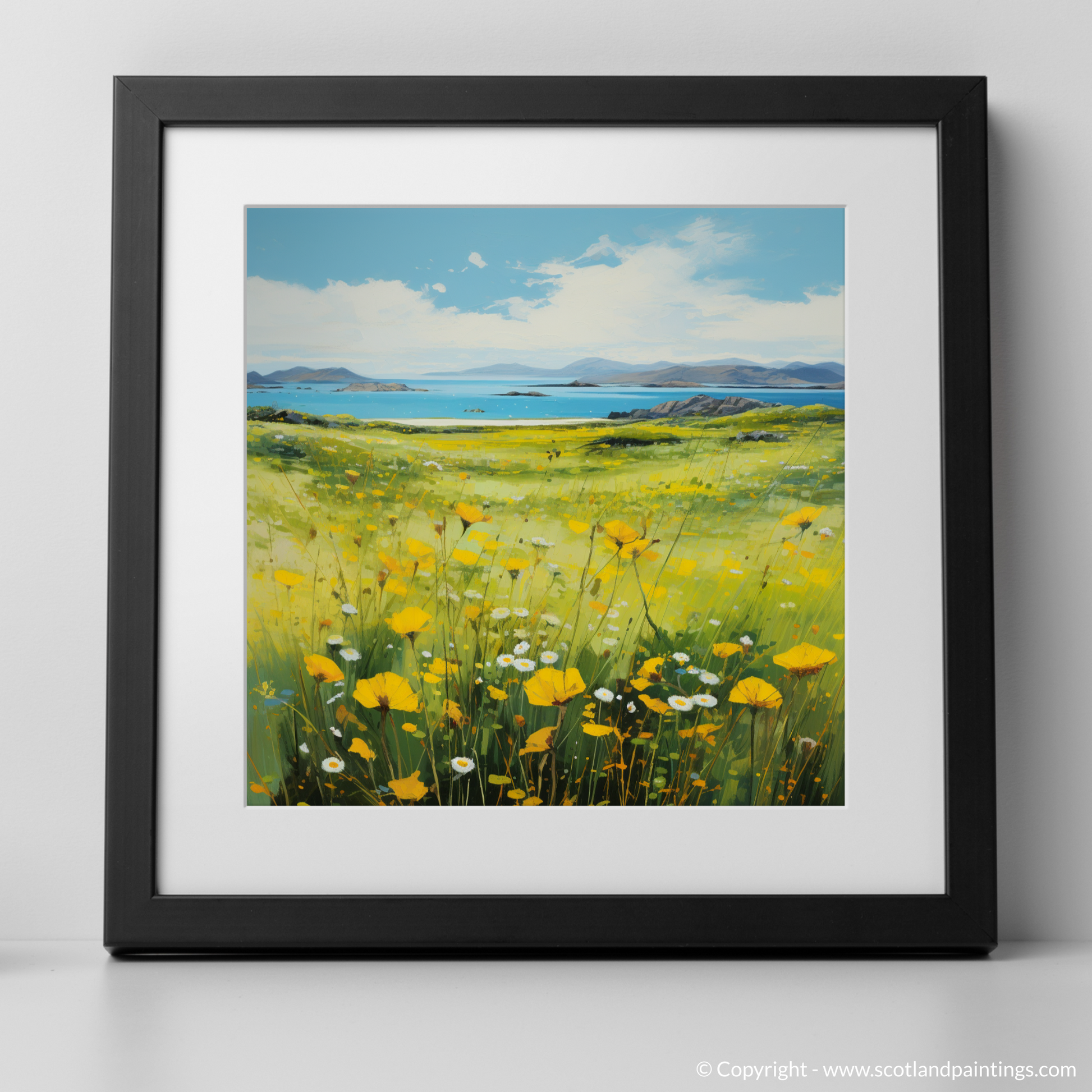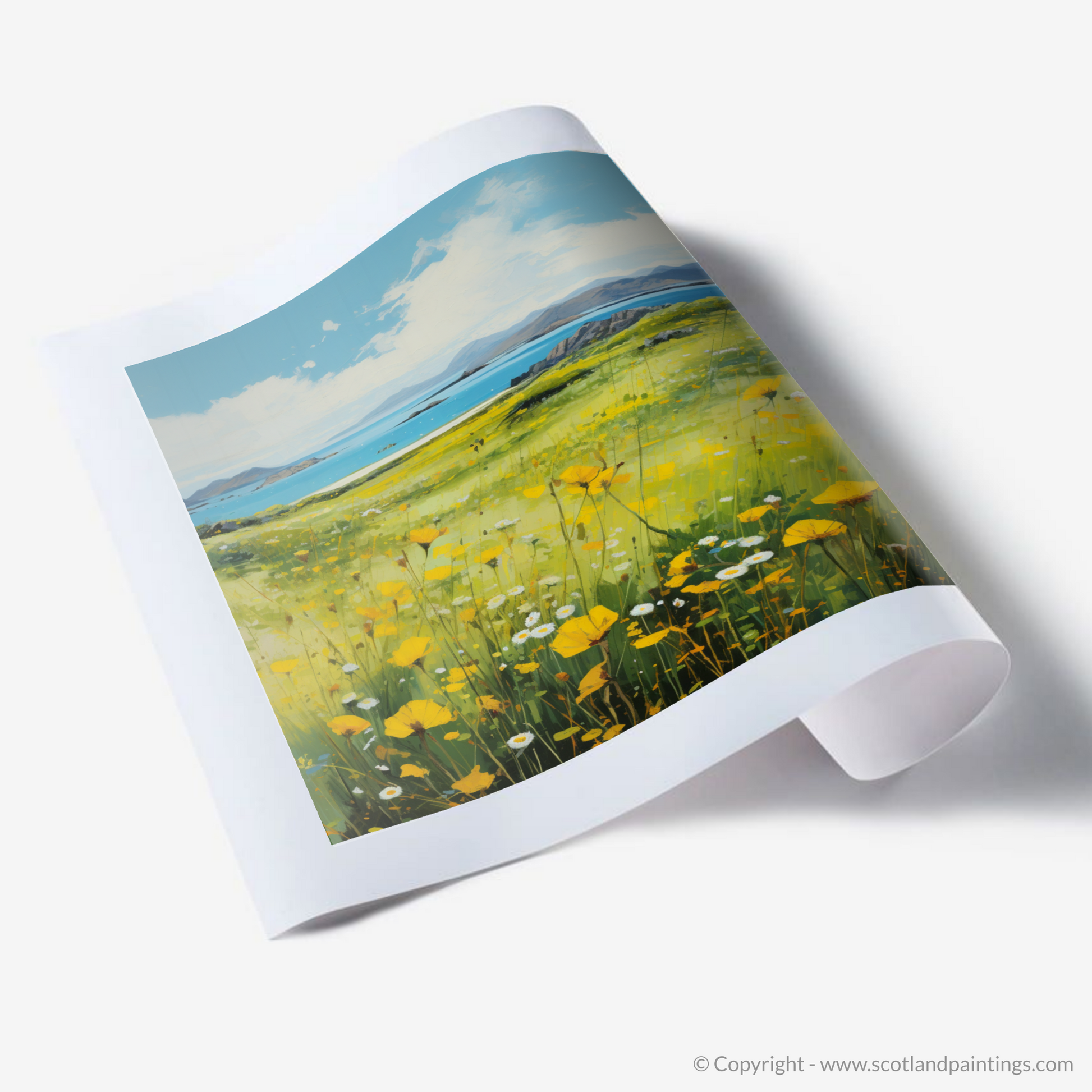 Escape to the serene beauty of the Outer Hebrides with our charming print, a whimsical celebration of the region's natural splendour. This eye-catching piece captures the quintessence of the Machair's wild meadows, renowned for their breathtaking Yellow rattle and vibrant florals that sweep across the canvas in a sea of lush greens and sunny yellows.