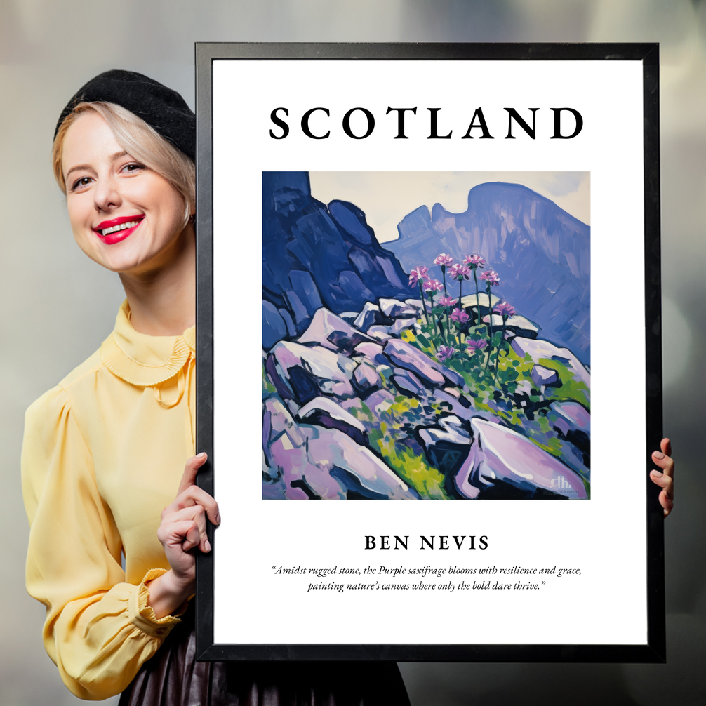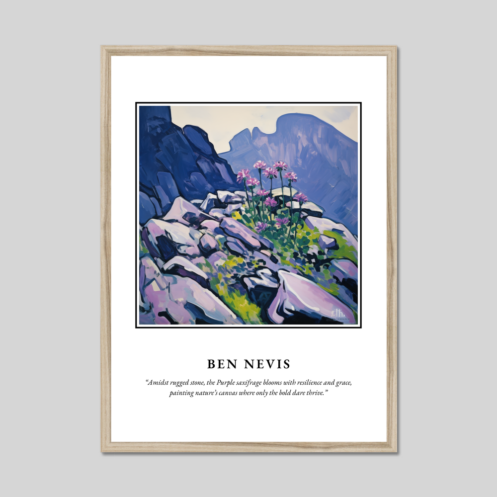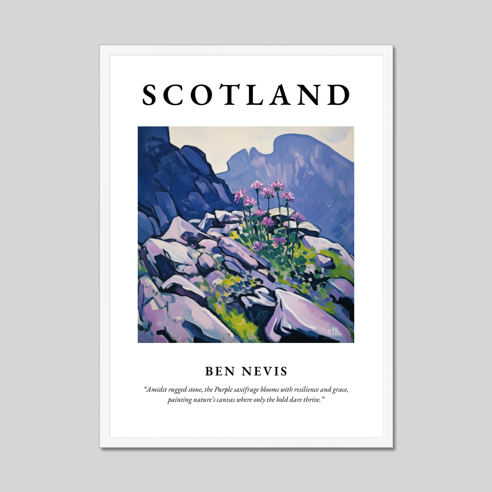Choose from an elegant black, crisp white, or natural wood-effect frame to complement your space and style. The eye-catching layout features the word “SCOTLAND” boldly emblazoned at the top, underscoring the true essence of the landscape. Below it, a breathtaking Fauvism-styled depiction of Ben Nevis bursts into life, celebrating the mountain's rugged formations enveloped in vibrant colours filled with expression and intensity. At the foot of this awe-inspiring scene, the delicate charm of the Purple saxifrage blooms, underscored by the touching quote: “Amidst rugged stone, the Purple saxifrage blooms with resilience and grace, painting nature’s canvas where only the bold dare thrive.”