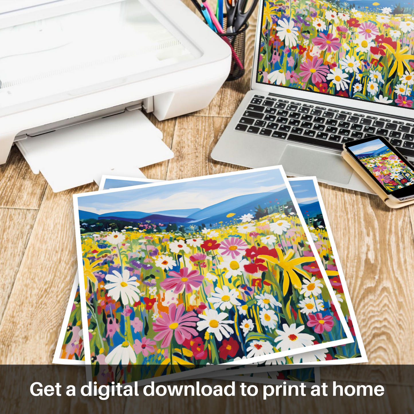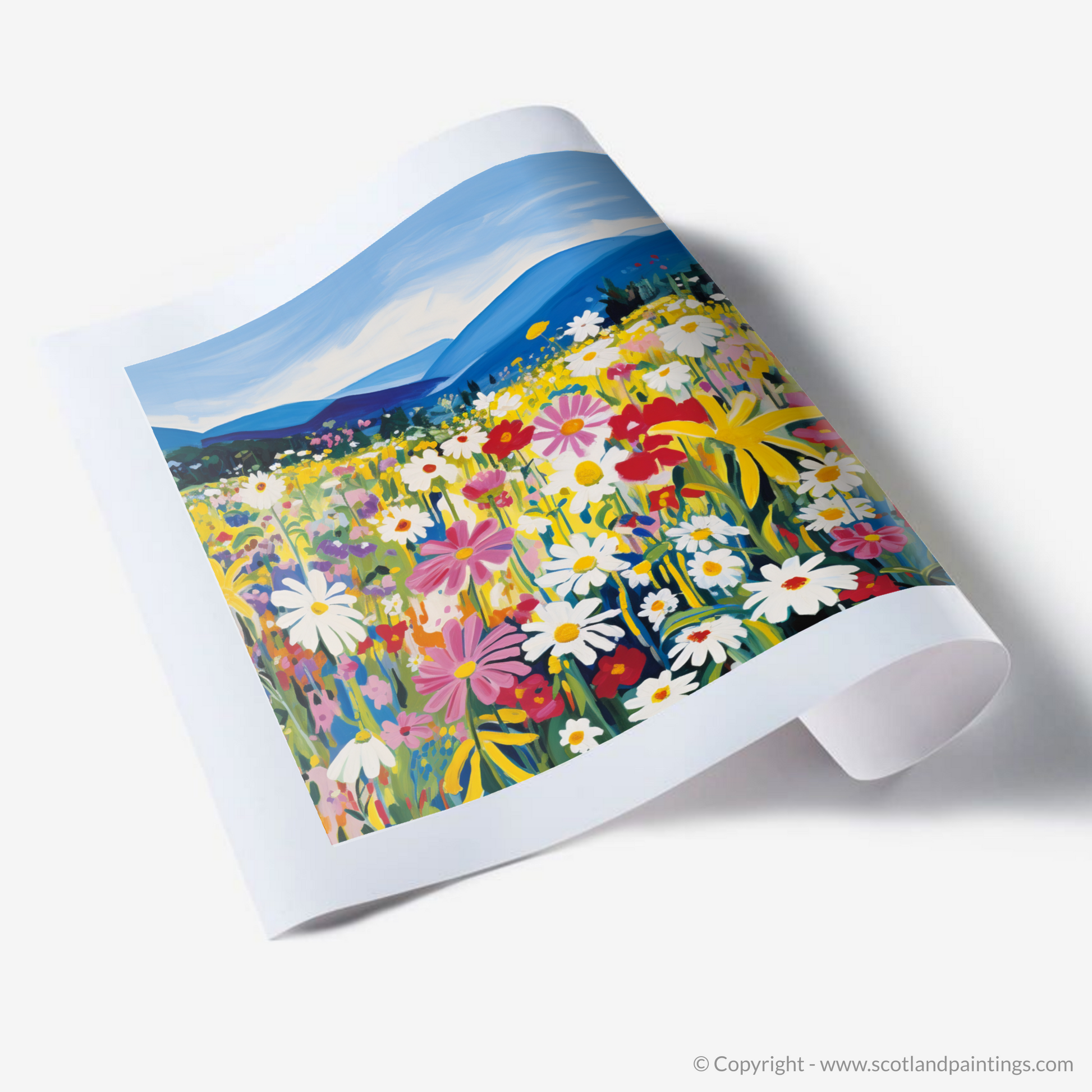 Immerse yourself in a vibrant celebration of Scottish wilderness with our exclusive print, encapsulating the essence of The Trossachs' meadows in full bloom. Bold strokes and exuberant hues are the hallmarks of this piece, evoking the liveliness and freedom of Fauvist art. The composition is a riot of colour, capturing the untamed energy of wildflowers against the tranquil backdrop of rolling hills and a sweeping sky.