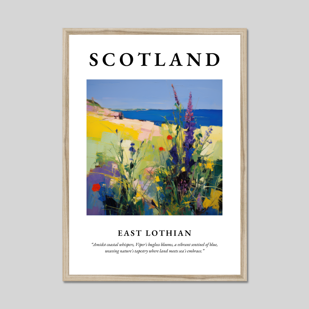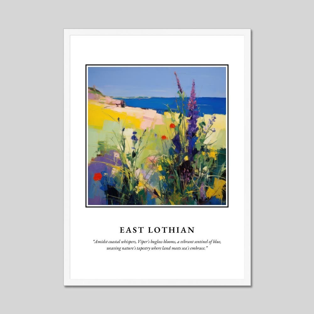 Beneath this swirling vista rests the poignant quote, "Amidst coastal whispers, Viper's bugloss blooms, a vibrant sentinel of blue, weaving nature's tapestry where land meets sea's embrace.” This sentiment perfectly captures the essence of East Lothian’s natural splendour, making the print not just a visual delight but also a narrative of place and memory.