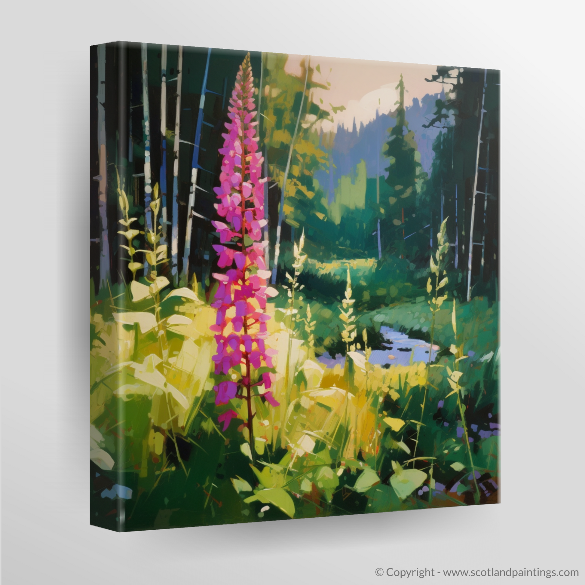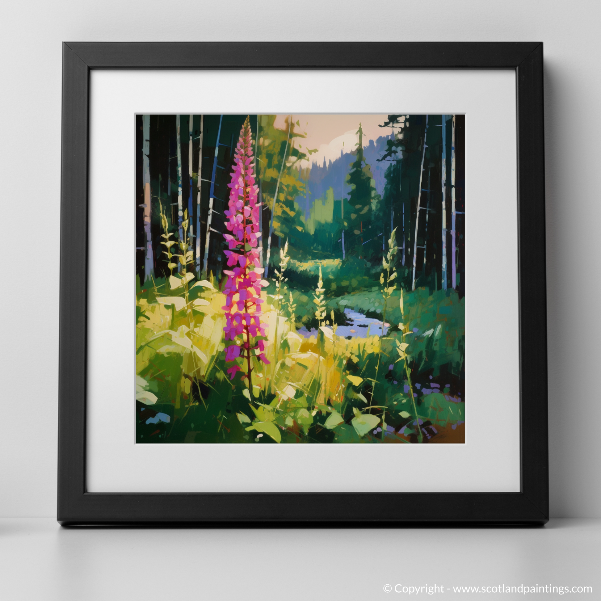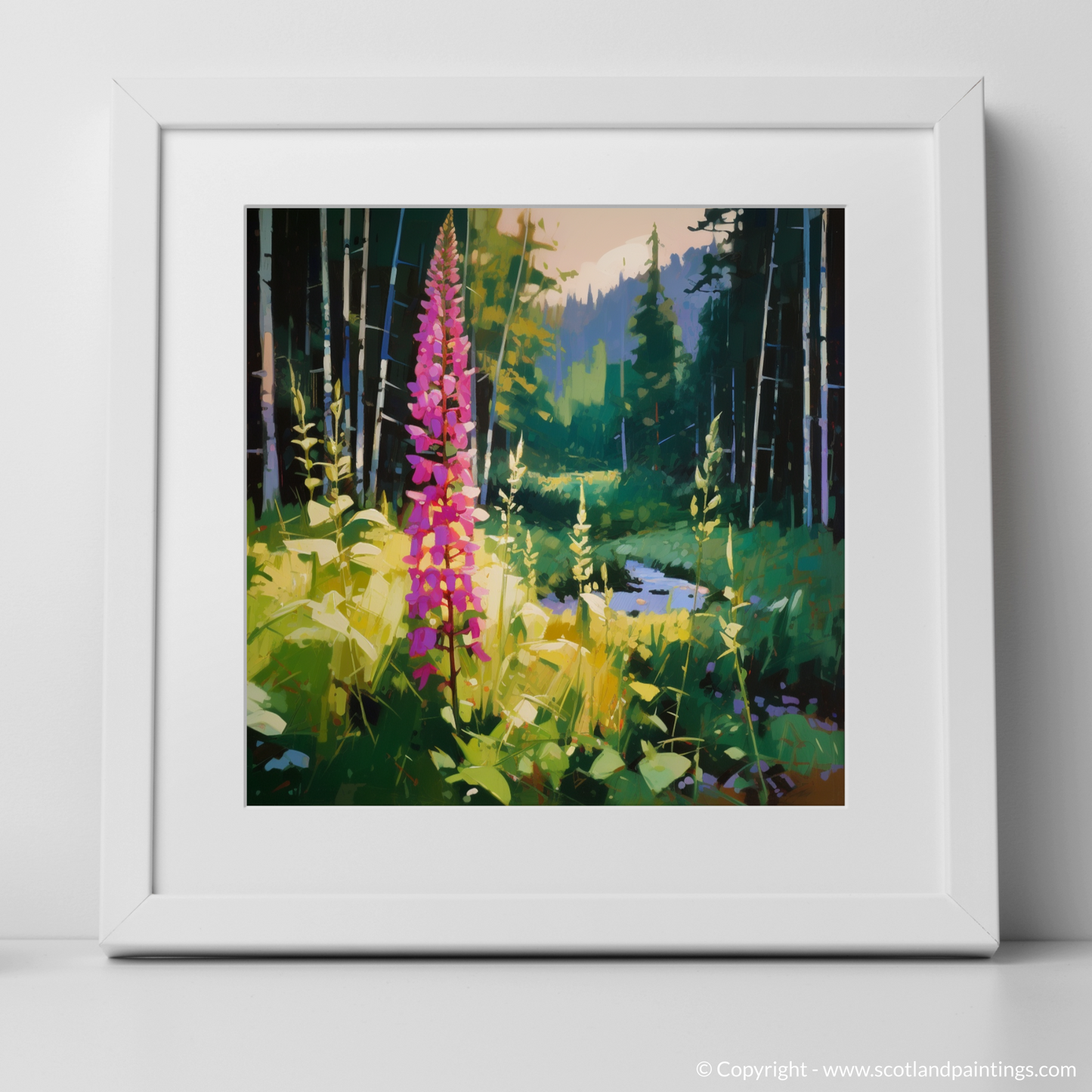 Emerging from the verdant underbrush, a stately foxglove stands as a sentinel amidst the woodland near Plockton, its magenta blossoms a vibrant tribute to the lush Scottish flora. Captured in a contemporary style, this exquisite print elevates the essence of nature's own artistry. Bold brushstrokes of contrasting light and shadow carve out the forest setting, with dappled sunlight filtering through the canopy to kiss the earthy floor enriched with ample greens and earth tones.