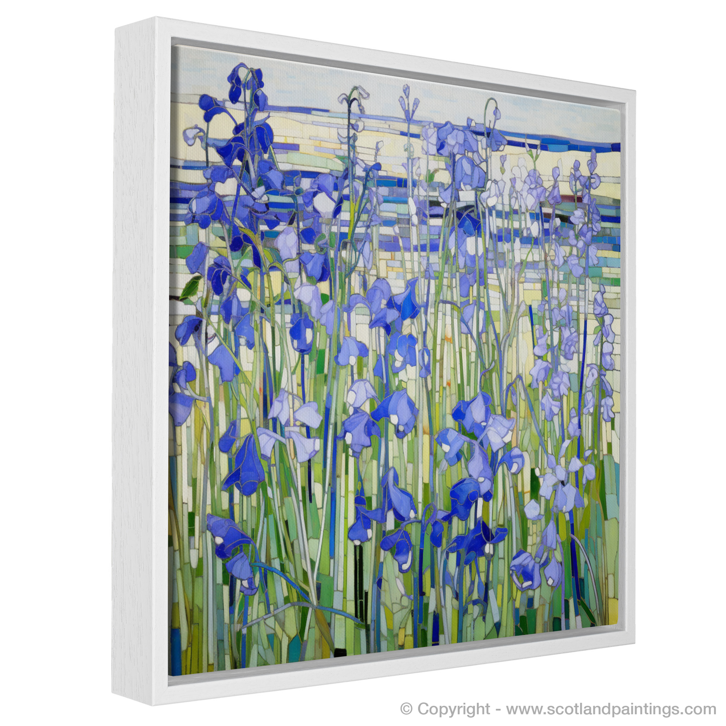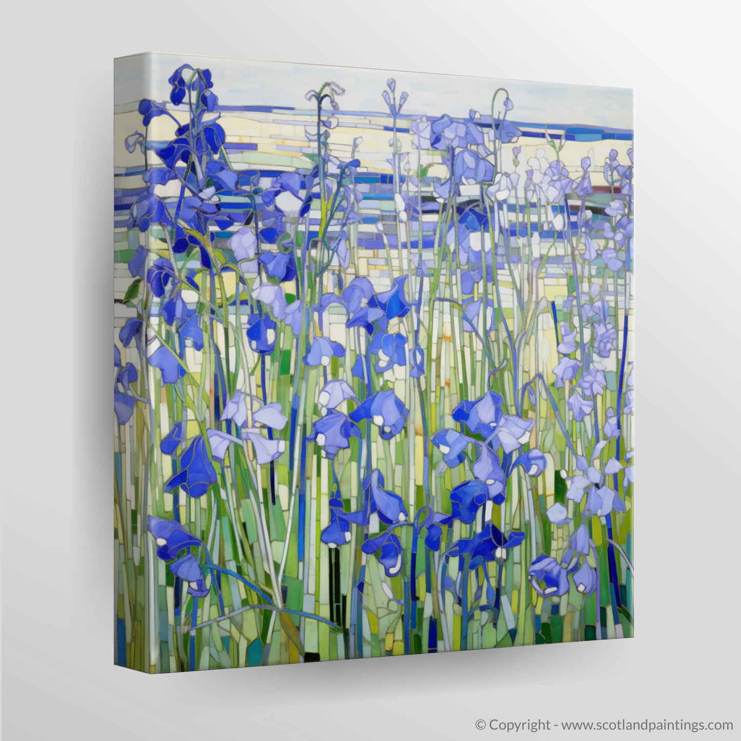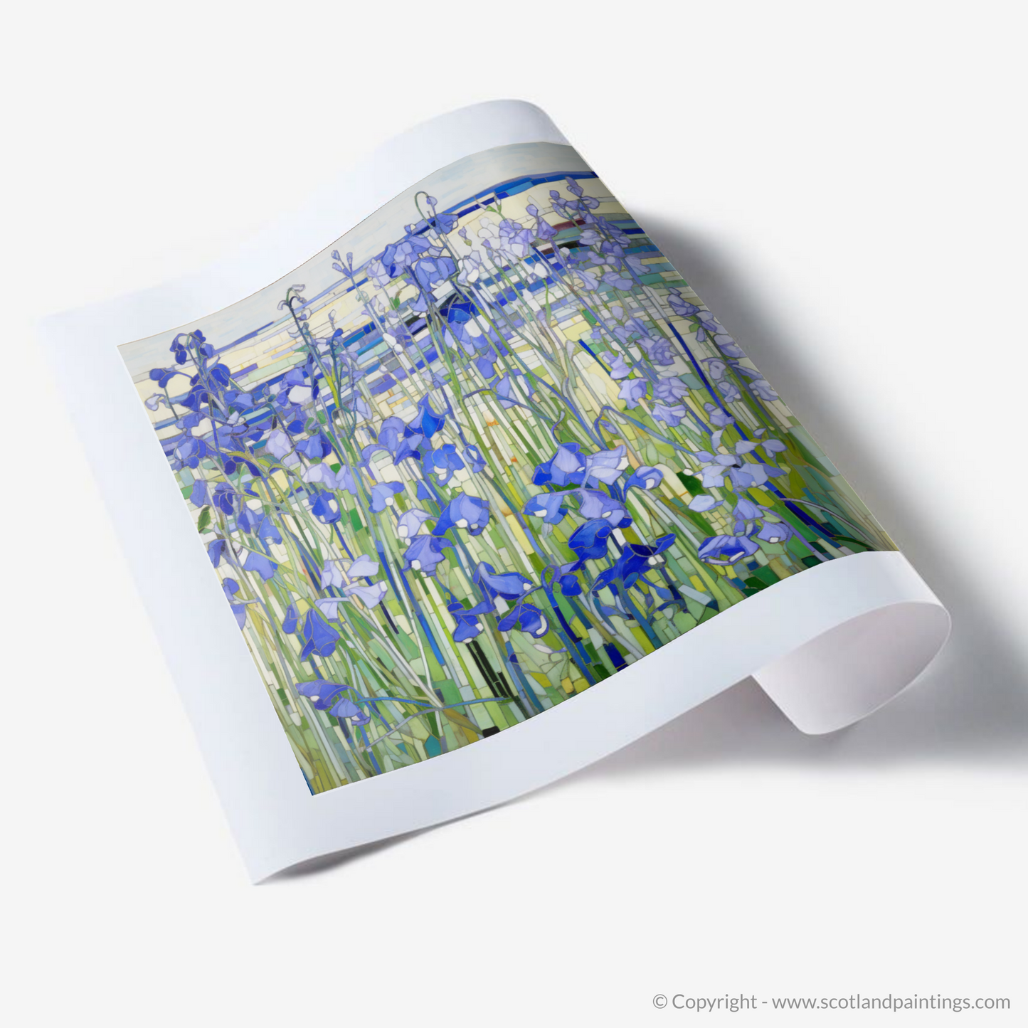 Bold, blue tones dominate the field of vision, embodying the delicate petals of Harebell, as they are distributed with a rhythm that mimics their natural, untamed clusters. Among these, hints of wild thyme sprinkle the composition with subtle, earthy greens while flecks of creamy whites suggest the presence of the modest eyebright, playing a supporting role in this contemporary portrayal of a Scottish meadow.