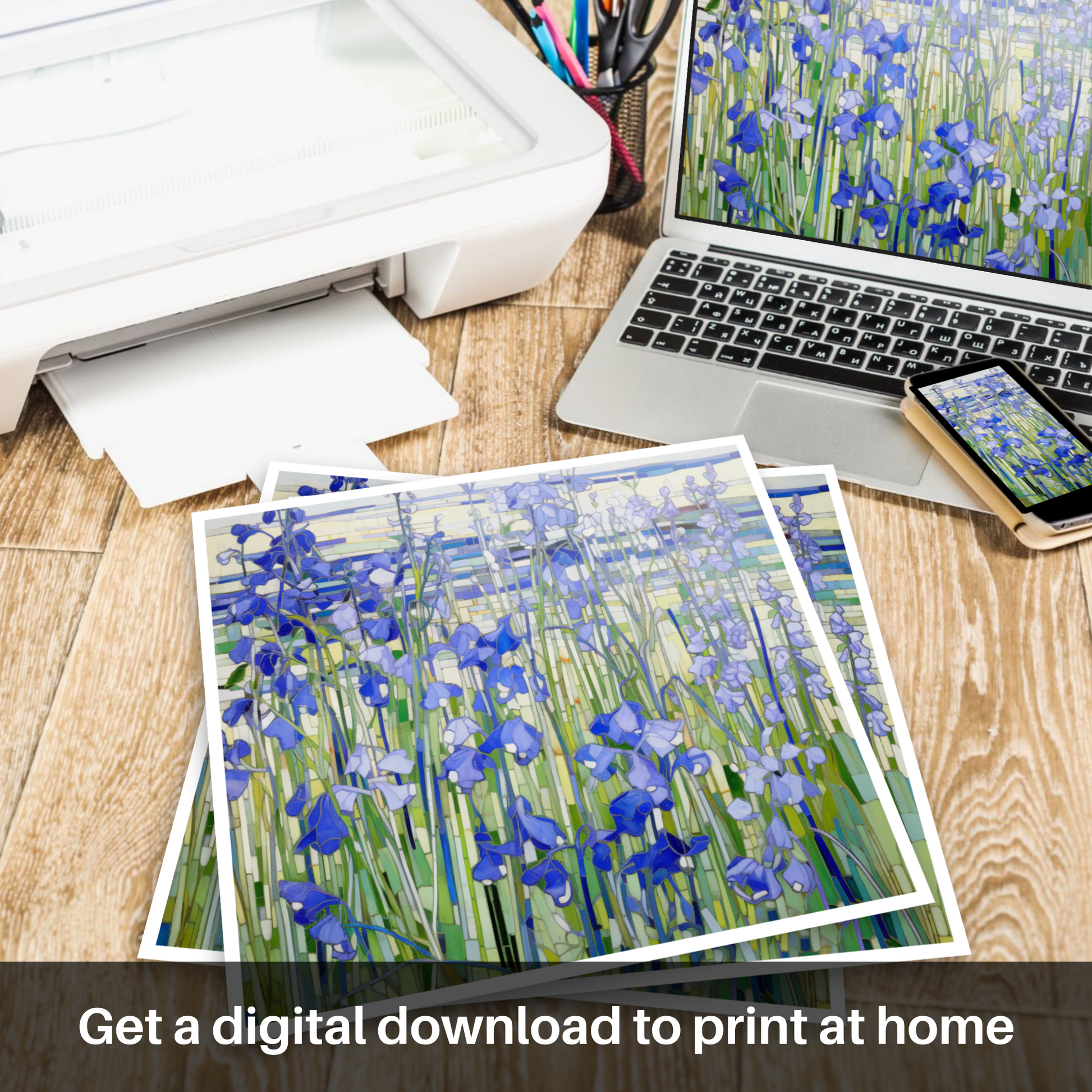 Immerse yourself in the ethereal beauty of Scotland's grasslands with our evocative abstract print, a celebration of the country's delicate flora. Infused with the enchanting hues of Harebell, wild thyme, and eyebright, the artwork transports viewers to the verdant expanses of Speyside. The piece strays delightfully from literal interpretation, favouring instead a mosaic of geometric shapes and fragmented colours that dance across the canvas, capturing the fleeting essence of wildflowers swaying in the breeze.