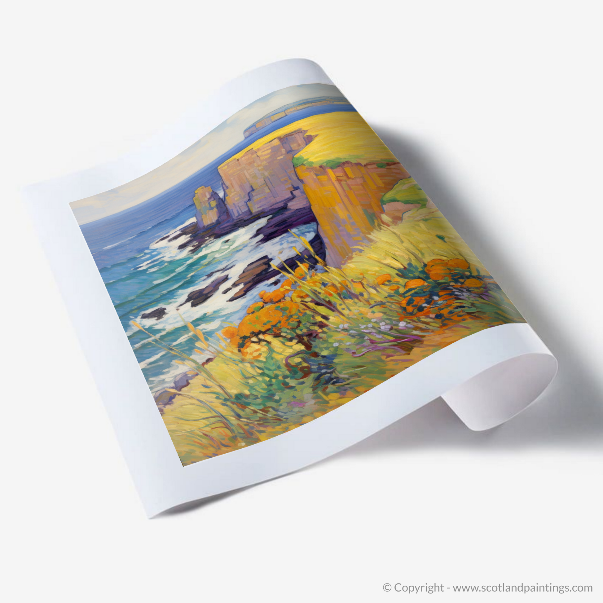 Immerse yourself in the vibrant embrace of nature with this striking print, capturing the essence of the Golden samphire perched atop the windswept cliffs of Berwick-upon-Tweed—Scotland's northernmost town. Evoking the fervour and boldness of Fauvist masters, the piece brims with unrestrained colour and spirited brushstrokes, portraying the wild Scottish landscape in a blaze of glory.