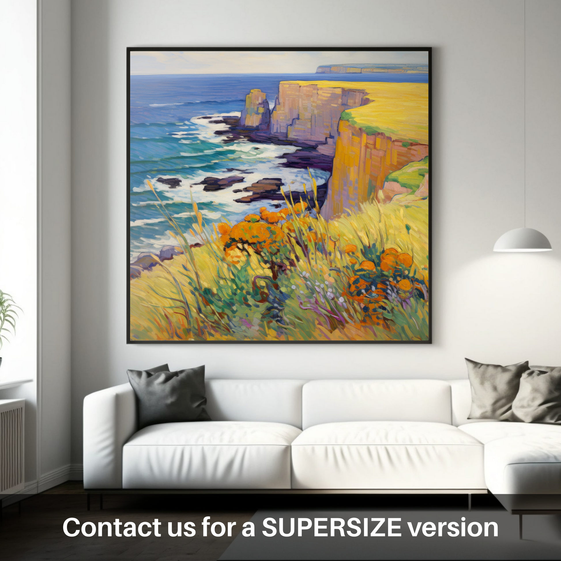 The sky's vast expanse transitions from a serene blue to a soft purple, harmoniously crowning the spectacular view. This print brings the sublime Scottish coastal atmosphere into your space, offering a window to a realm where colour reigns supreme, and the beauty of Scotland's wild flowers and rugged cliffs is celebrated with every bristle stroke.