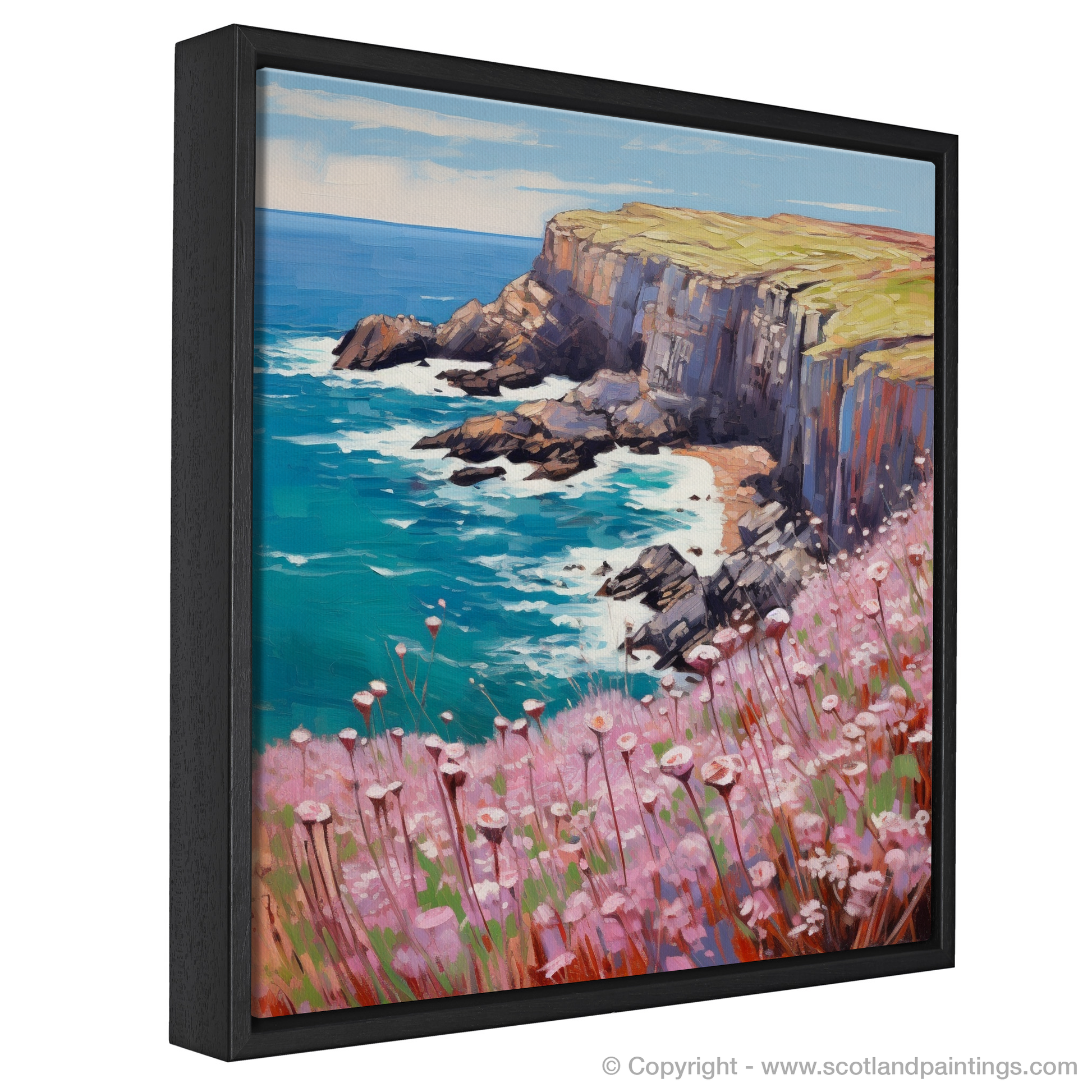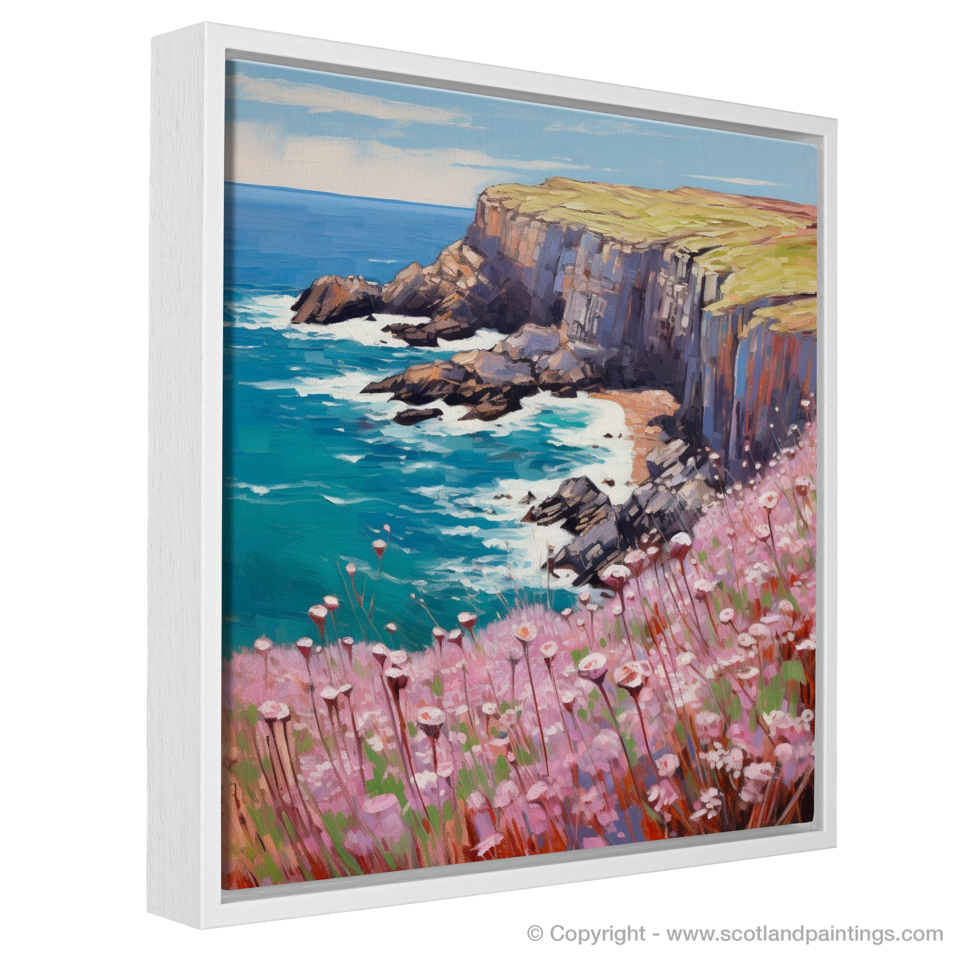 The foreground is dominated by a blush of Sea thrift, painted in hues of soft pink and gentle lavender, their delicate blooms swaying atop slender, grass-like stems. The rich pinks form a captivating contrast against the lush greens of the windswept cliff tops, evoking the untamed beauty of Scotland's natural landscapes.