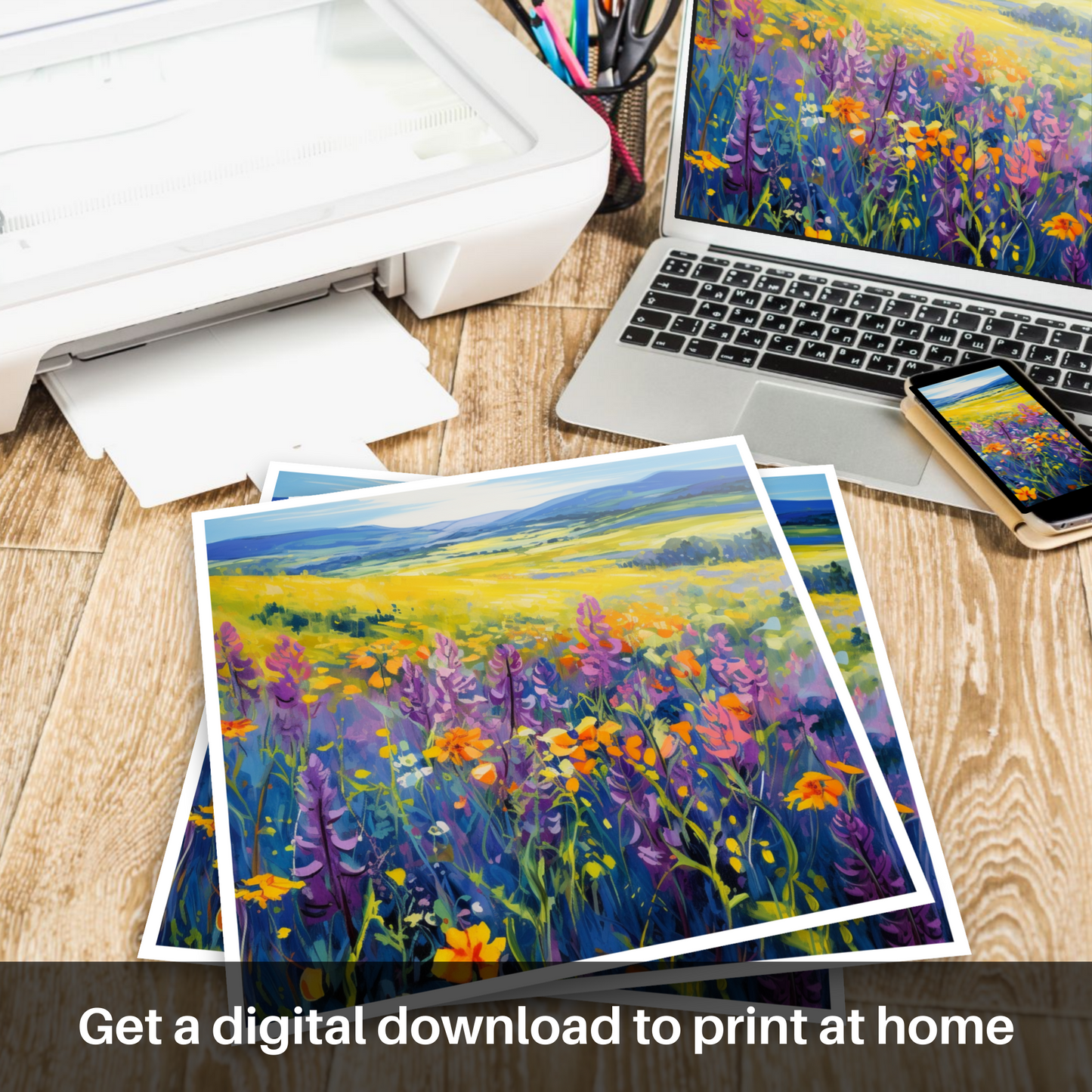A joyous representation of the meadow's tapestry is masterfully achieved through energetic brushstrokes and a kaleidoscope of colour that brings this piece to vibrant life. The background is a lyrical blend of golds and greens, mimicking the rolling hills and fertile lands that are a hallmark of the region's picturesque landscape. Contrasting blues and purples lend depth to the field and sky, capturing the essence of a wildflower meadow basking in the glow of dusk or dawn.