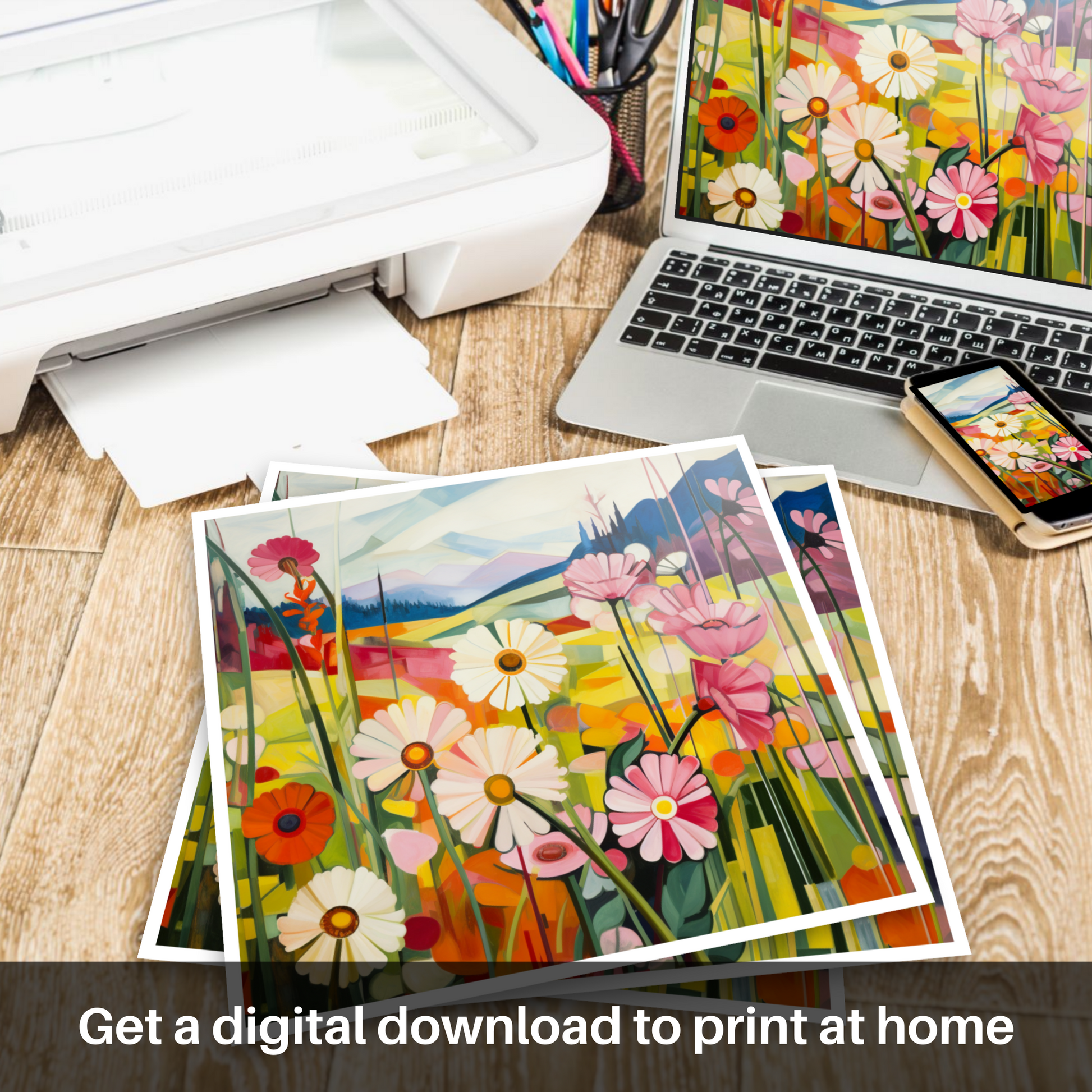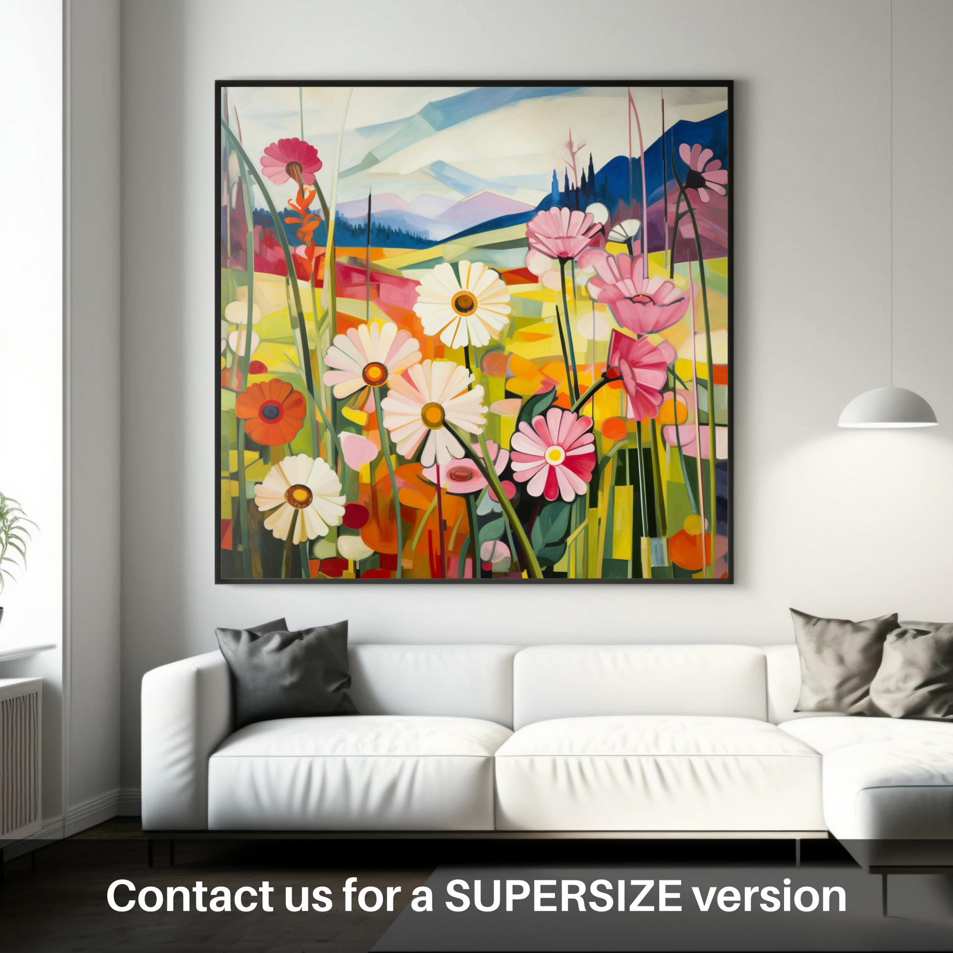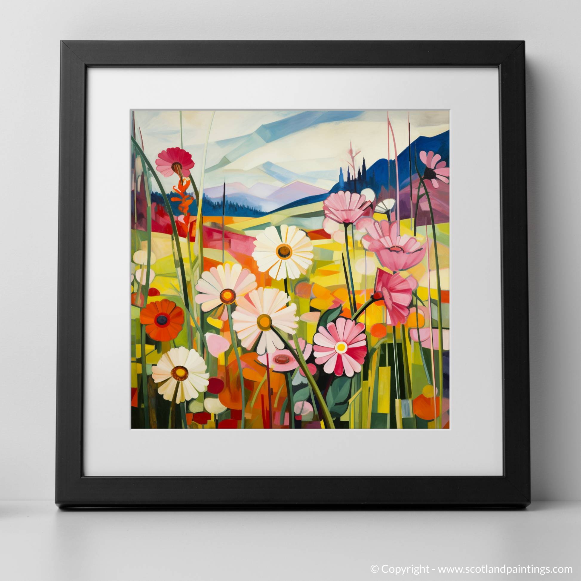 Immerse yourself in the geometric vibrancy of nature with this unique print, capturing the essence of The Trossachs' wild meadows. Bold angular segments blend together to form an array of Red campion, oxeye daisies, and yellow rattle - a symphony of flora that seems to sway to an unseen breeze. Each flower is reimagined through the prism of Cubism, presenting familiar Scottish wildflowers in an entirely new light, with sharply delineated petals and leaves that fragment the composition into an interplay of colour and form.