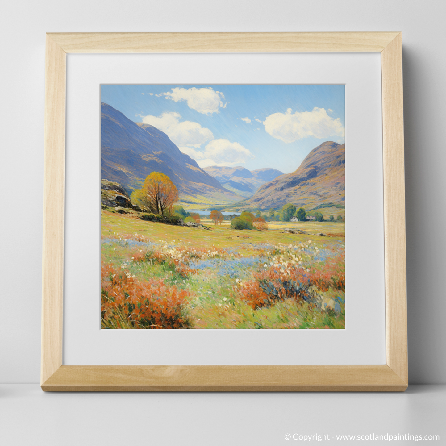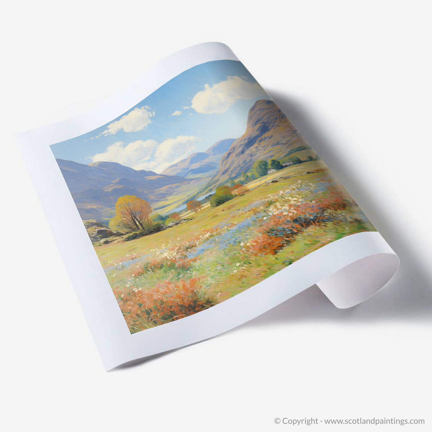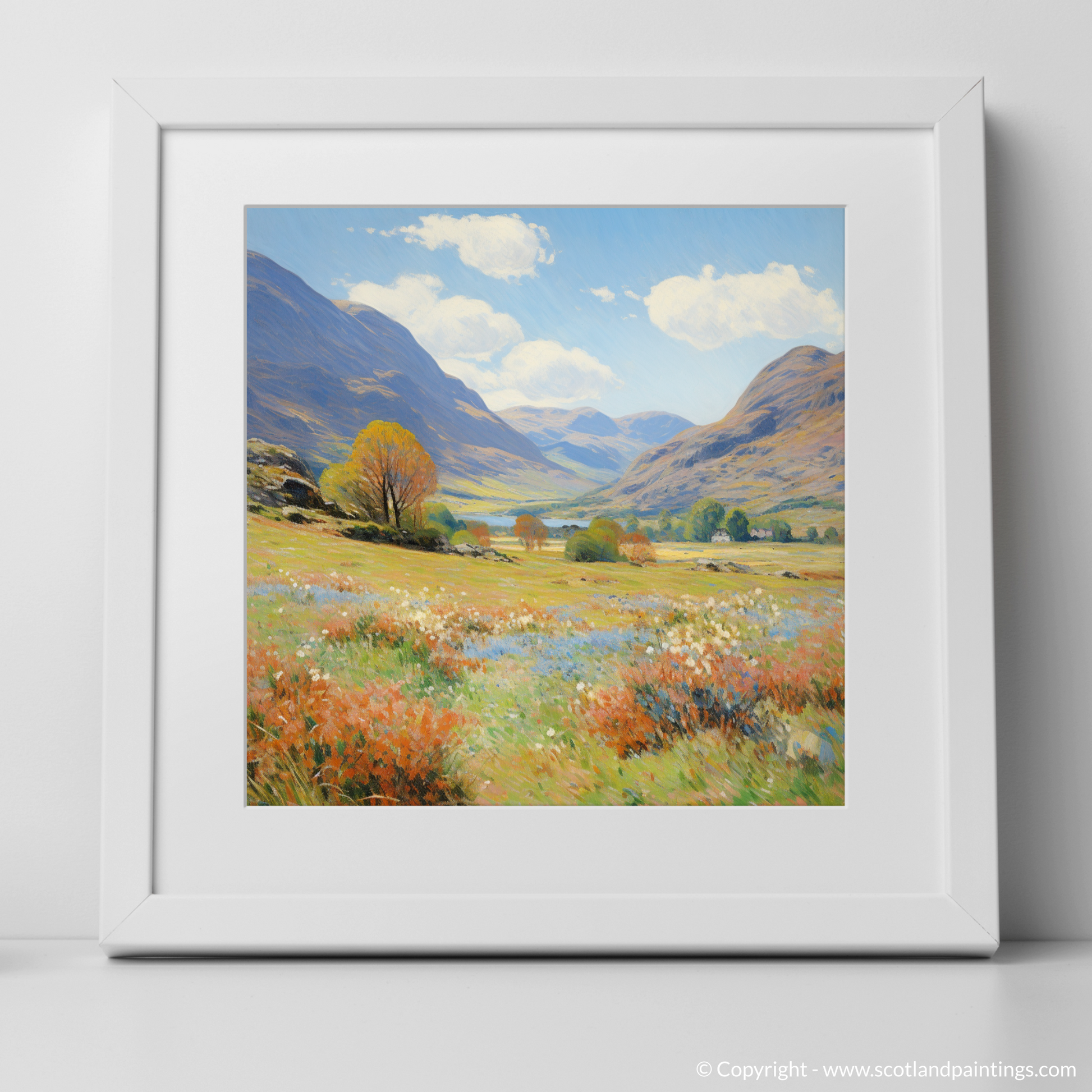 Capturing the serene beauty of Scotland's upland terrain, this exquisite print is a tribute to the untamed essence of Glenfinnan. The sweeping vista unfolds under a canopy of azure, with generous strokes of white clouds dotting the expansive sky. Beneath lies a picturesque painting, rich with the warmth of sunlight bathing the rugged landscape.