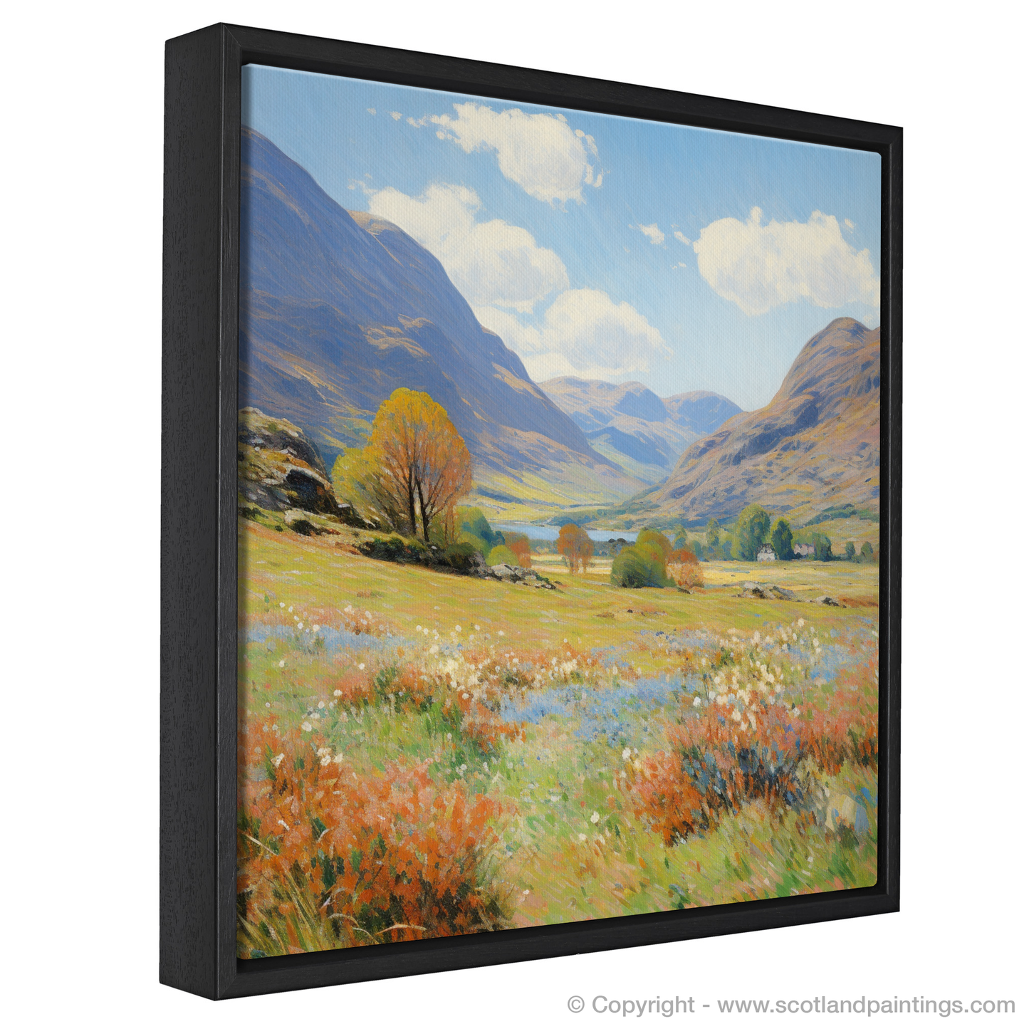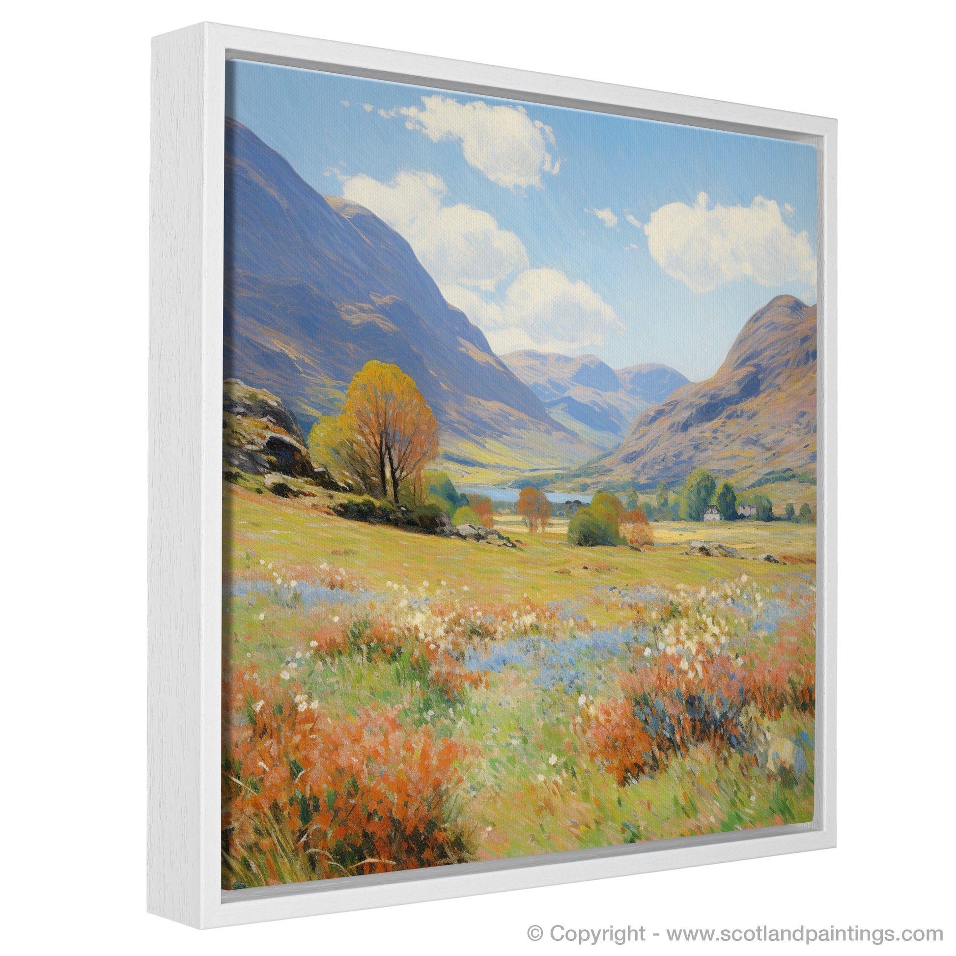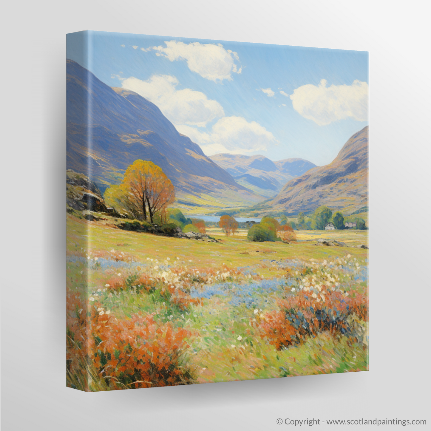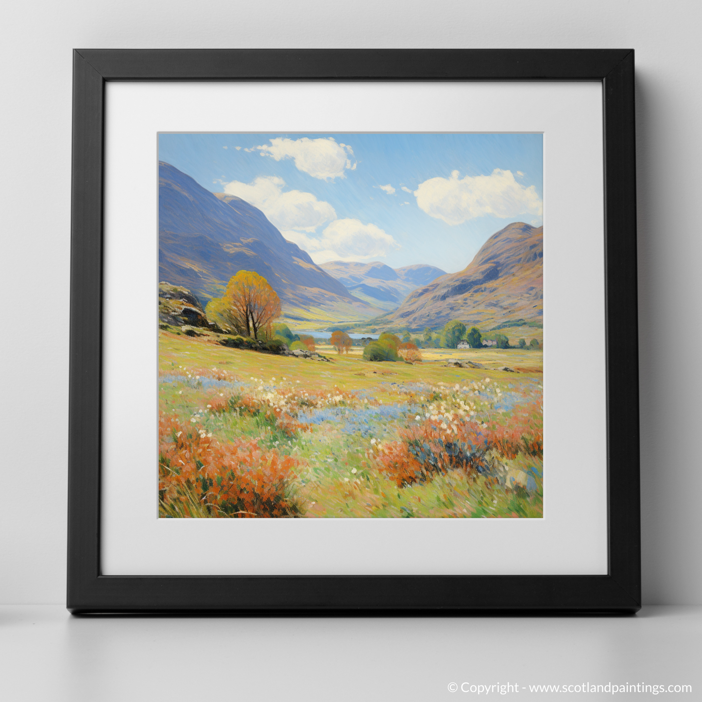 Capturing the serene beauty of Scotland's upland terrain, this exquisite print is a tribute to the untamed essence of Glenfinnan. The sweeping vista unfolds under a canopy of azure, with generous strokes of white clouds dotting the expansive sky. Beneath lies a picturesque painting, rich with the warmth of sunlight bathing the rugged landscape.