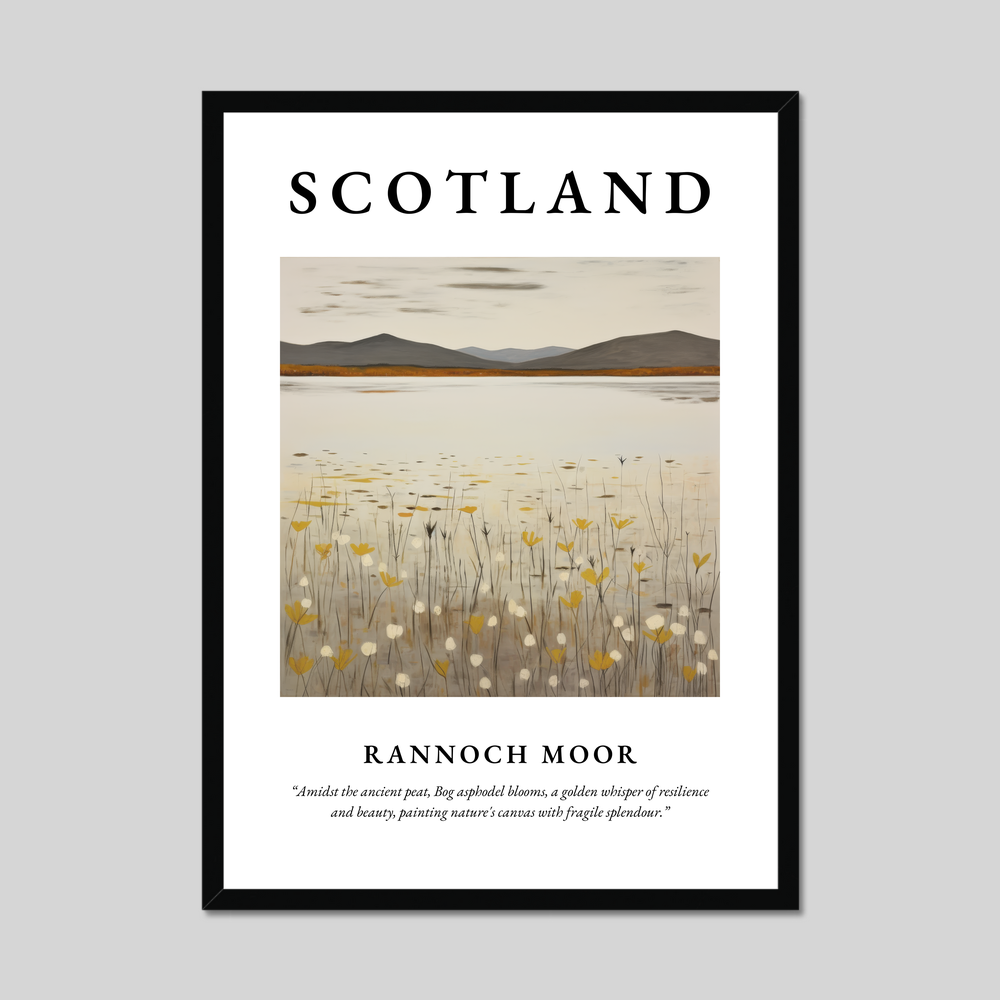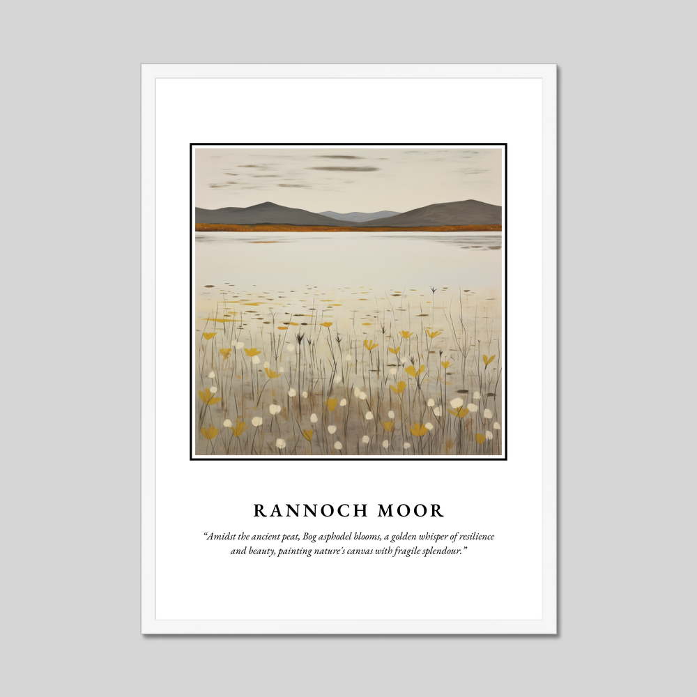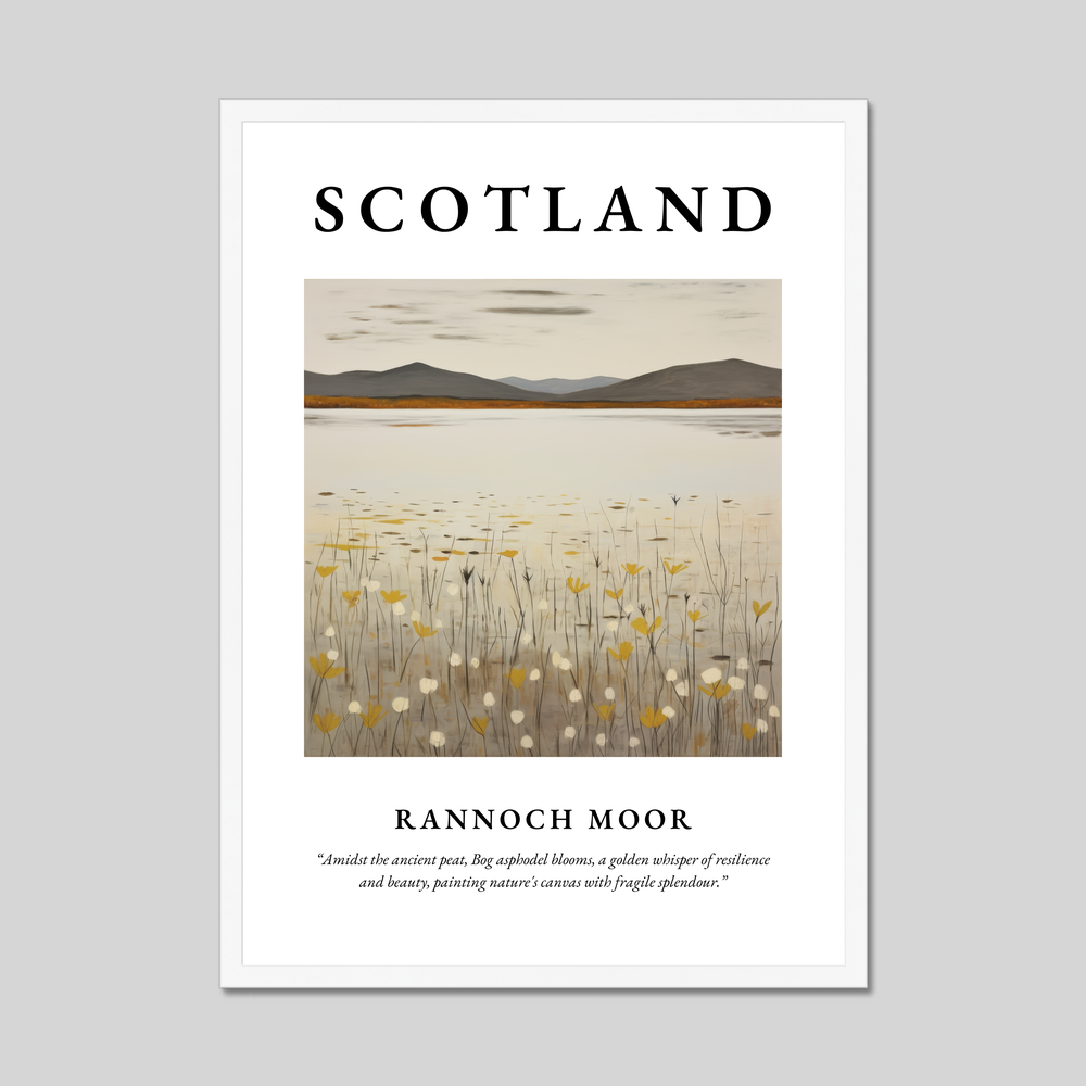 In the heart of the poster, a minimalist depiction of Rannoch Moor unfolds, featuring delicate strokes that echo the simplicity and grandeur of the moorlands. The bog asphodel blooms gently permeate the scene, their golden hues adding a whisper of resilience against the muted earth tones of the surrounding peat. This subtle artwork embodies nature’s canvas, offering a serene visual resonance that art lovers and travellers alike will cherish.