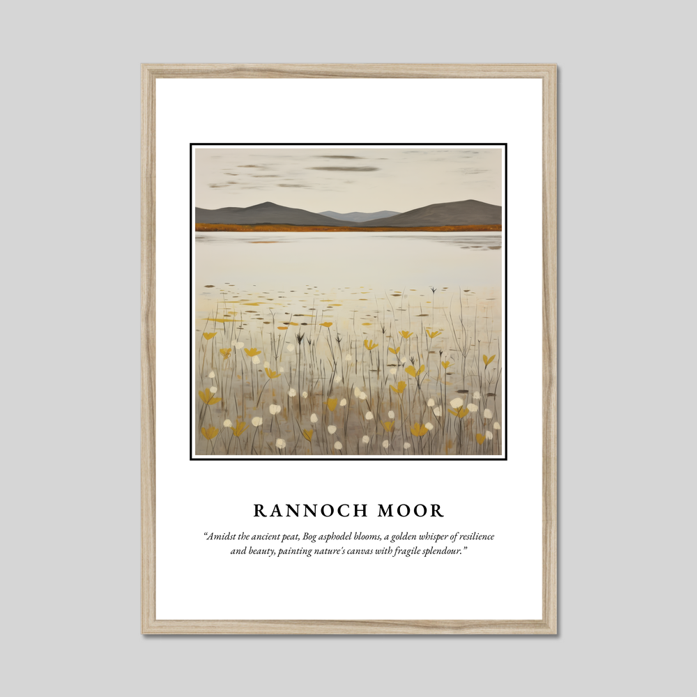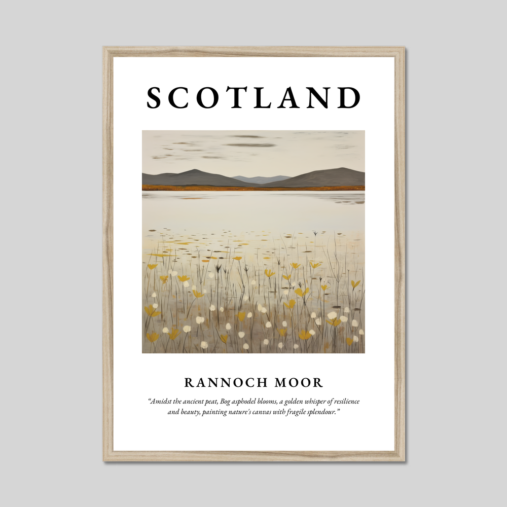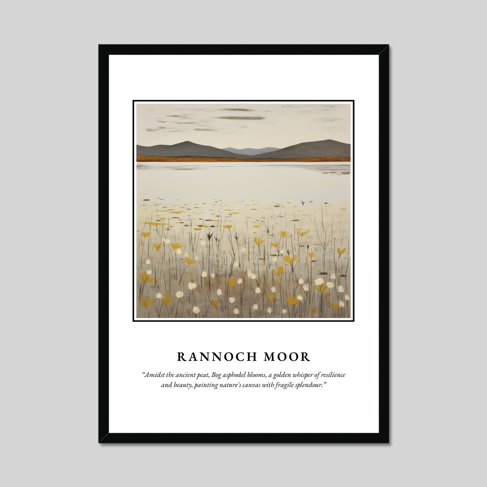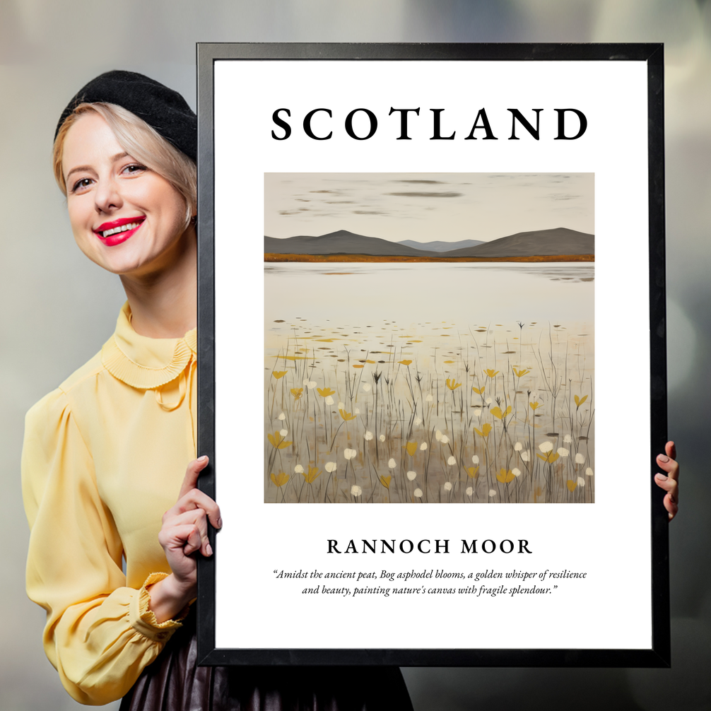 In the heart of the poster, a minimalist depiction of Rannoch Moor unfolds, featuring delicate strokes that echo the simplicity and grandeur of the moorlands. The bog asphodel blooms gently permeate the scene, their golden hues adding a whisper of resilience against the muted earth tones of the surrounding peat. This subtle artwork embodies nature’s canvas, offering a serene visual resonance that art lovers and travellers alike will cherish.