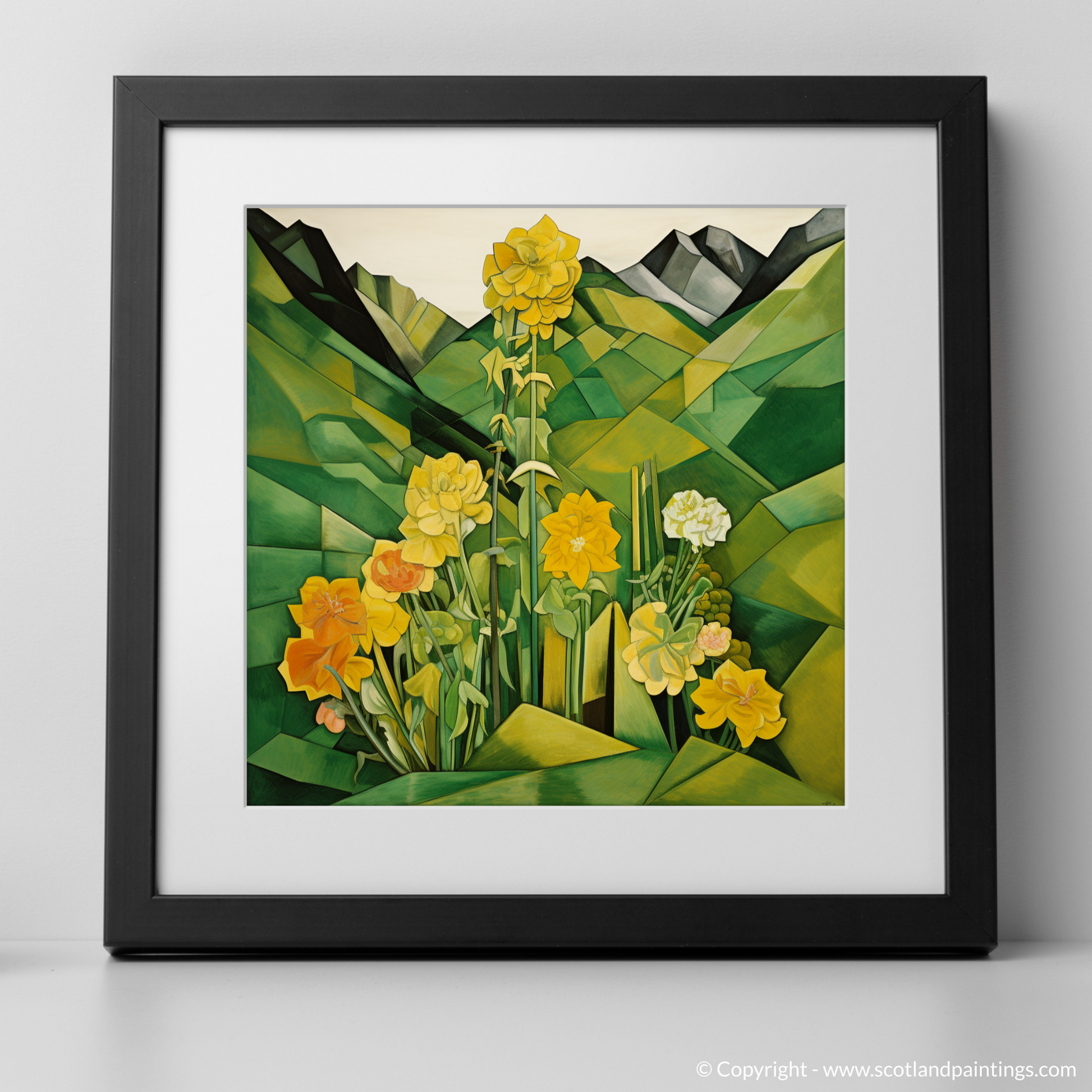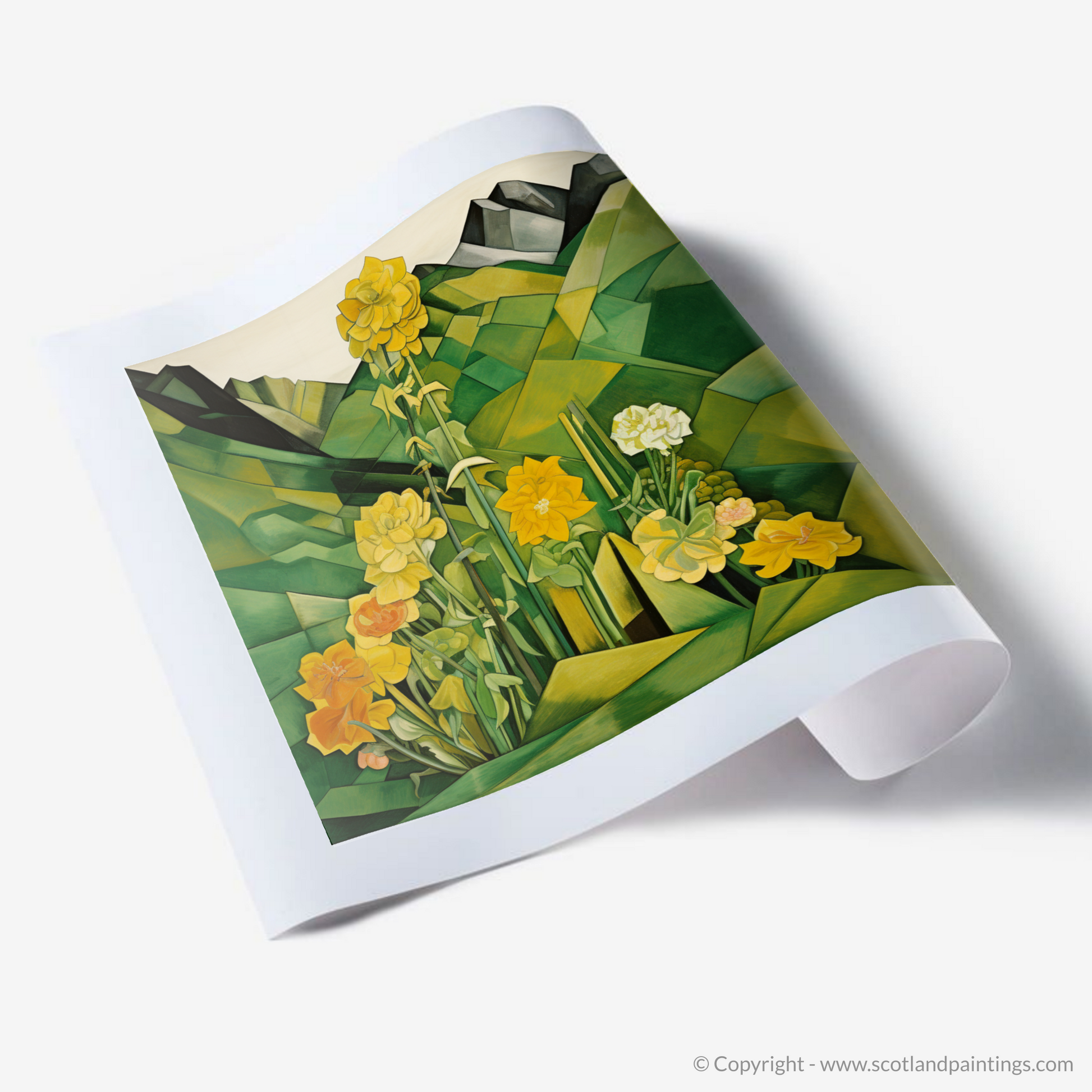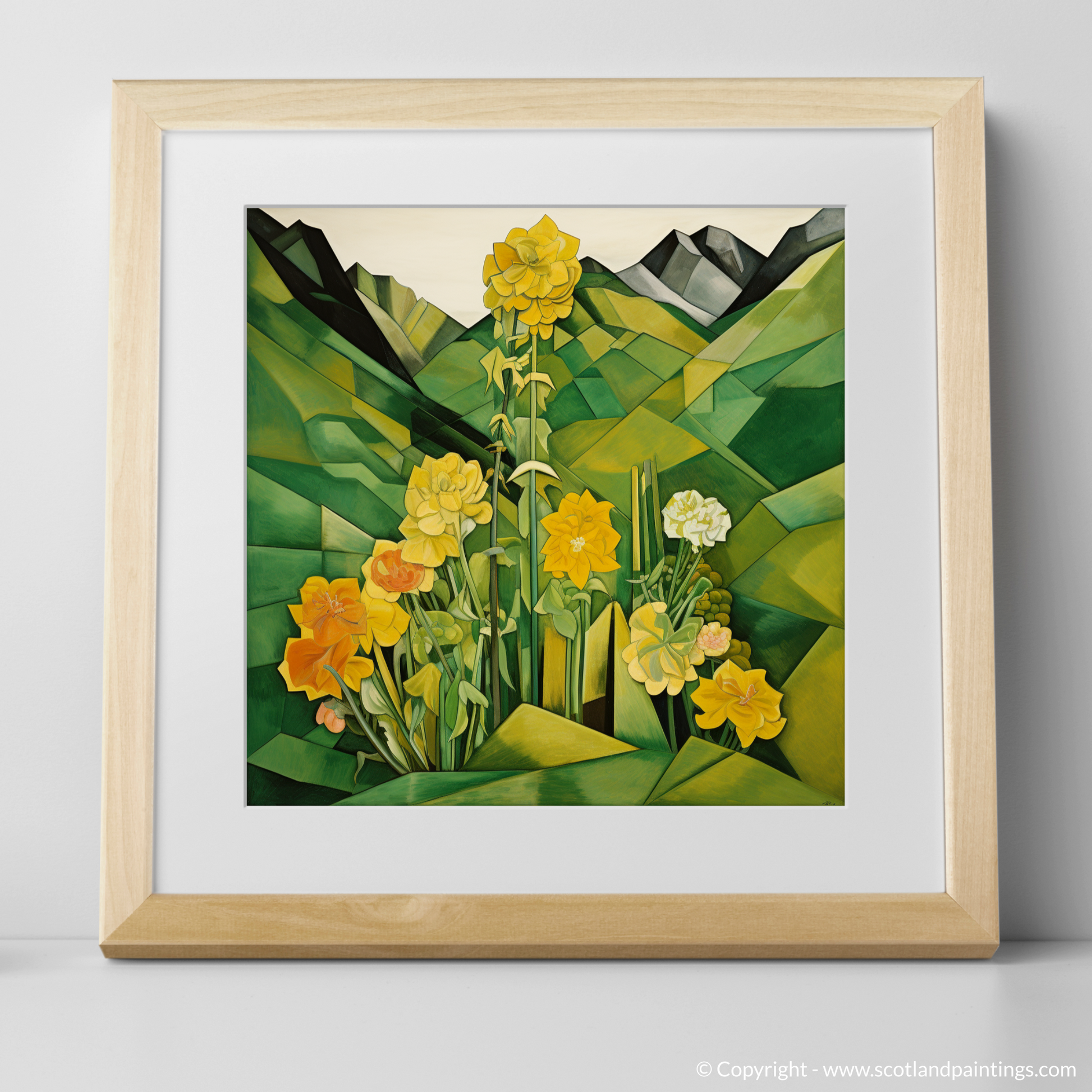 The eye is drawn to a palette dominated by varying shades of vibrant greens and bold yellows, reflecting the verdancy of the Scottish highlands and the subtle hues of the wildflowers that grace its slopes. Angular forms evoke the rough textures of mountain rock and the intricate structure of the Alpine lady's-mantle's leaves, which are meticulously portrayed with crisp edges and sharp contrasts, encapsulating the essence of Cubism.
