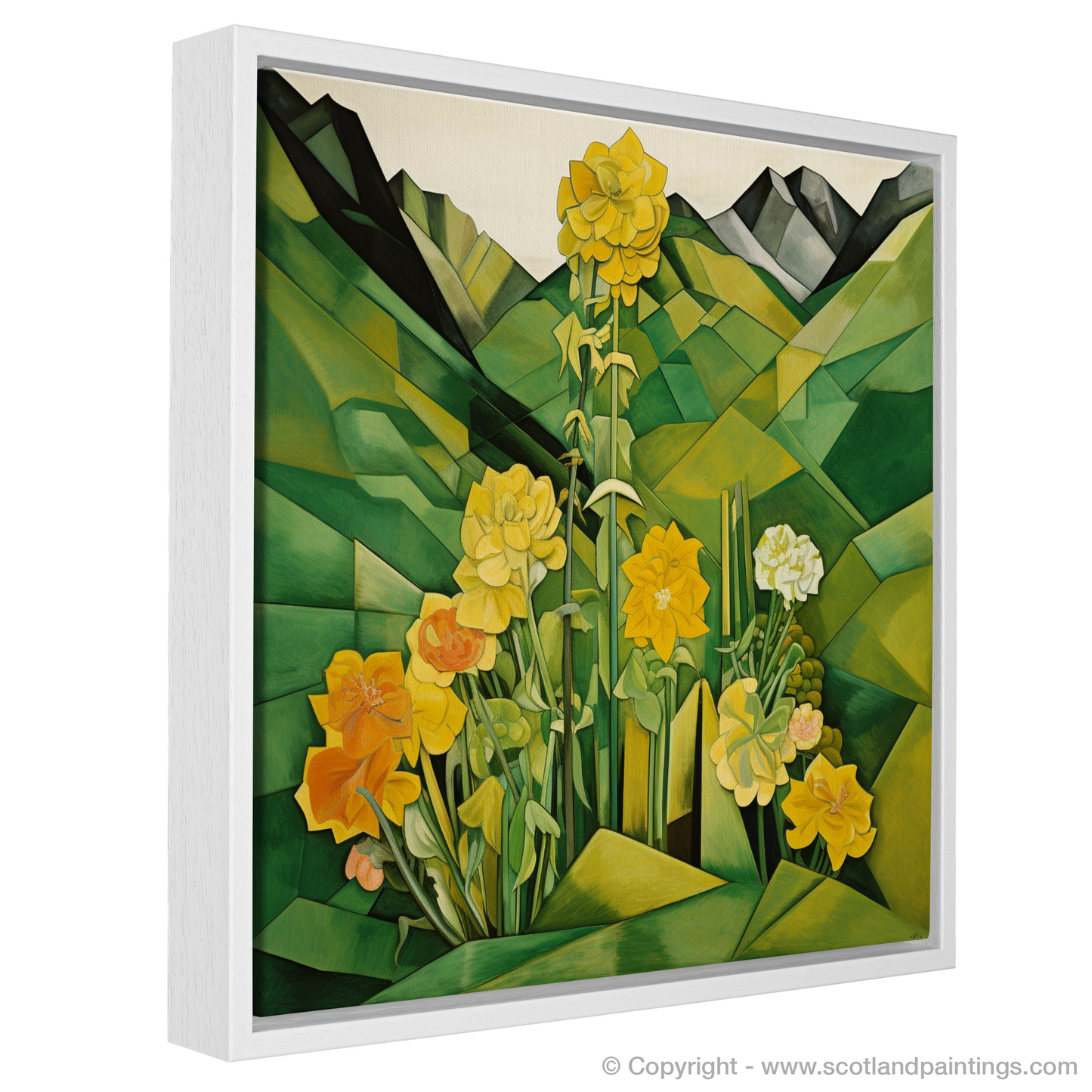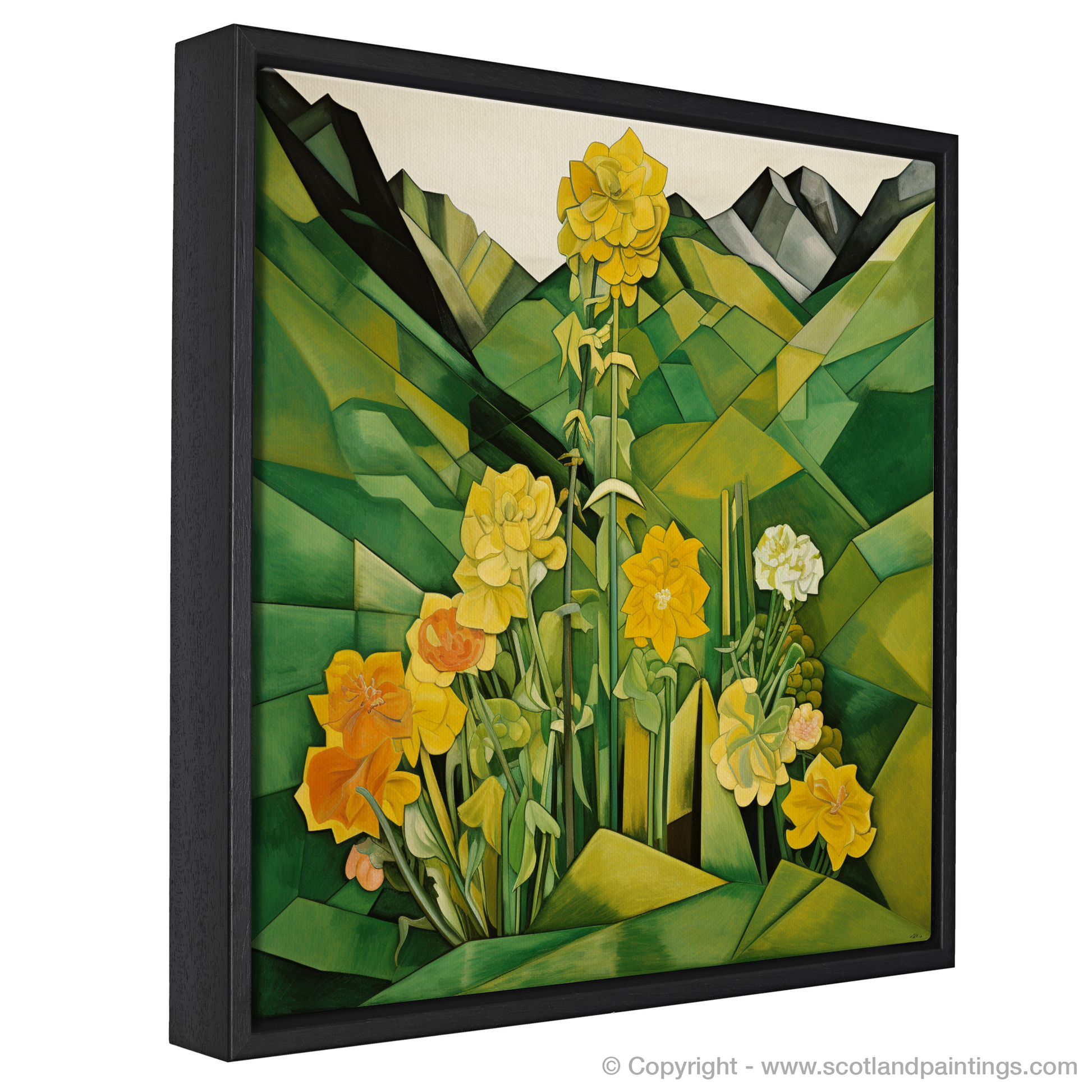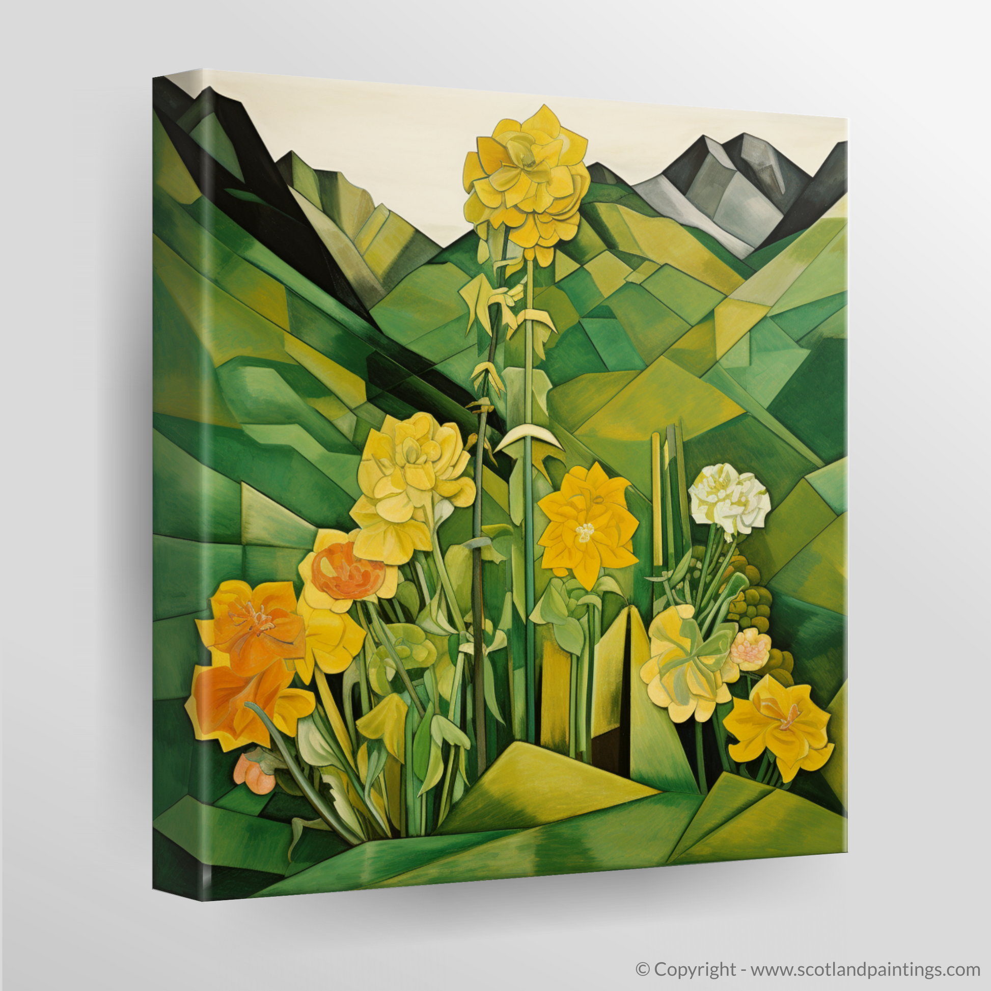 The eye is drawn to a palette dominated by varying shades of vibrant greens and bold yellows, reflecting the verdancy of the Scottish highlands and the subtle hues of the wildflowers that grace its slopes. Angular forms evoke the rough textures of mountain rock and the intricate structure of the Alpine lady's-mantle's leaves, which are meticulously portrayed with crisp edges and sharp contrasts, encapsulating the essence of Cubism.