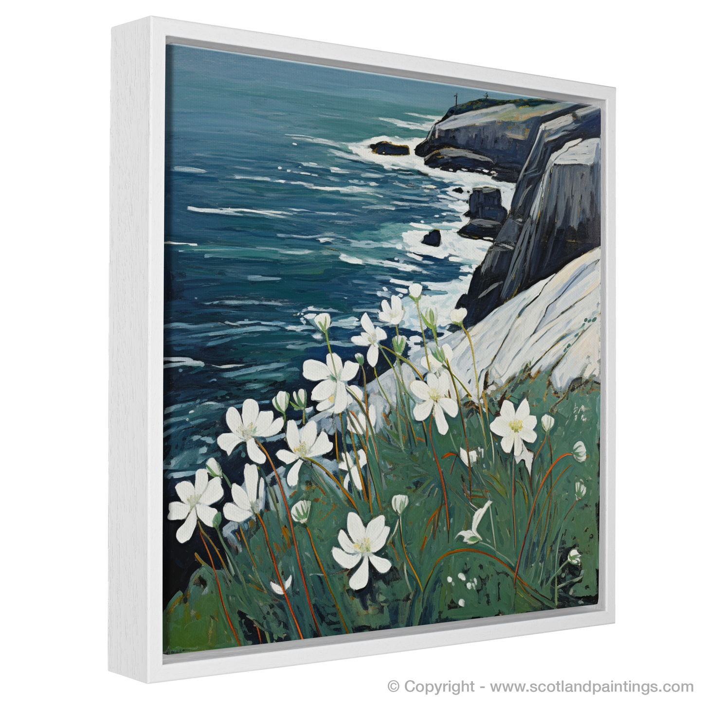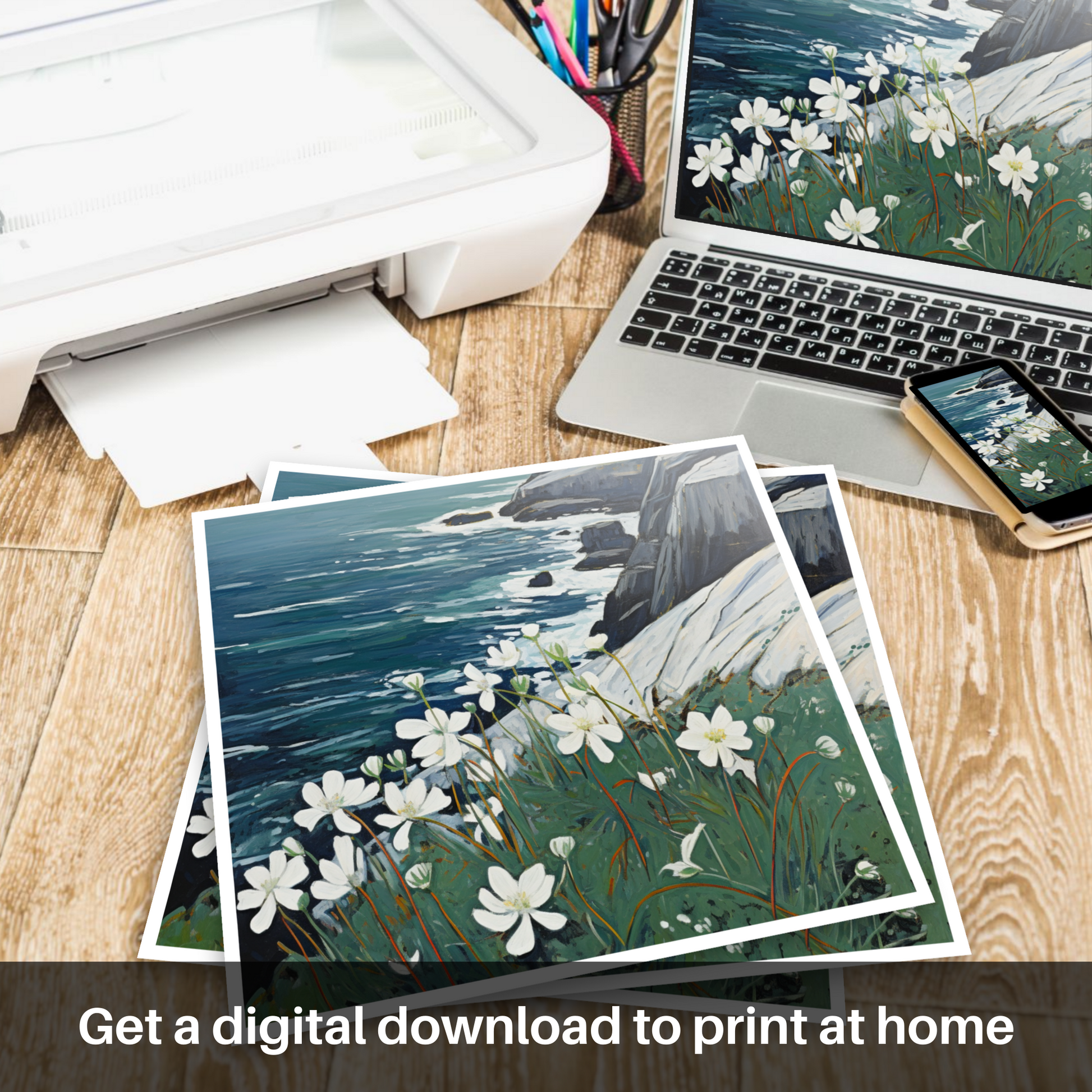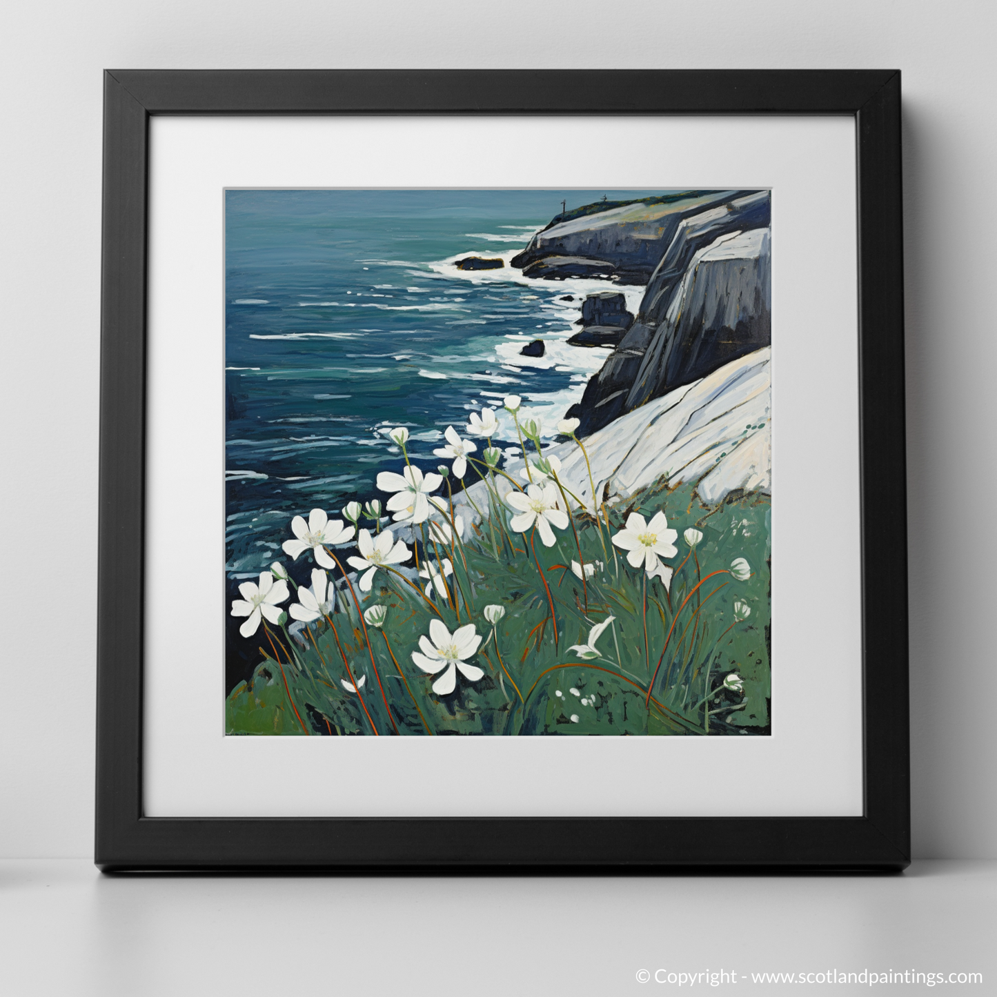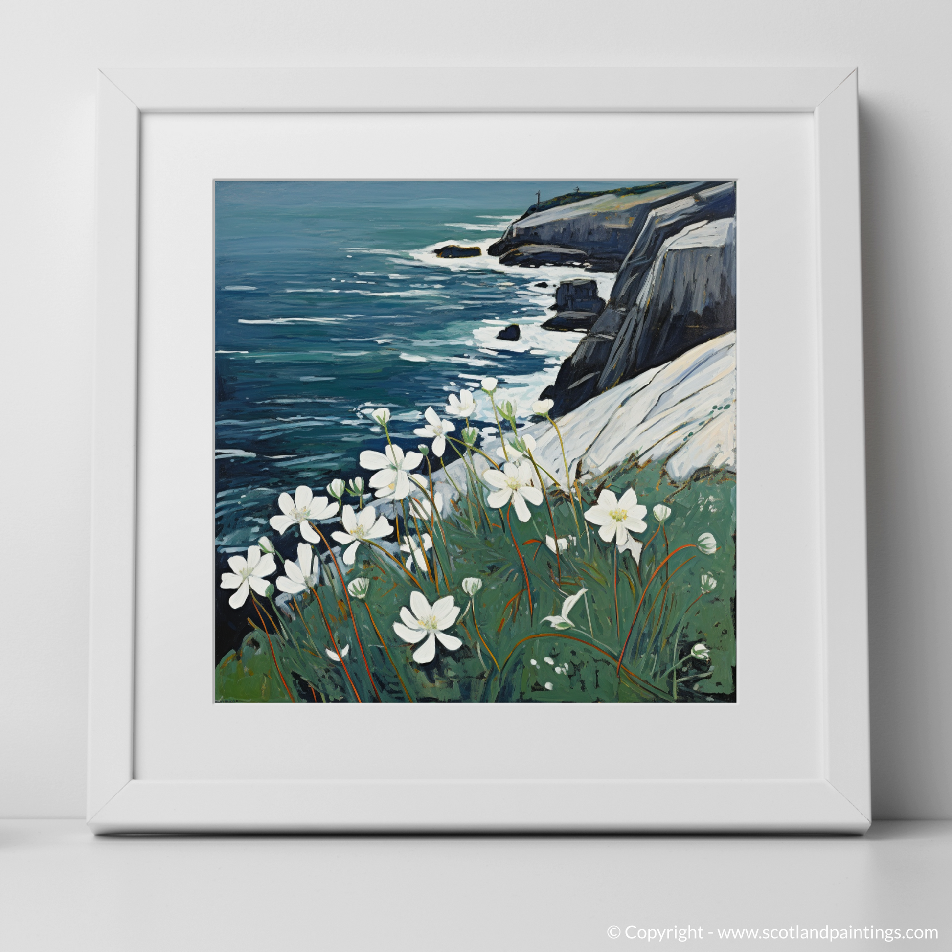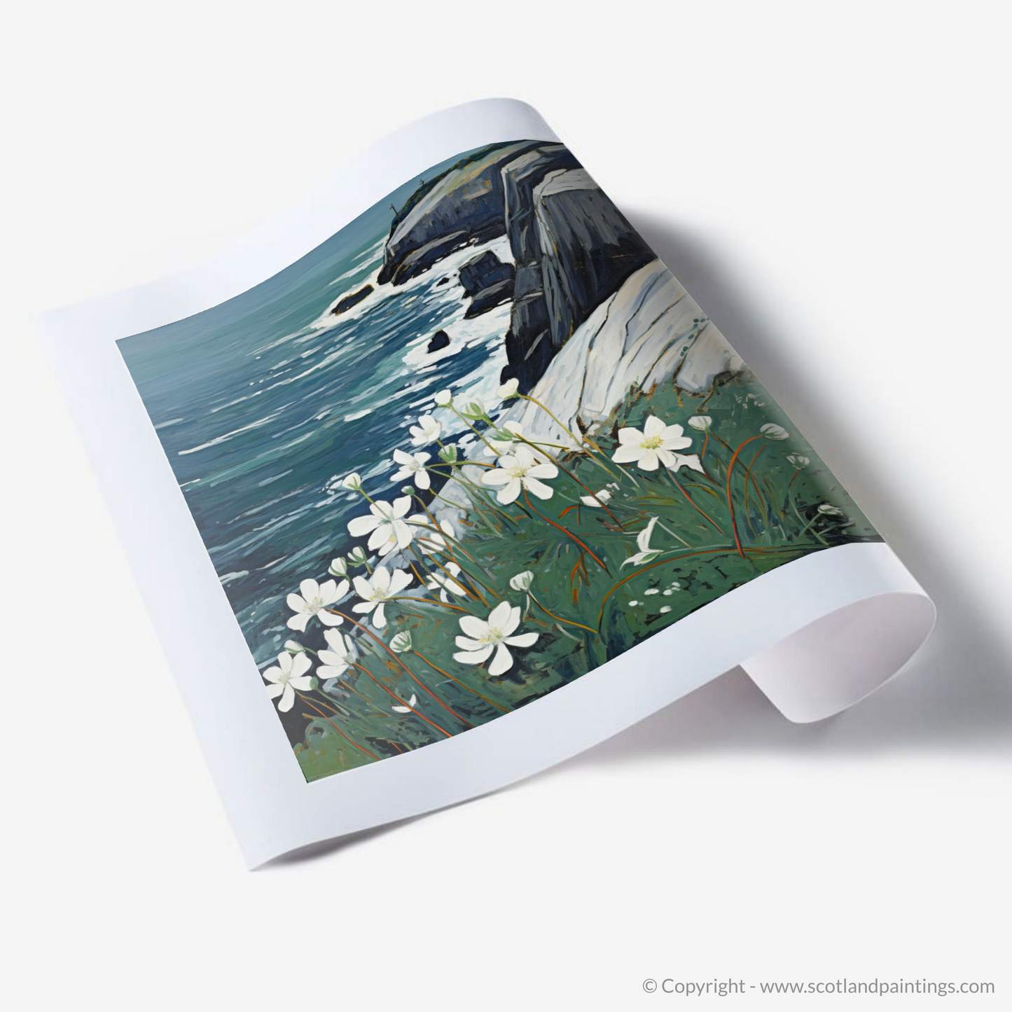 Immerse yourself in the captivating charm of Scotland's coastal beauty with this enchanting piece. The print features a lively display of Sea campion blossoms cheerfully dotting the rugged cliffs of Cape Wrath. Rendered in a Naive Art style, the artwork exudes a pure sense of wonder and simplicity, inviting viewers to a world crafted from bold colours and childlike imagination.
