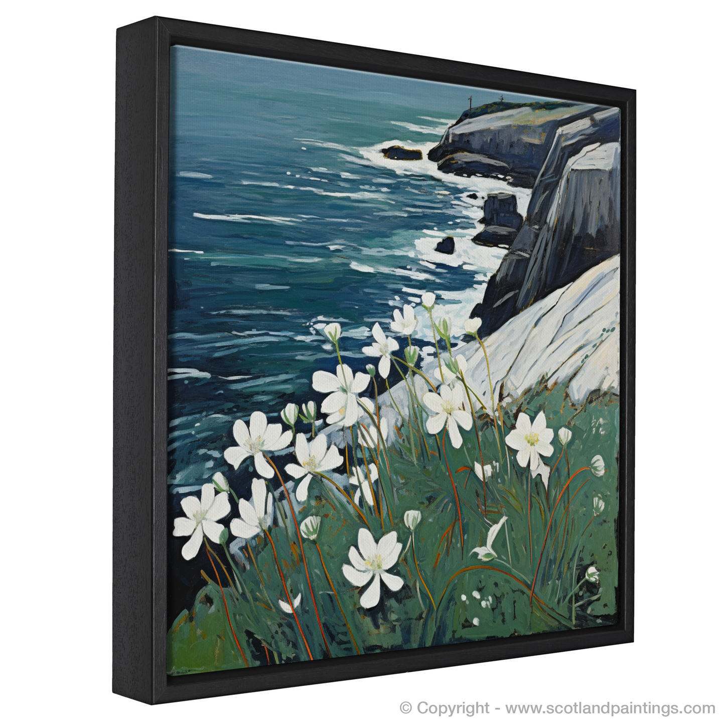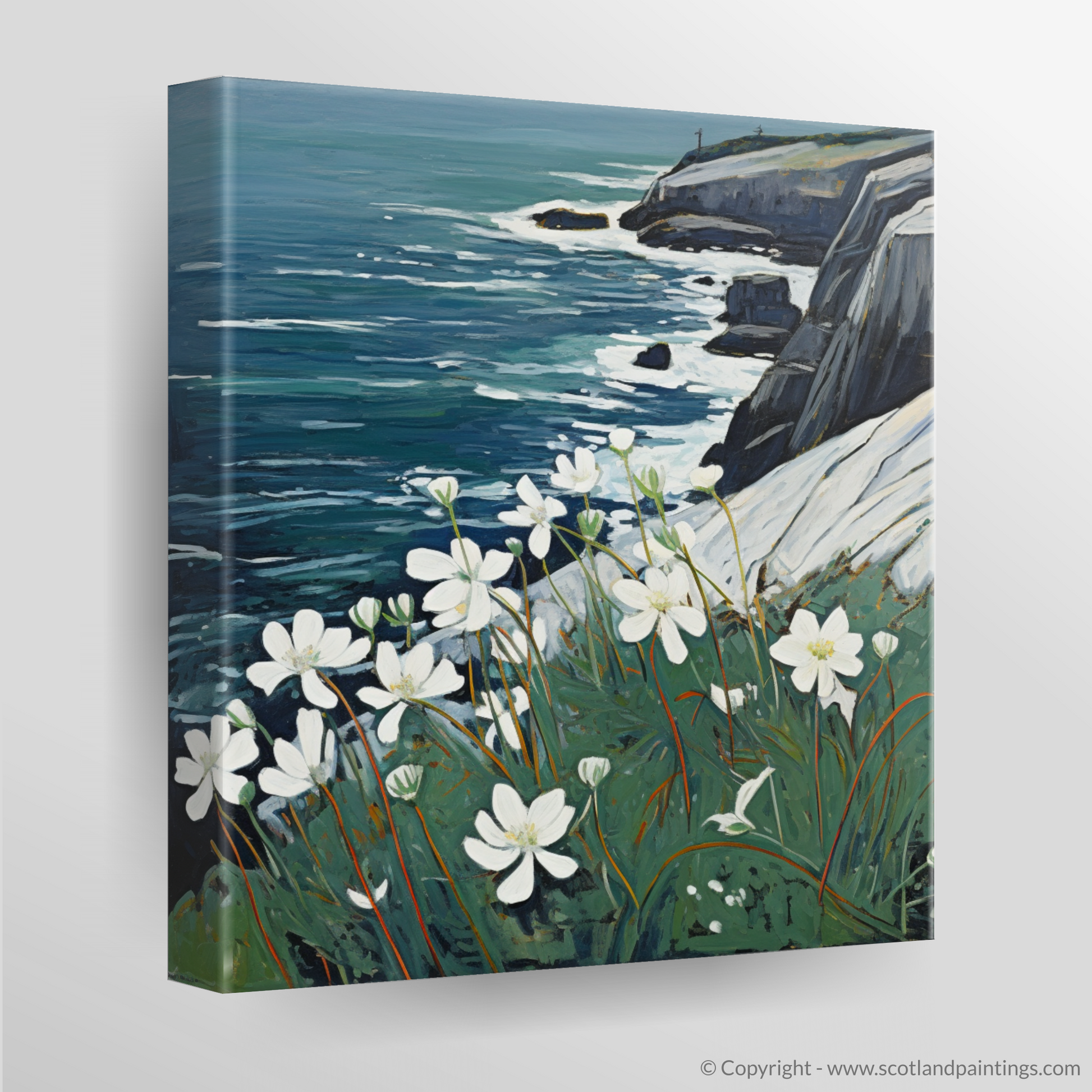 Behind these botanical gems, a geological tapestry unfurls. Layer upon layer of sheer cliffs descend into the depths of an azure sea, where white-tipped waves caress the shore. The artist's brushstrokes capture the sheer cliff faces and the geological strata with broad, confident swipes of colour that carve out the headlands and inlets. The darkened, weathered rocks spotted with patches of green vegetation are a robust testament to the timeless endurance of nature.