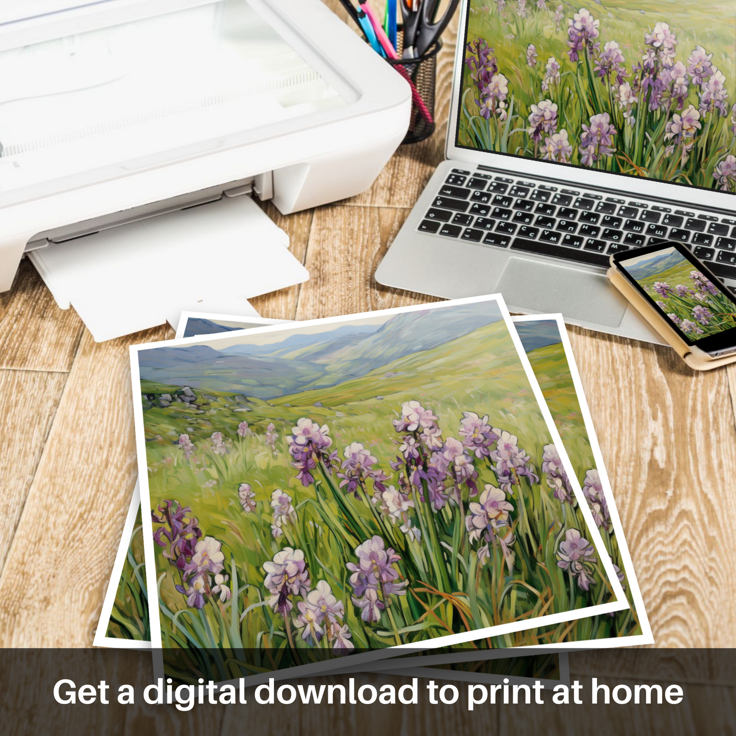 Dappled sunlight filters through the composition, casting an array of subtle shadows that play upon the petals and leaves, imbuing the scene with depth and movement. The print is a celebration of Scotland's floral majesty, an homage to the unspoilt beauty that adorns its rugged countryside.