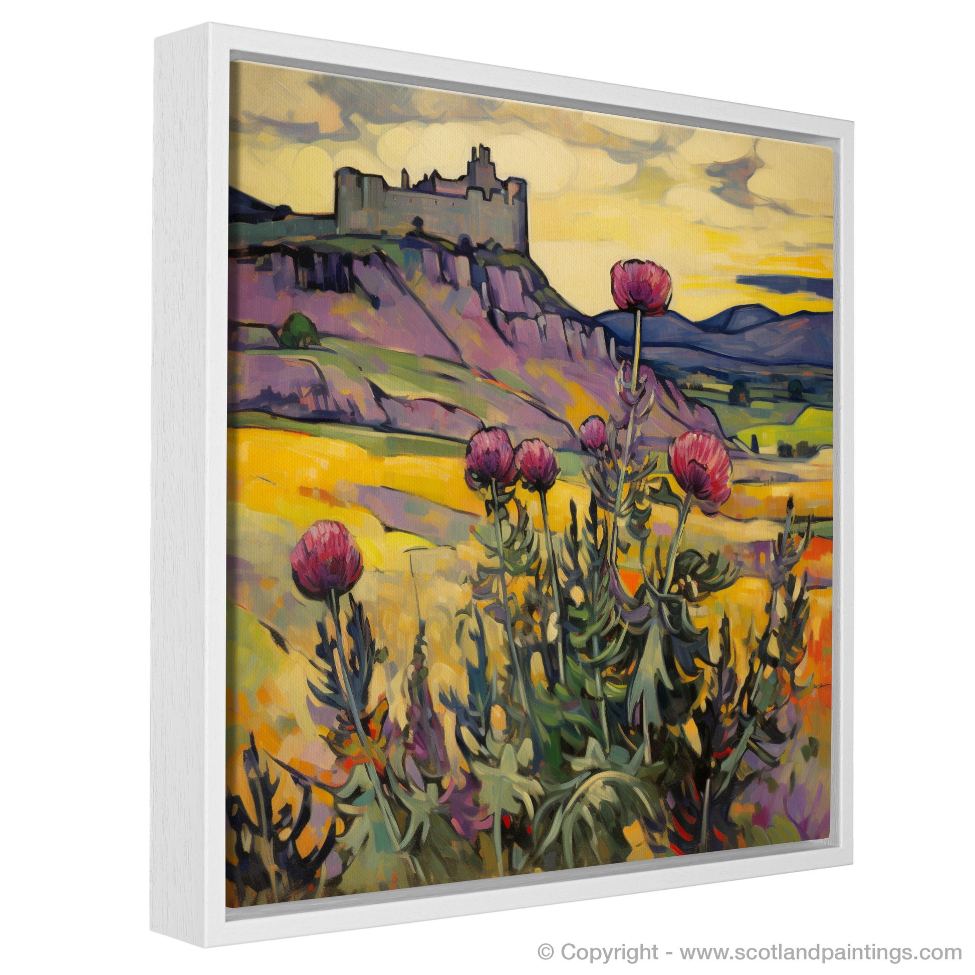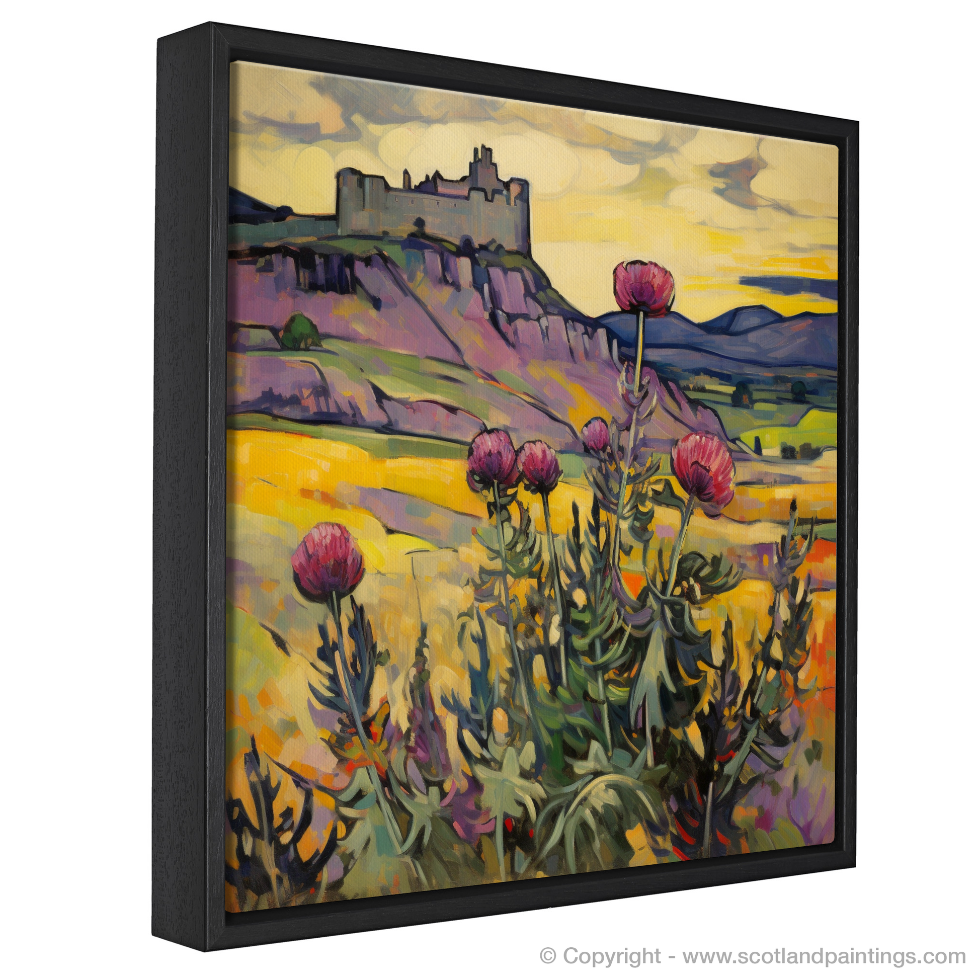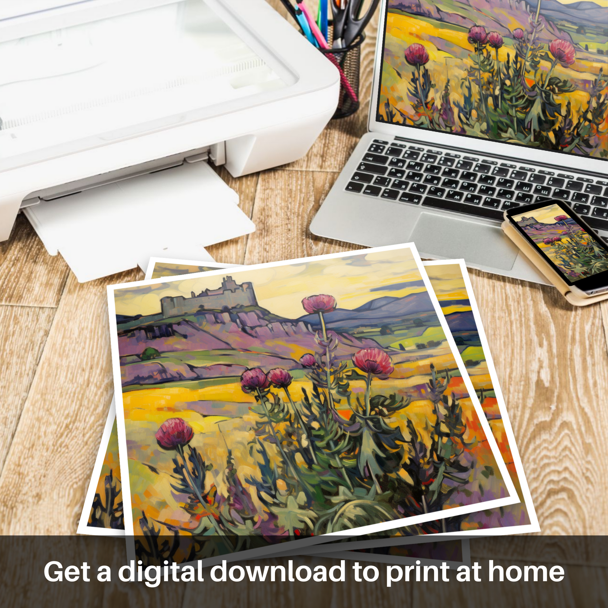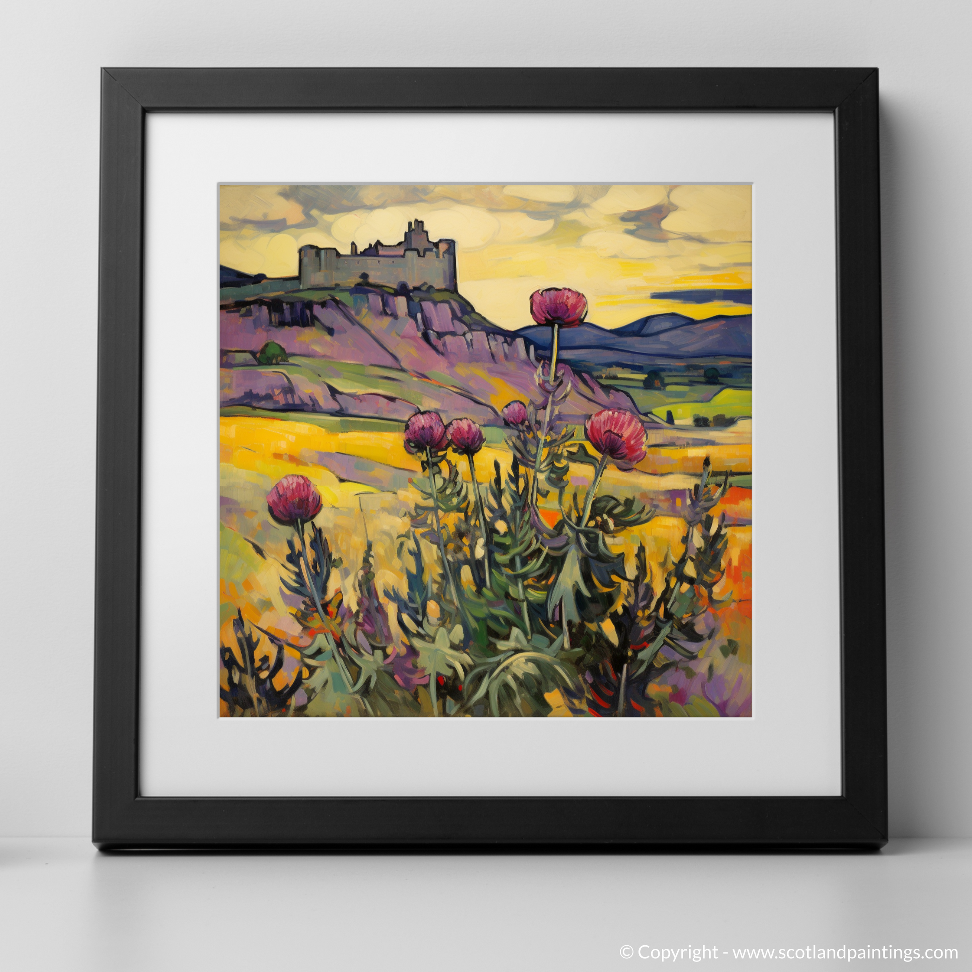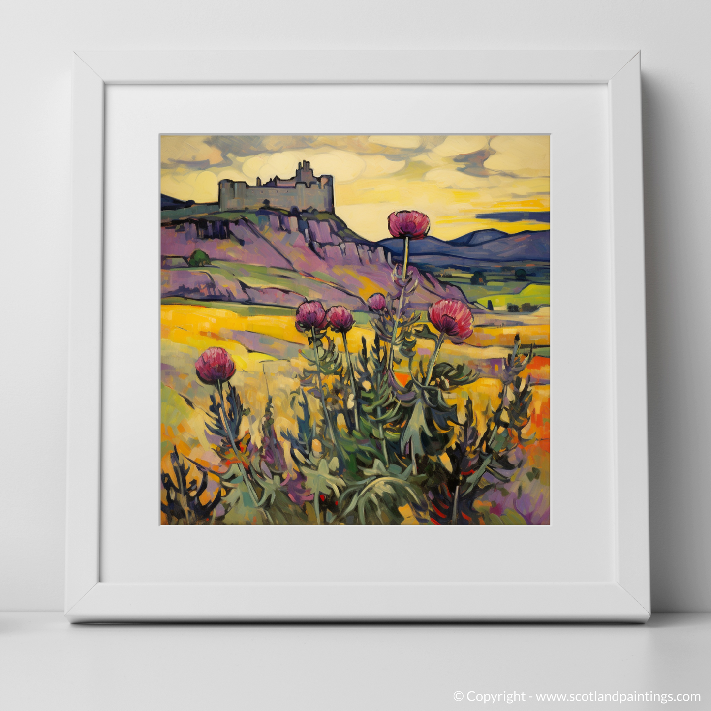 Embrace the spirited essence of Scotland's rugged landscape with this vibrant interpretation, where the wild thistle blooms undaunted, swaying gently in the Highland breeze. The heart of Scotland's flora comes alive against the historic backdrop of the majestic Stirling Castle perched atop a craggy hill. The scene is drenched in the rich, bold hues characteristic of the Fauvist movement, celebrating colour as an emotional force.