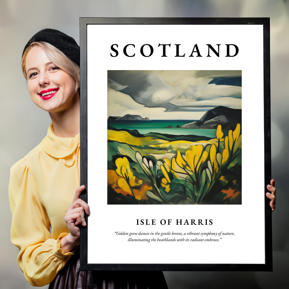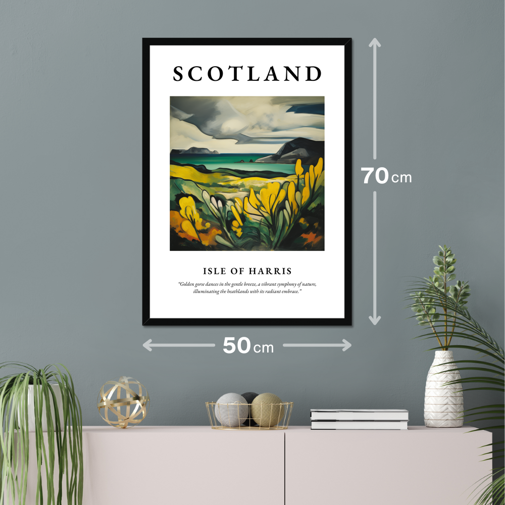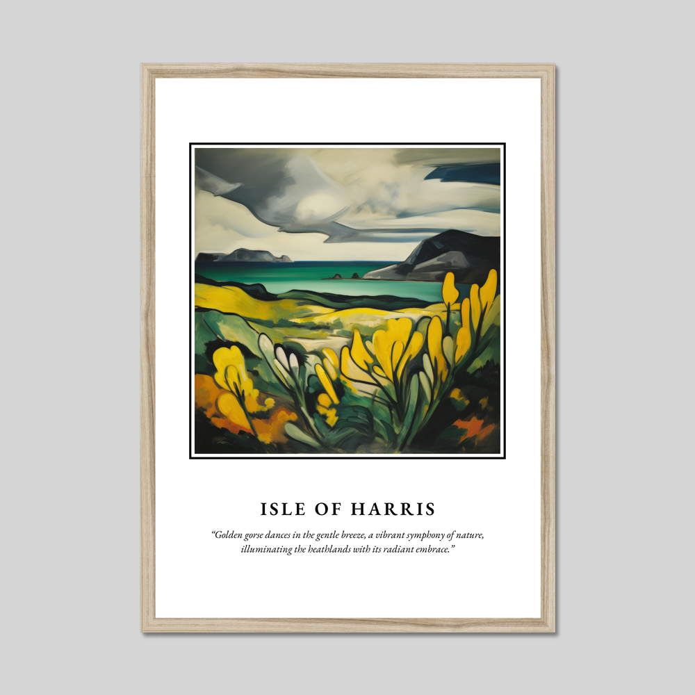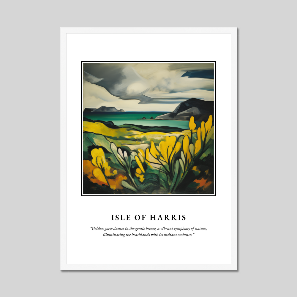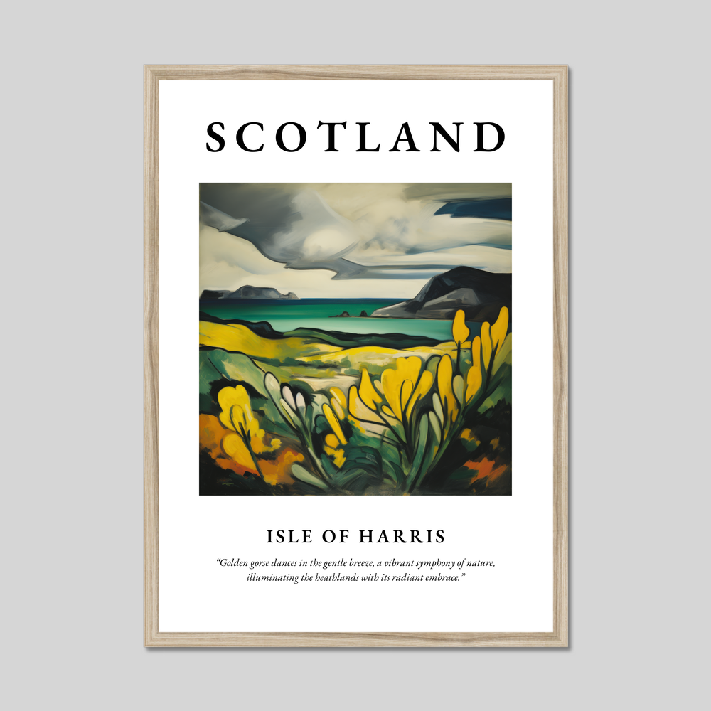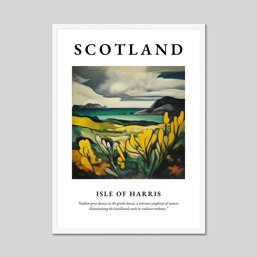 Embrace the enchanting allure of Scotland with this stunning 50cm x 70cm framed poster print, bringing a touch of the wild Hebrides into your home. Captured in an abstract style, the heart of the print features an evocative painting of the Isle of Harris, where swirling forms and vibrant hues conjure the island’s dramatic landscapes. Above the painting, the word “SCOTLAND” stands bold and proud, a tribute to this beguiling land. Beneath, the poignant quote – “Golden gorse dances in the gentle breeze, a vibrant symphony of nature, illuminating the heathlands with its radiant embrace” – adds an extra layer of poetic beauty to the composition.