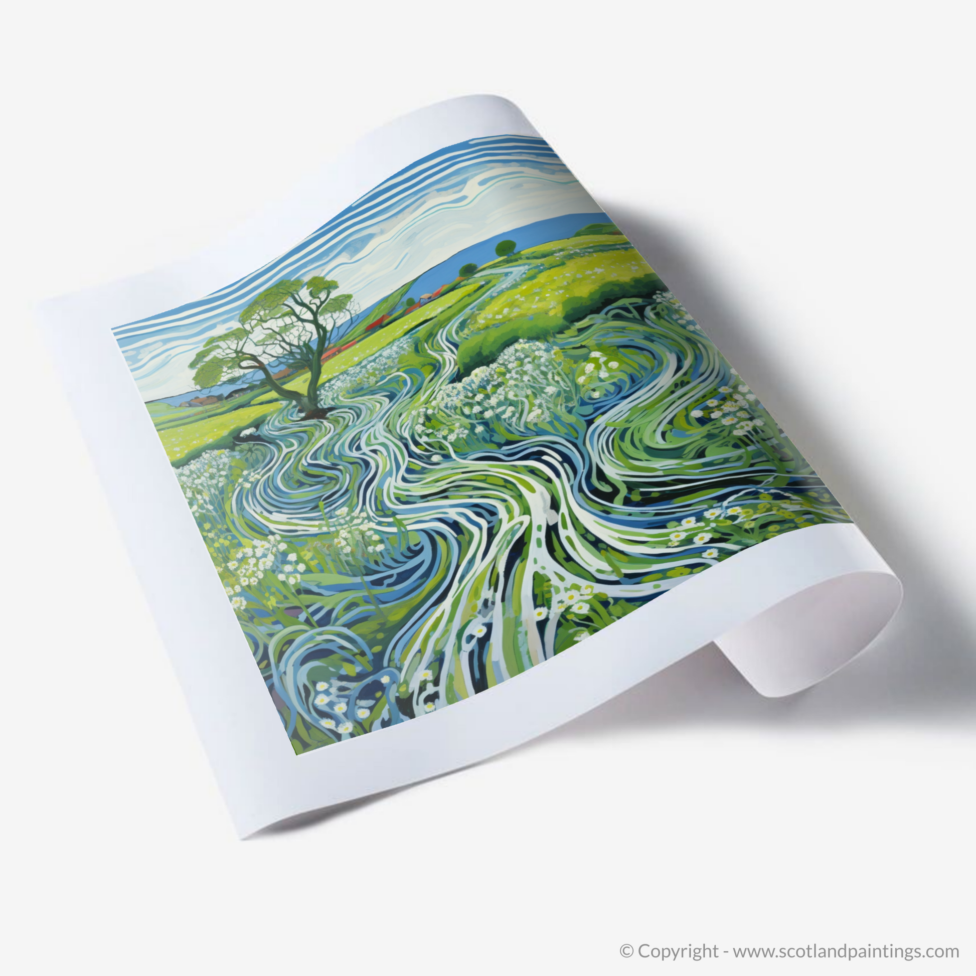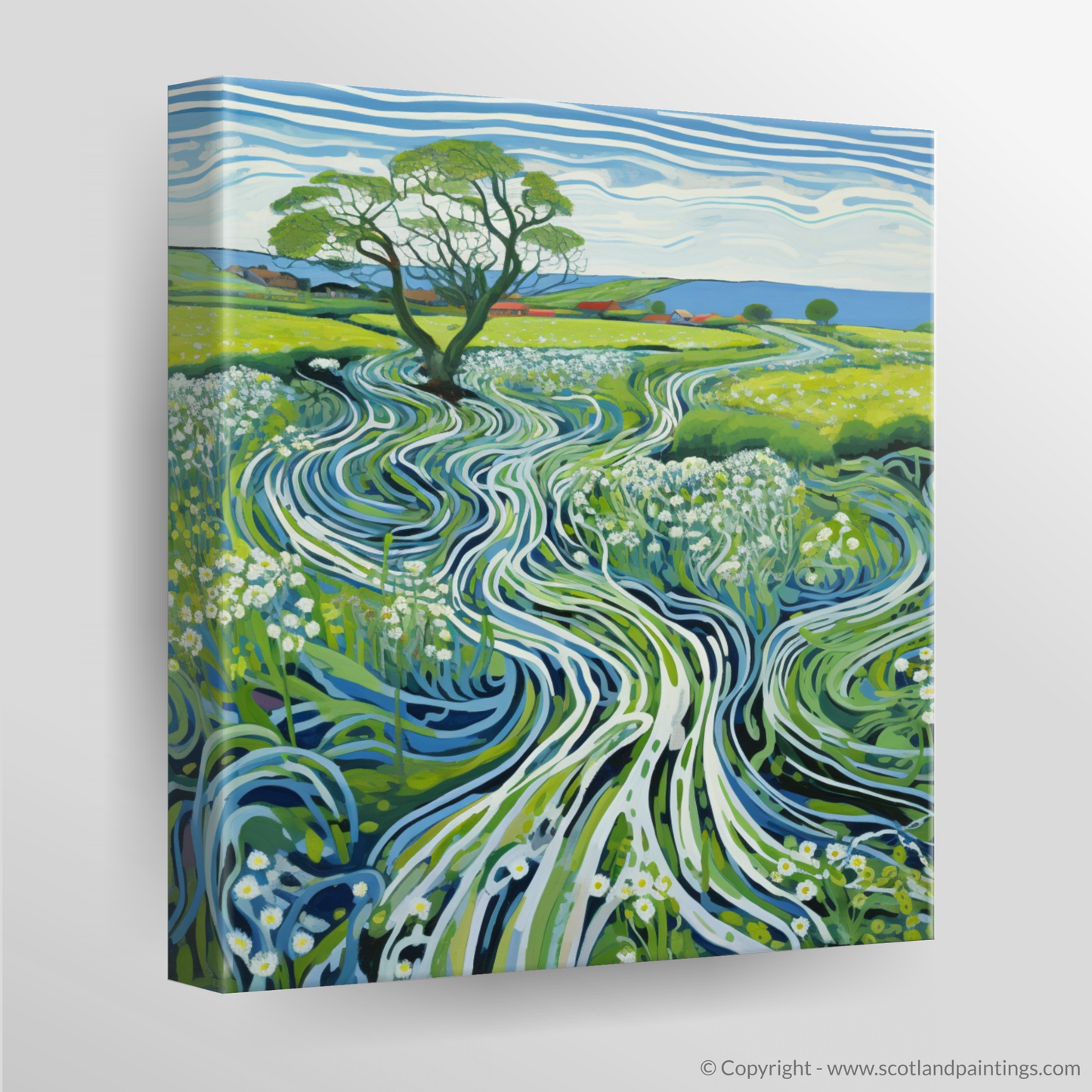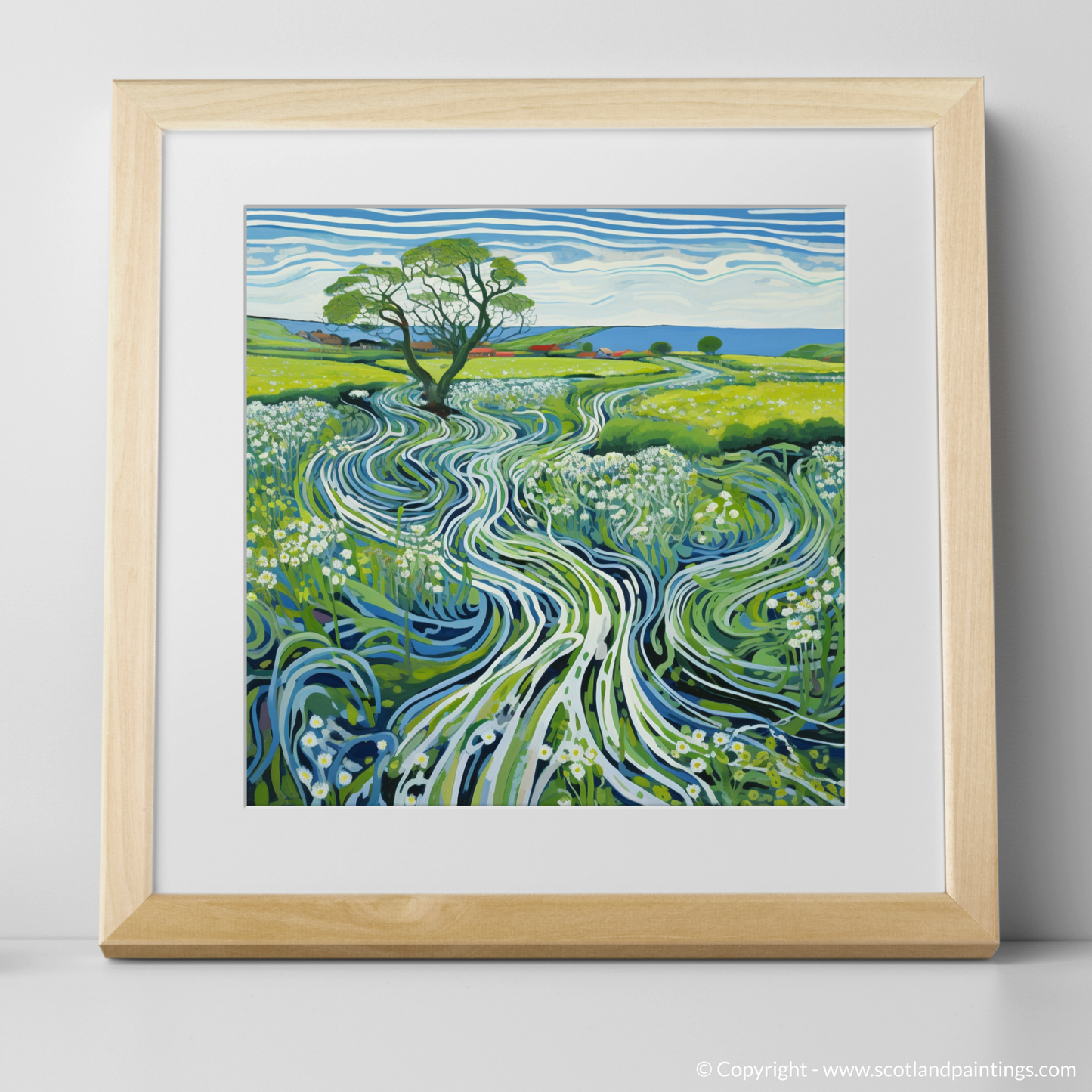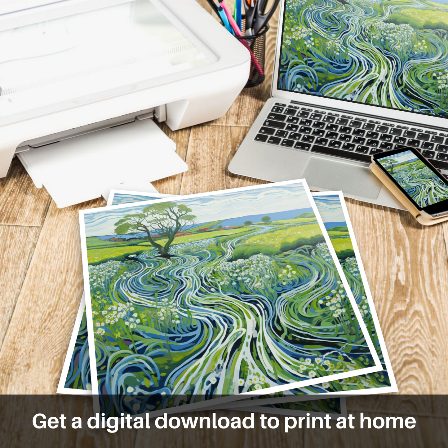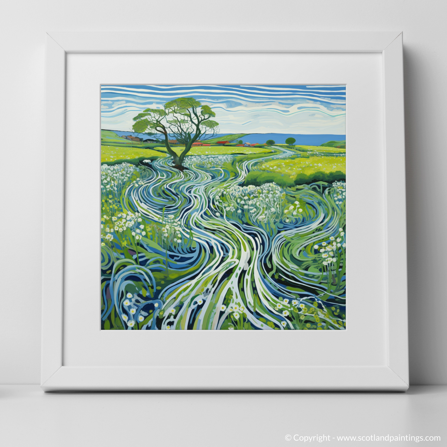 Capturing the dynamic essence of the Isle of Cumbrae's coastal landscape, this vibrant print brings the spirited character of Sea wormwood to life through a captivating Pop Art lens. Swirls of bold azure, teal, and navy mimic the meandering saltmarsh channels, leading the eye through a luxuriant tapestry of vivid green tones. Splashes of white and yellow suggest thriving clusters of wormwood flowers and other salt-tolerant flora, providing a stark yet harmonious contrast against the rhythmic blue patterns that evoke the movement of water.