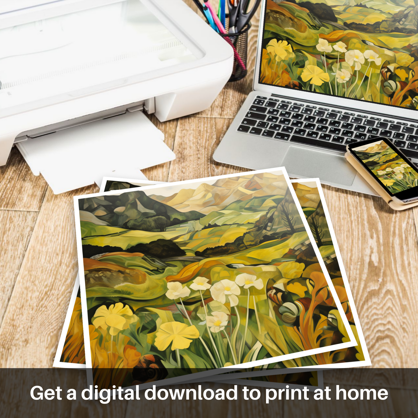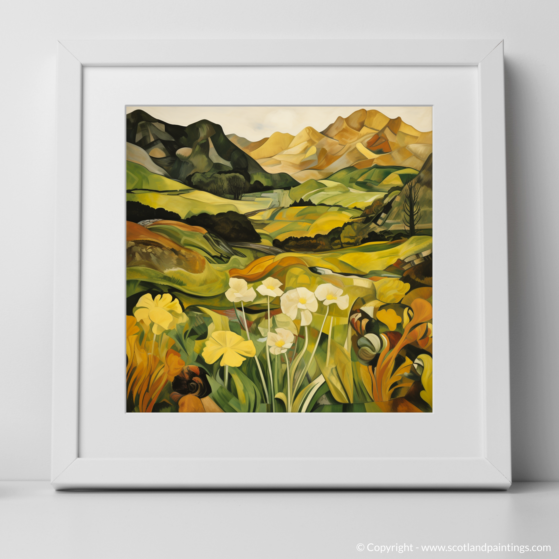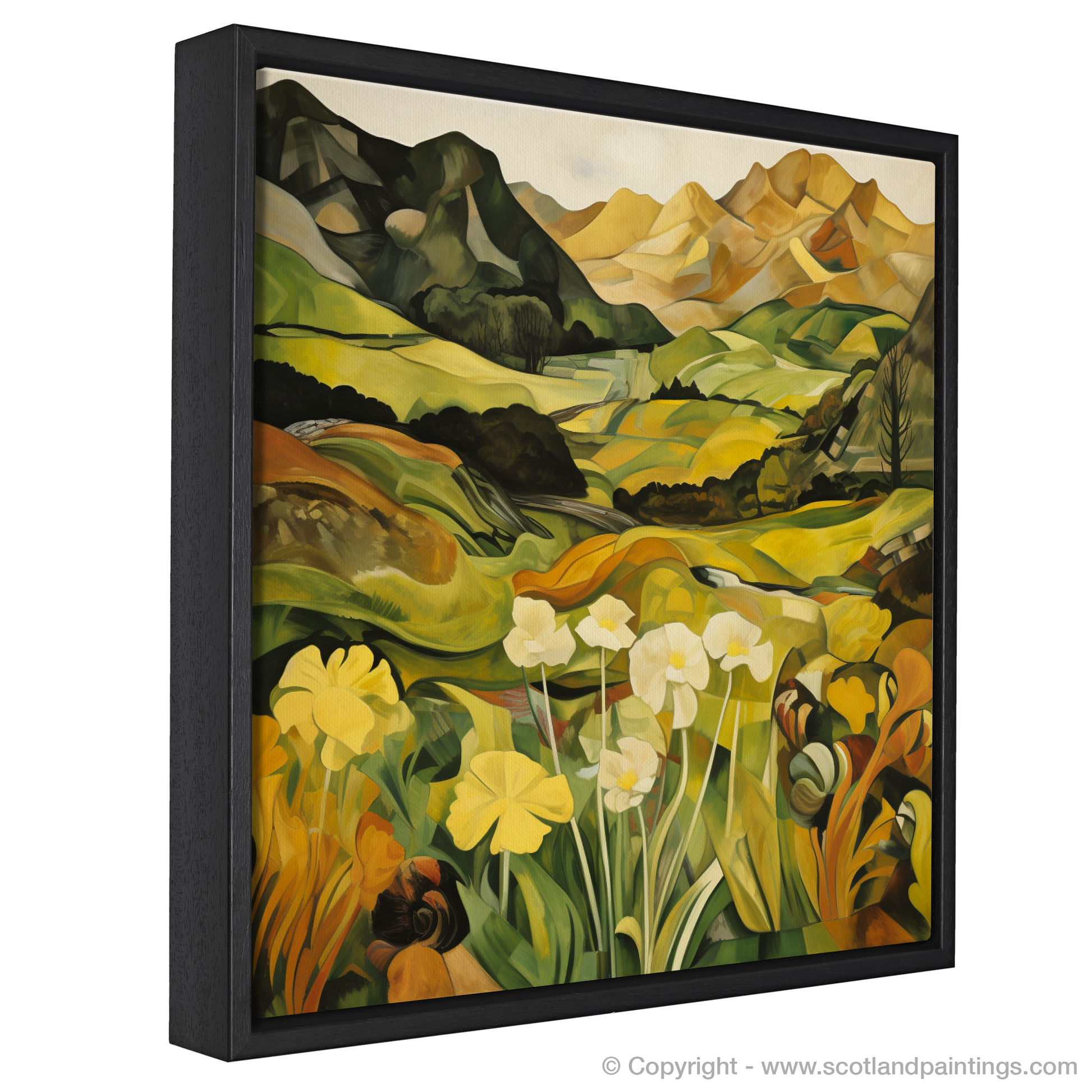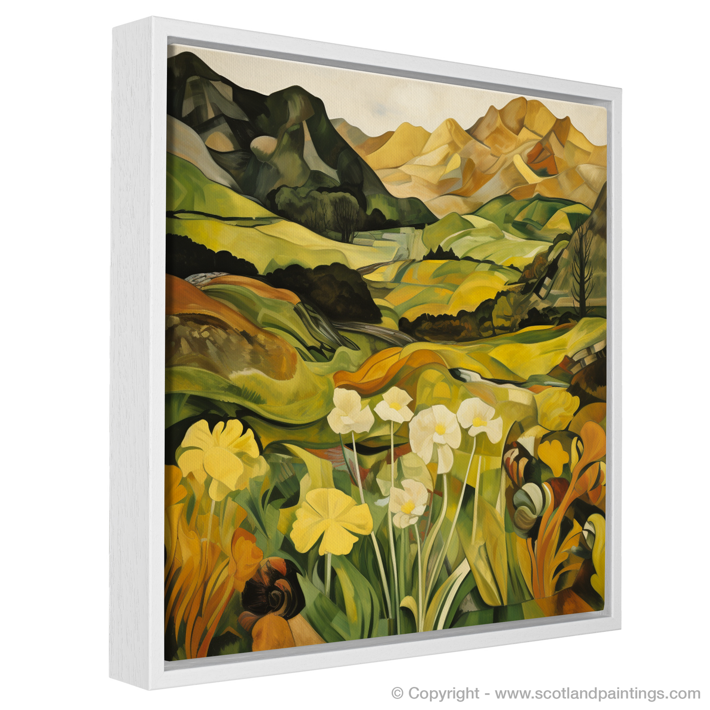 The angular dynamism of Cubism breathes new life into the landscape, fracturing the Glenfinnan vista into bold shapes and planes. Mountains rise in the distance as an arrangement of geometric forms, their peaks softening into the warm, golden tones that hint at the setting sun. Rolling hills and valleys, depicted in a kaleidoscope of greens and yellows, offer a rich tapestry of colour and form, creating a sense of depth and movement throughout the composition.