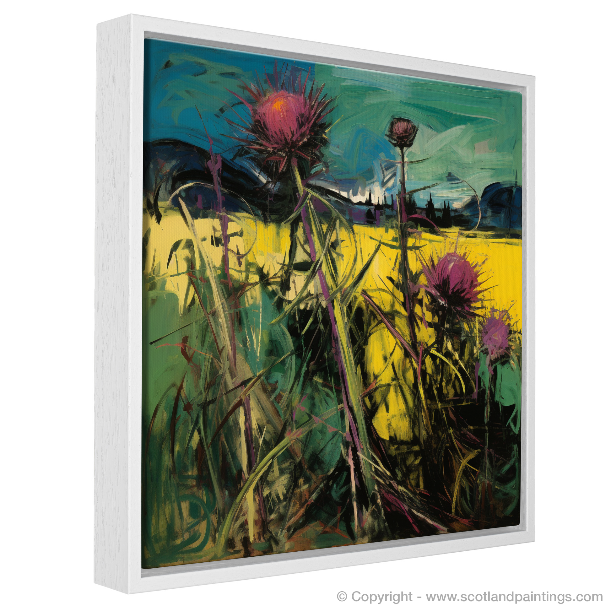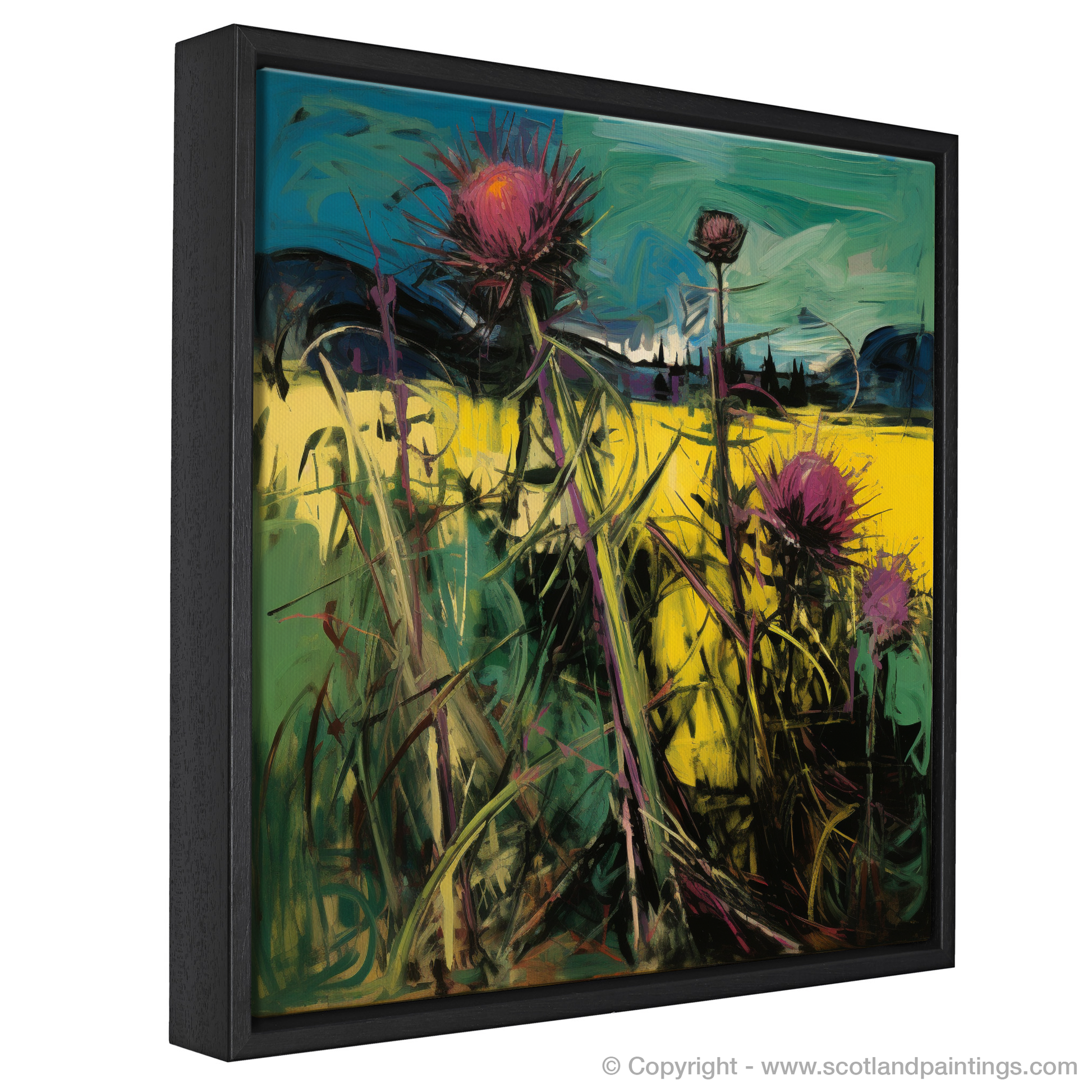 Swathes of rich, buttery yellows and deep greens dominate the composition, creating a stark contrast that mirrors the natural beauty of the Scottish countryside. The thistles themselves are rendered in passionate bursts of purple and magenta, their spiky contours dancing with life on the canvas. Each brushstroke carries a sense of spontaneity and movement, as if a gentle breeze is sweeping through the fields.