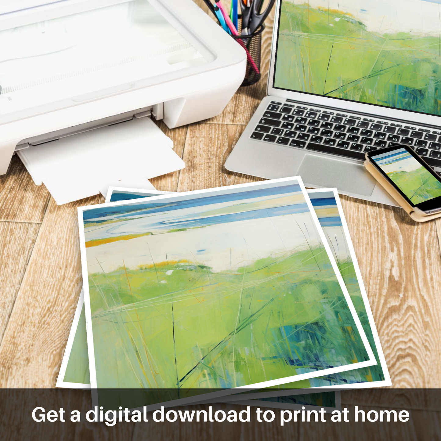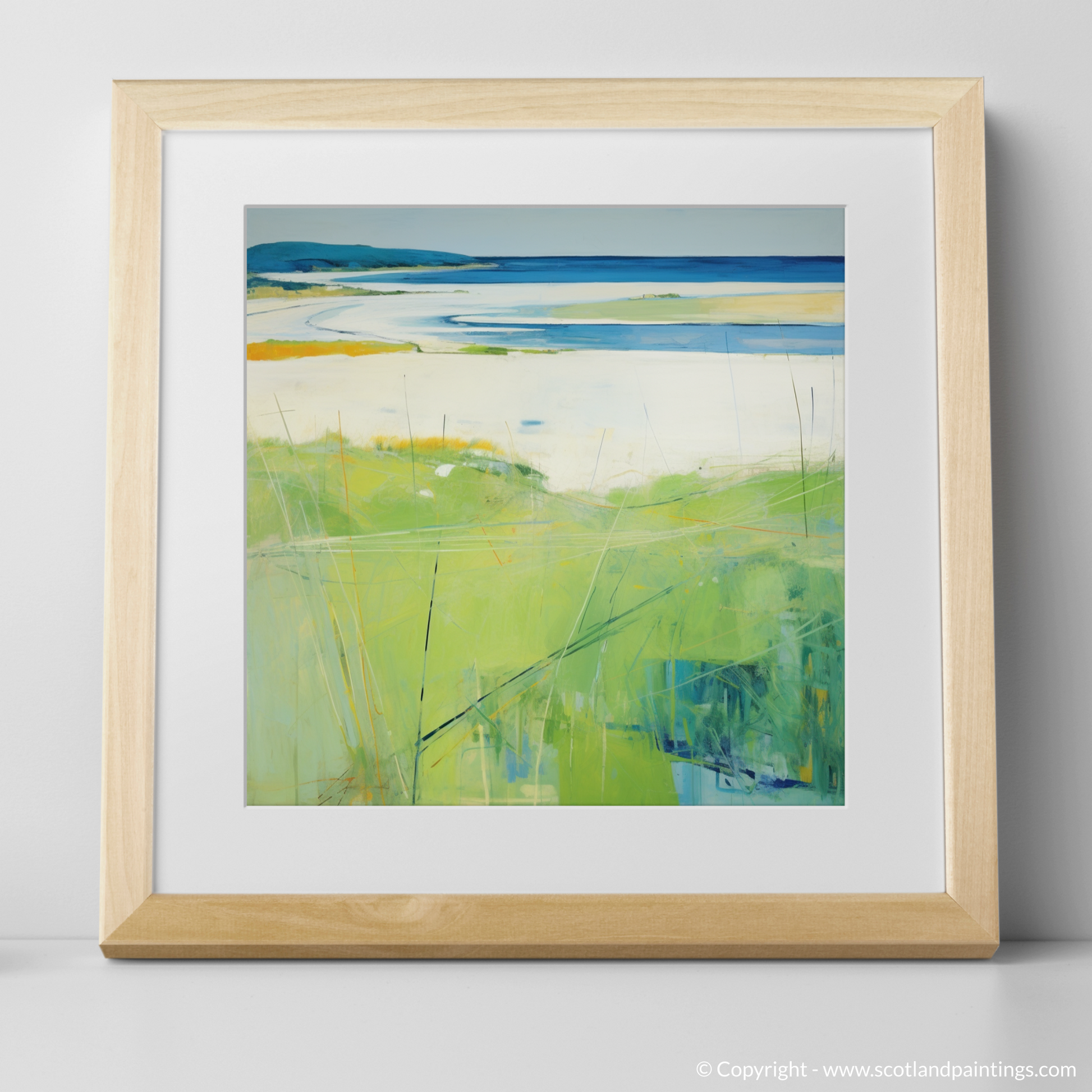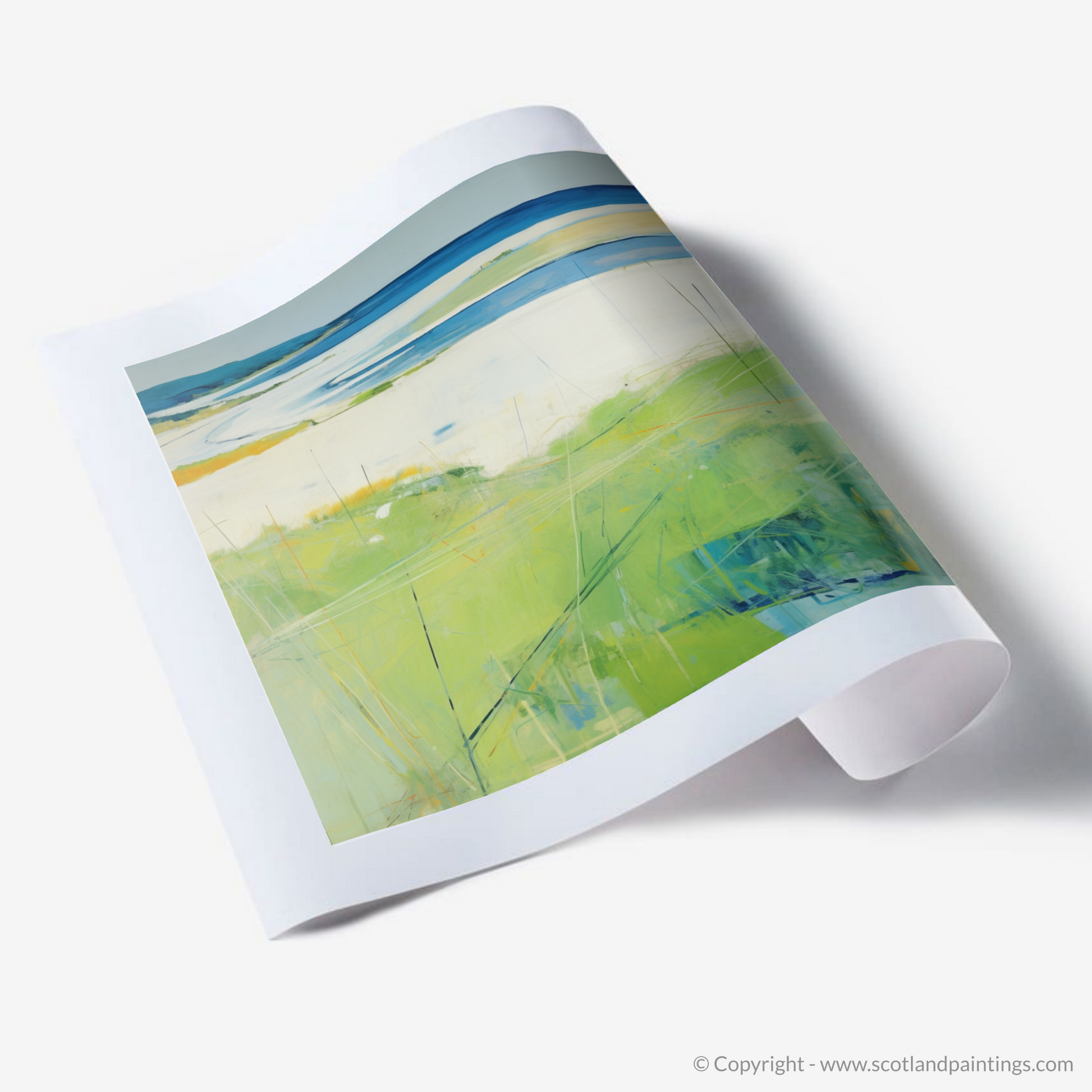 Capturing the ephemeral dance of light and shadow across the coastal dunes of Nairn Beach, this exquisite print invites you into a world where nature's beauty is abstracted into harmonious swathes of colour and form. Through a palette that marries the vibrant greens of Lyme grass with the azure of the sky and the aquamarine of serene waters, the piece evokes the refreshing breeze and tranquil spirit of the Scottish seaside.