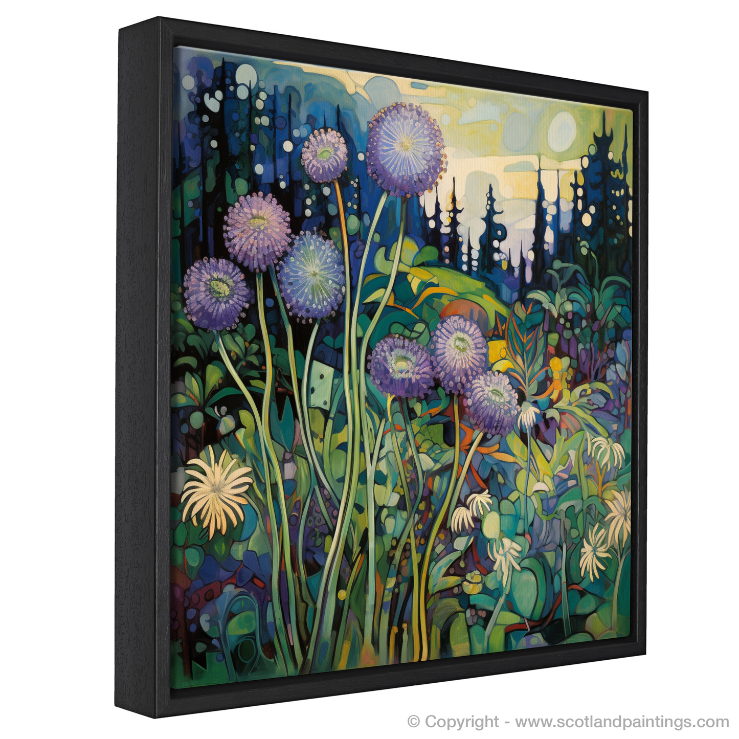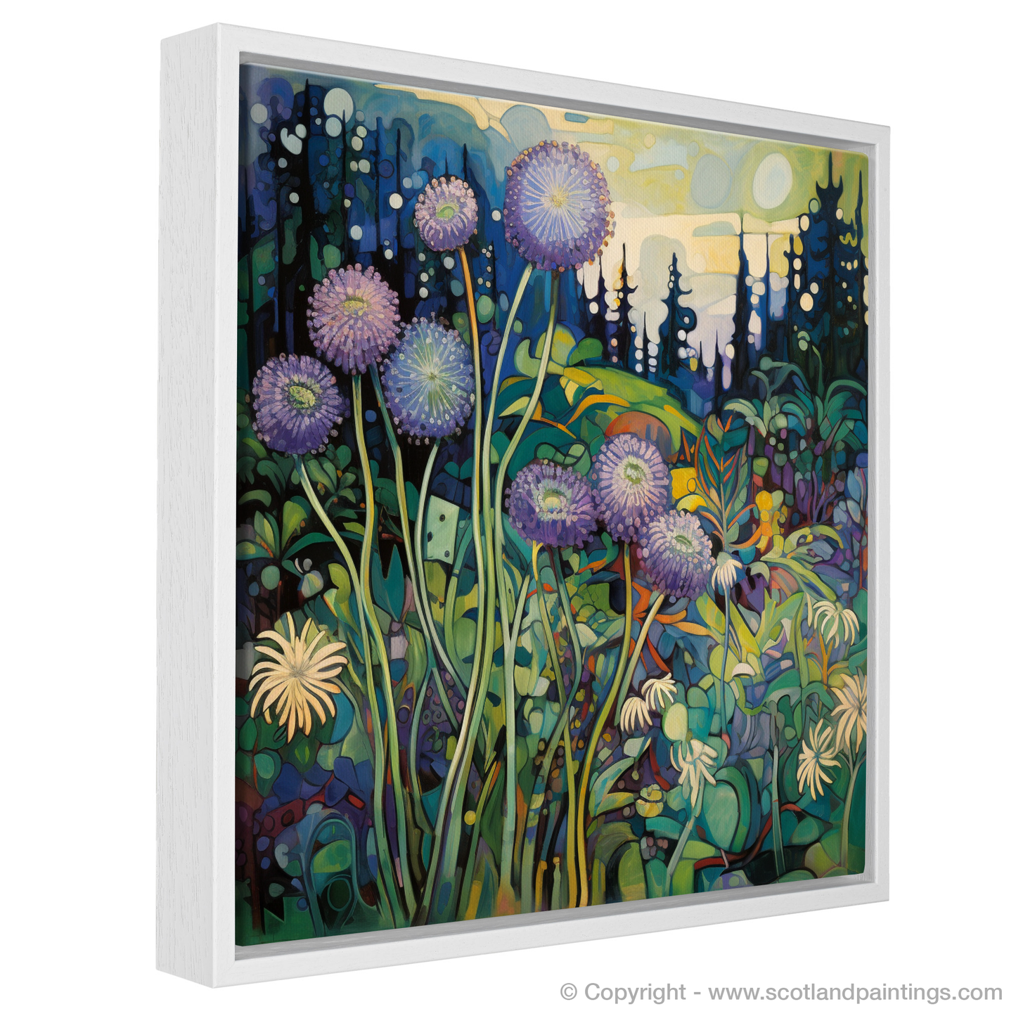 Fantastical tree silhouettes suggest the majestic presence of ancient pines in the distance, set against a dream-like sky that transitions from the golden warmth of daybreak to the tranquil coolness of twilight. As light appears to emanate from the canvas, it illuminates the flowers, casting an otherworldly glow that accentuates the depth and dimensionality of the composition.
