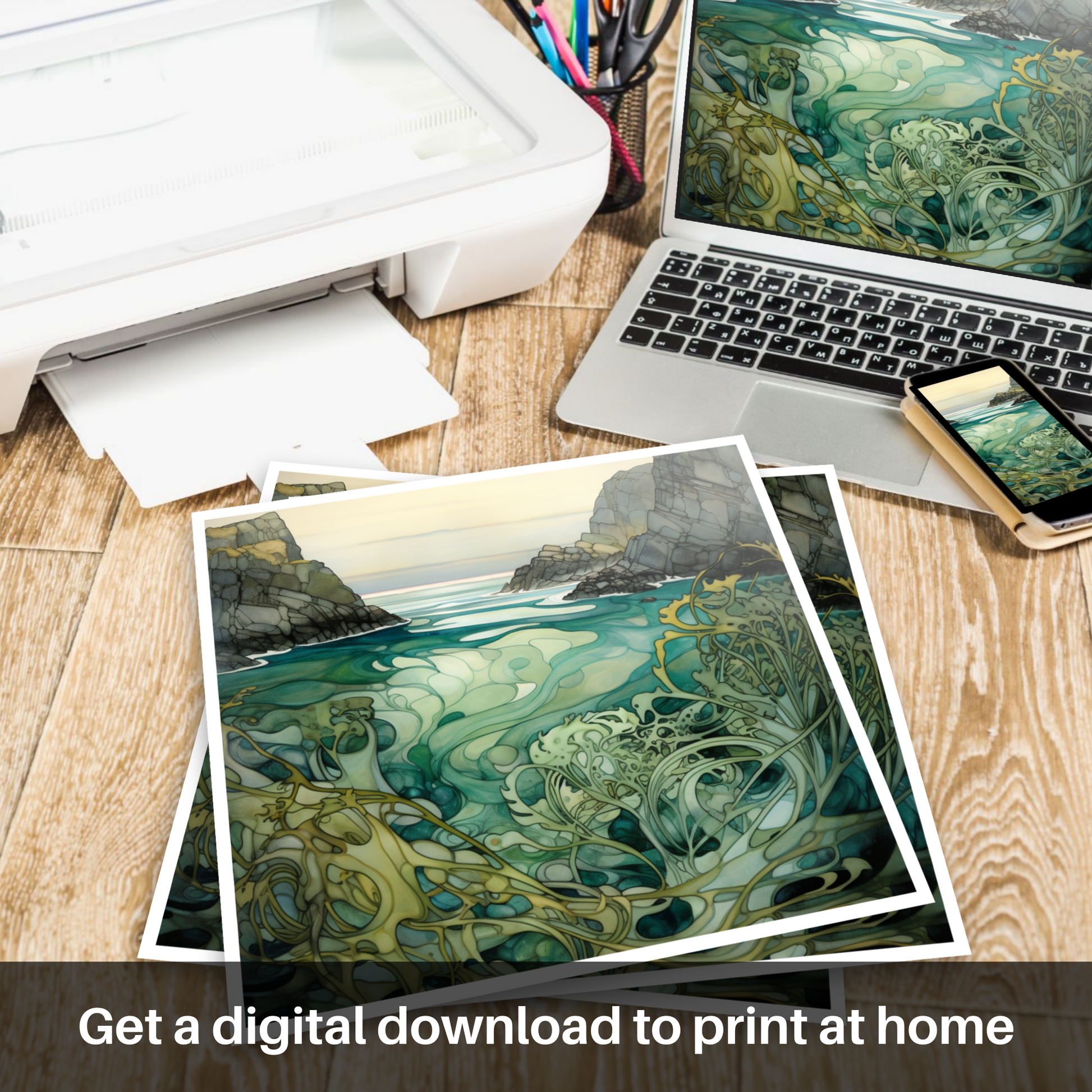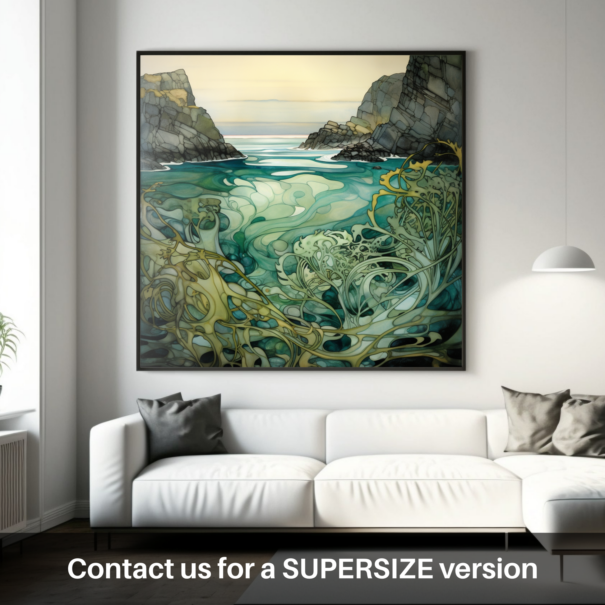 Delve into the serene beauty of the Scottish coast with this exquisite print, encapsulating the mystical charm of Achmelvich Beach's tidal zones. The piece exudes the elegance of Art Nouveau, a style renowned for its ornate lines and natural forms, which are flawlessly integrated into this depiction of Bladderwrack seaweed—a marine plant that not only thrives in the intertidal stretch but also manifests the very essence of Scotland's aquatic flora.