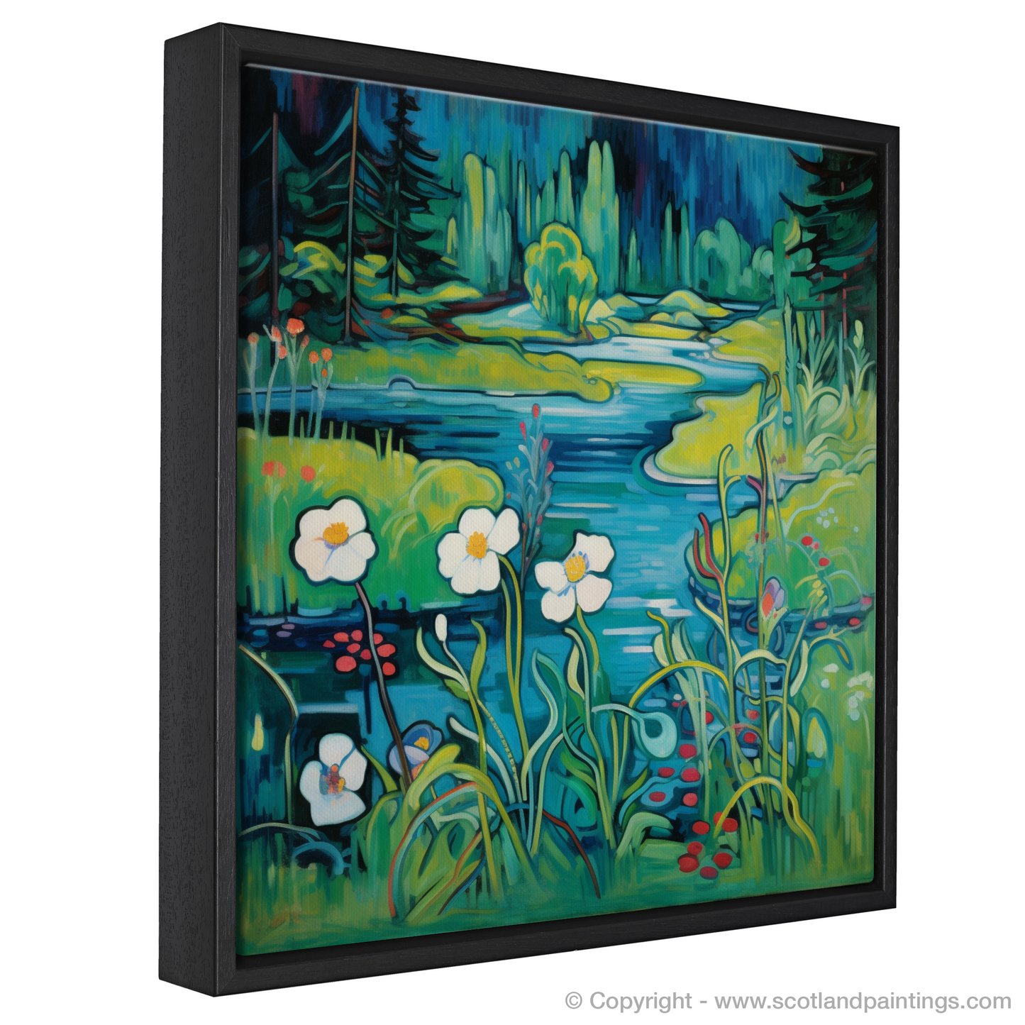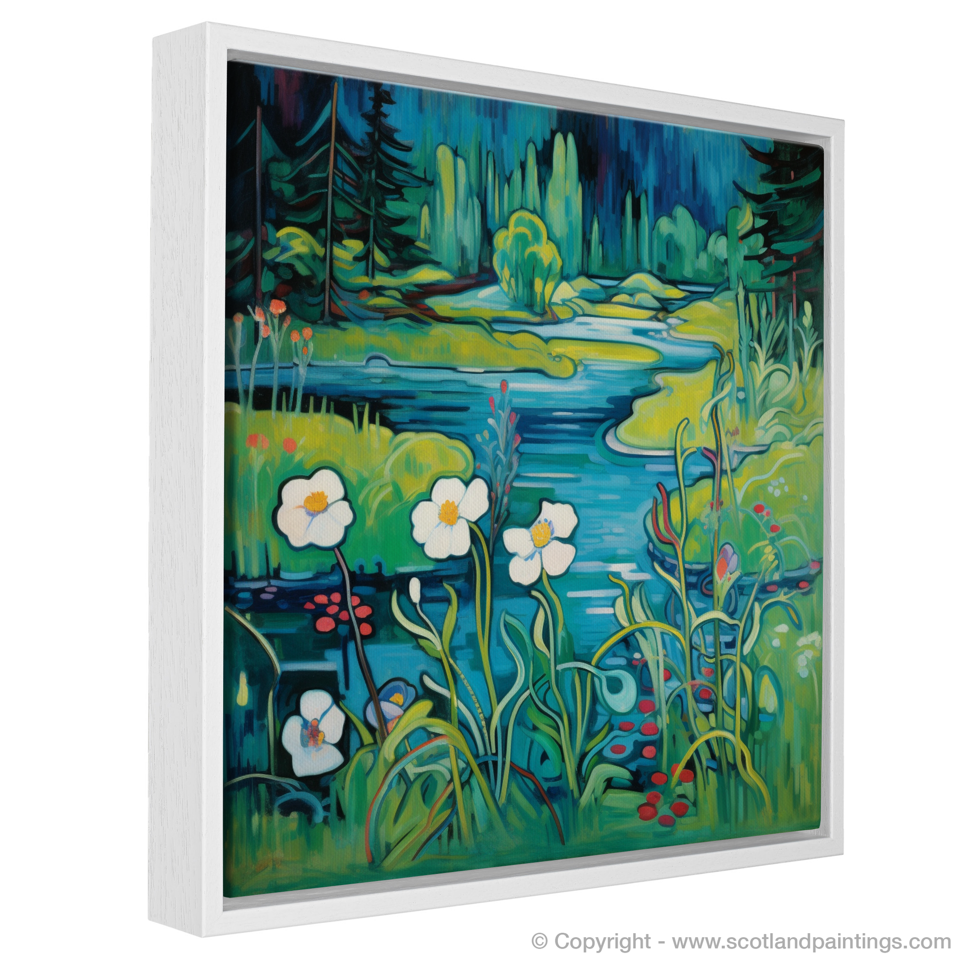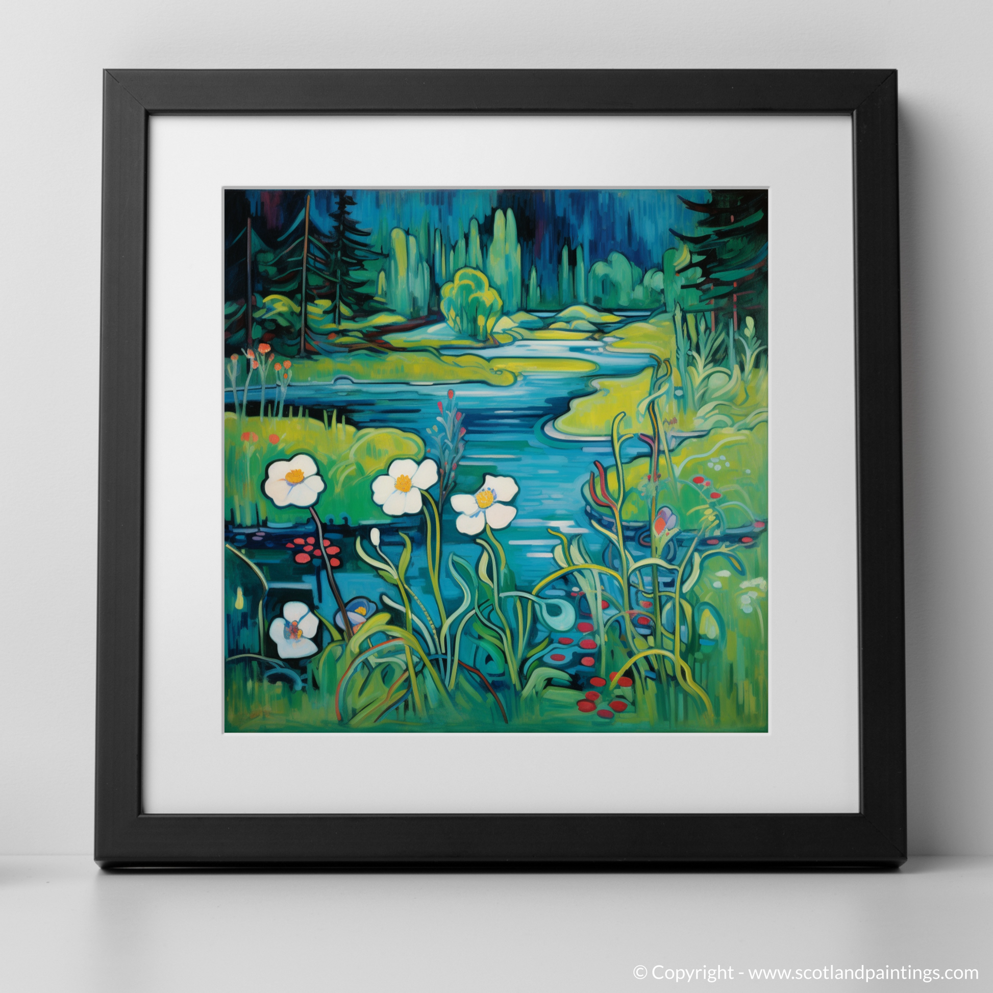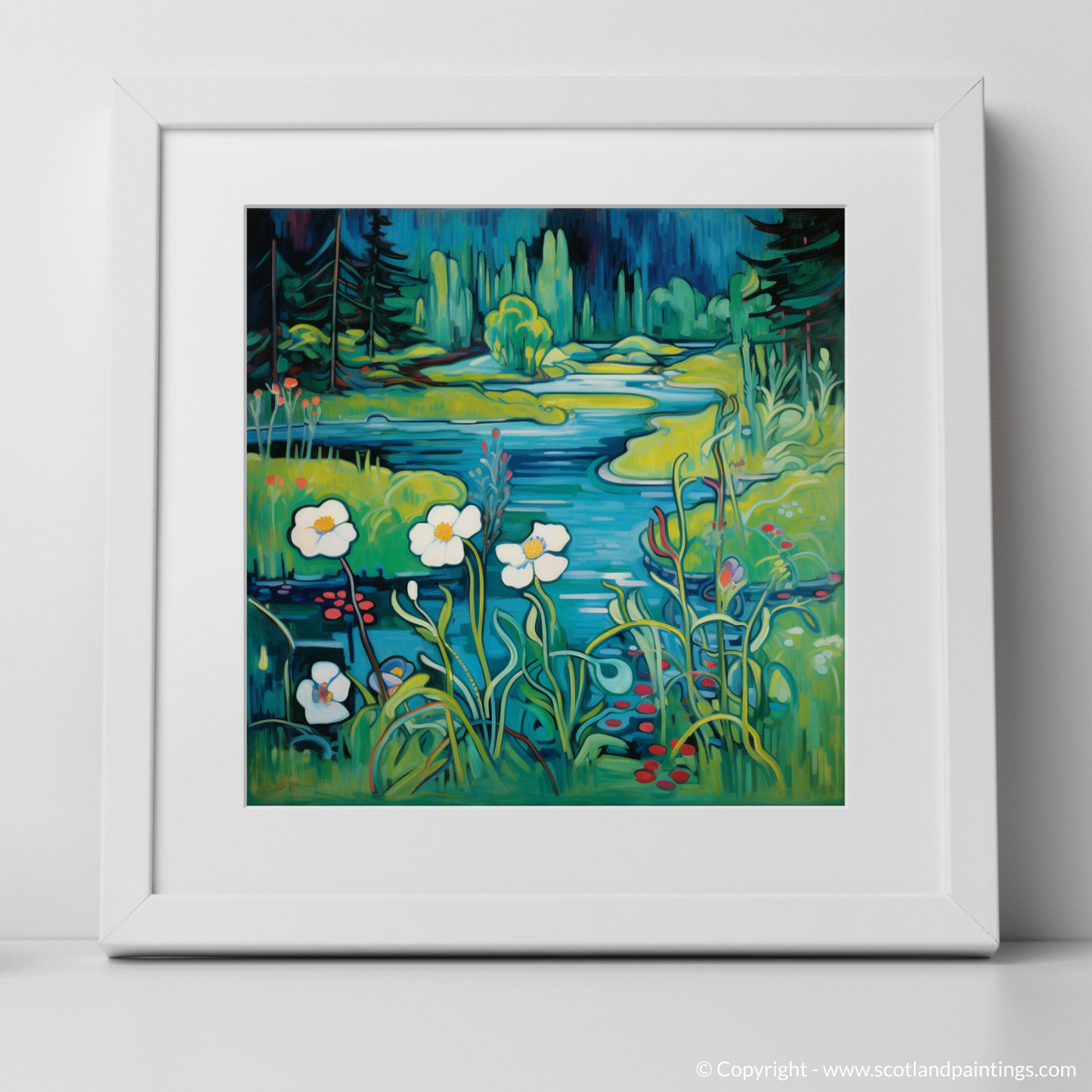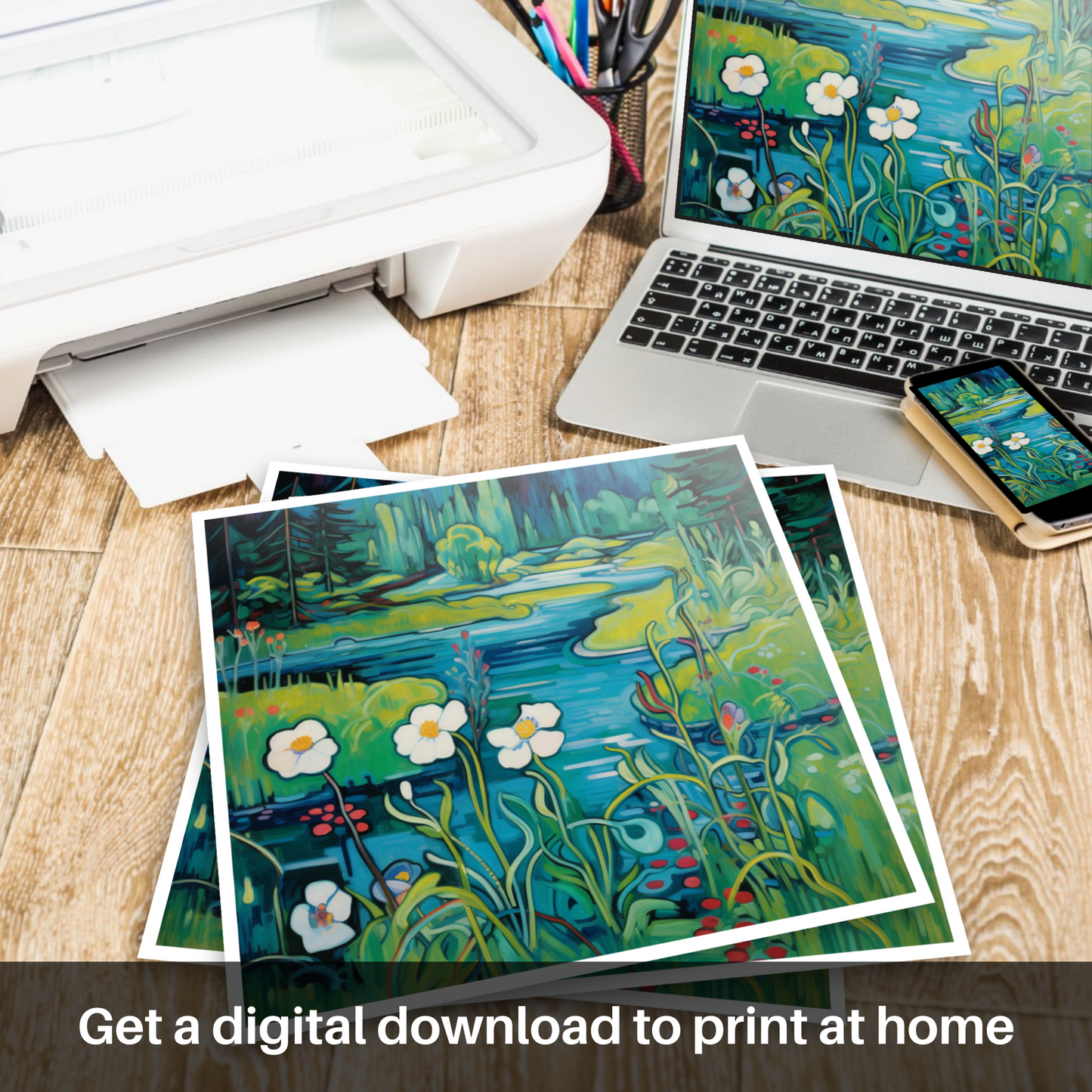Captivated by the dance of light and colour, this print features an enchanting ensemble of white Water avens blossoms in full bloom. Their delicate petals and golden centres vividly contrast against the rich, immersive greens and blues that depict the surrounding vegetation and the river's tranquil surface. The abstract interpretation allows for a play of shapes and hues, enfolding the viewer in a stylised environment that feels both dreamlike and alive.