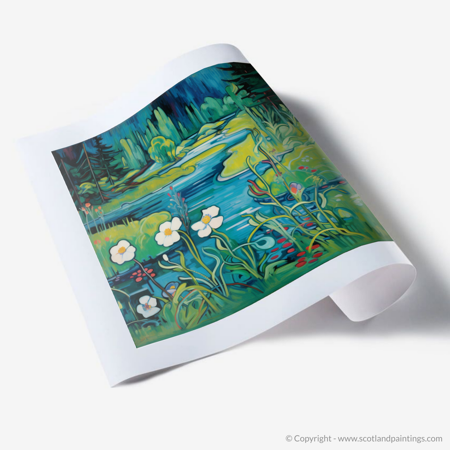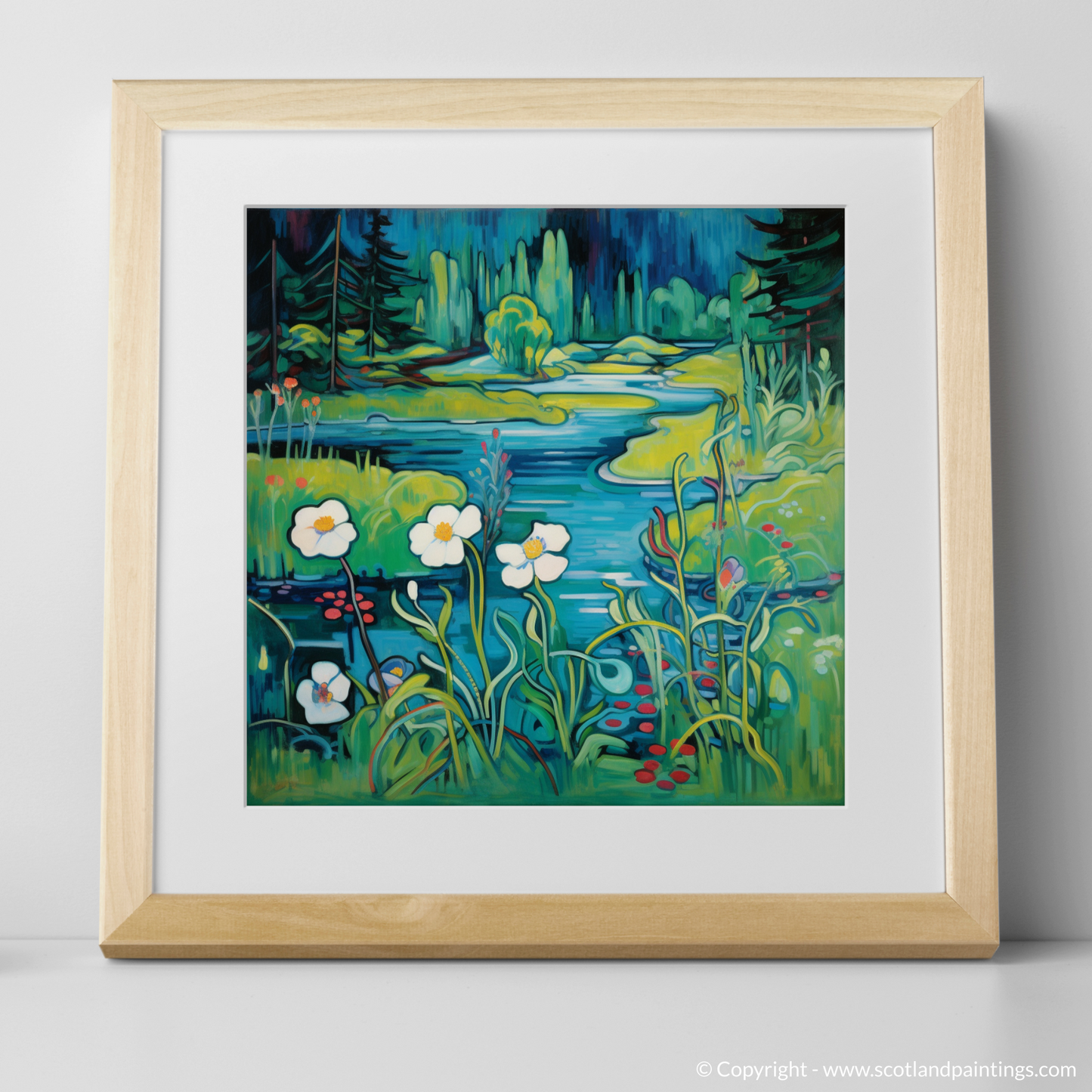Immerse yourself in the mystical vista of Scotland's natural beauty with our striking abstract print, inspired by the serene Water avens along the River Spey. This bold artwork transports you to the very heart of the Scottish Highlands, where the gentle flow of freshwater is edged by verdant, undulating banks and a medley of local flora.