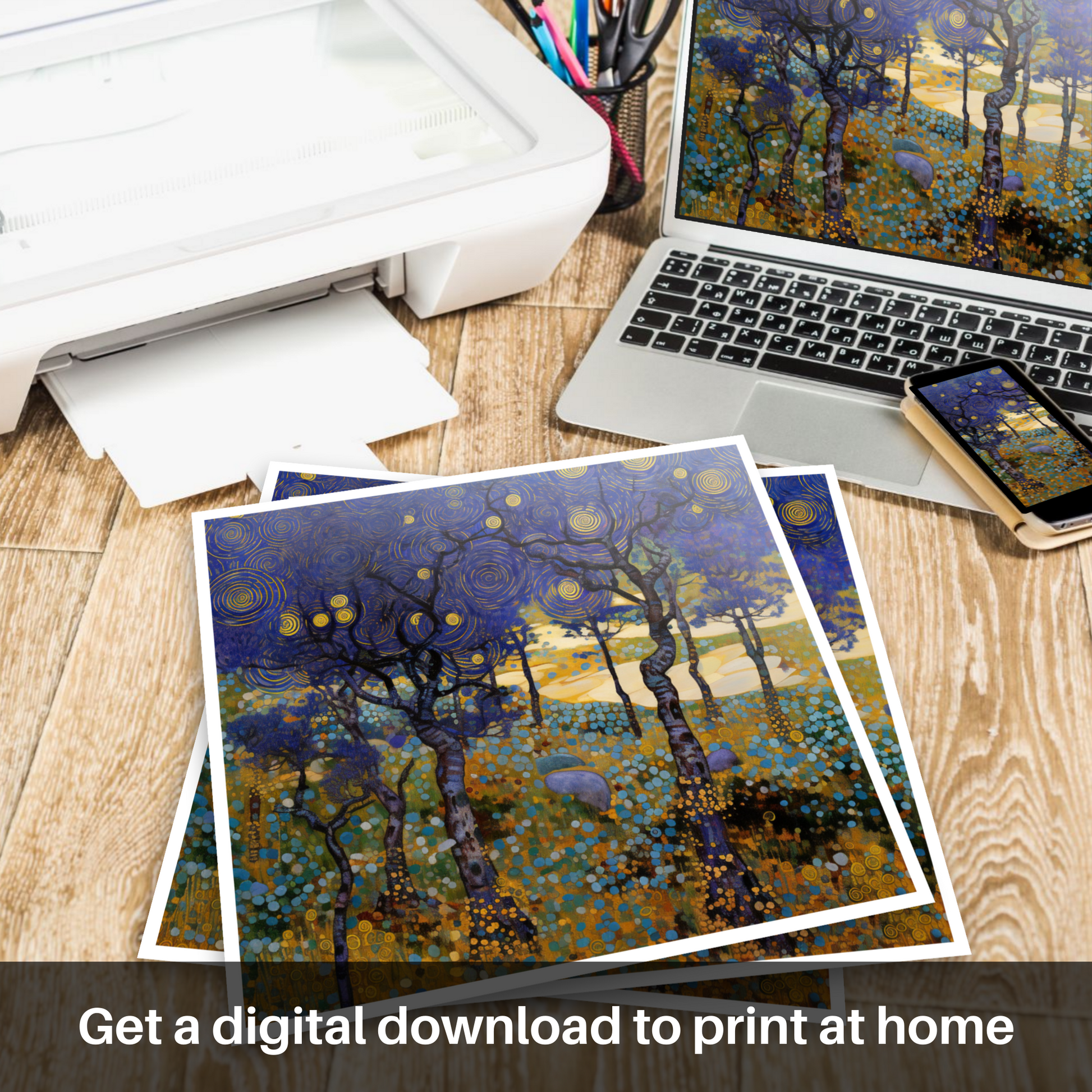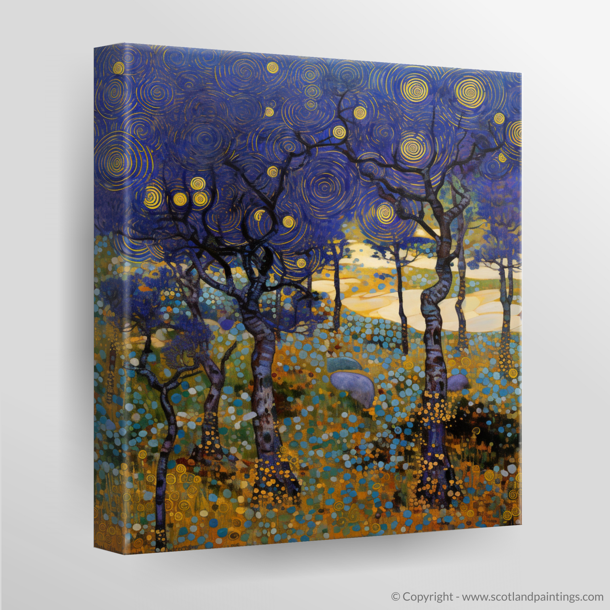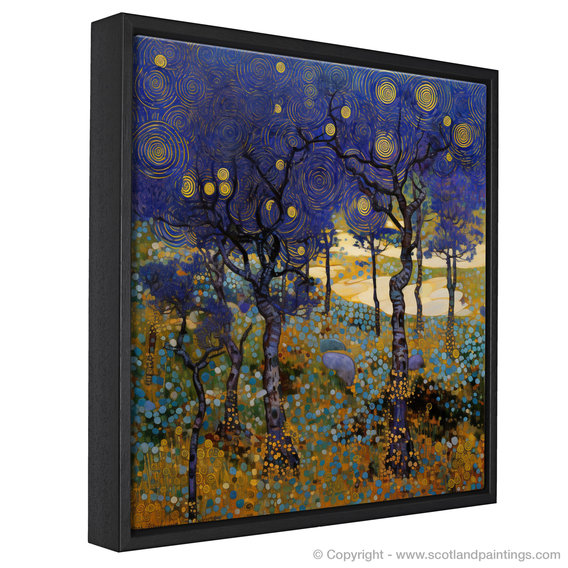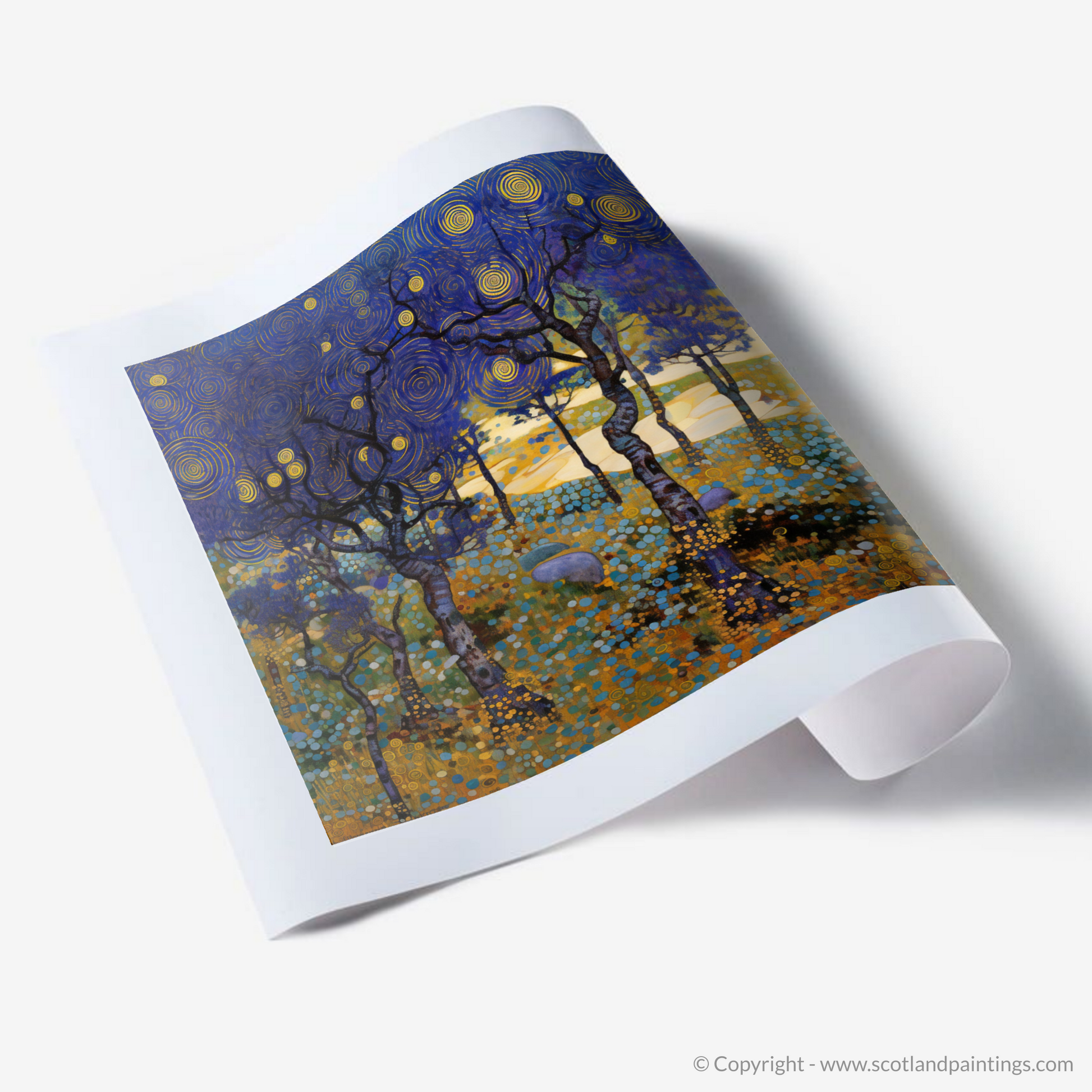 The bilberries themselves, with their dark, sumptuous palette, are lovingly rendered to become jewels of the heath. They nestle under the slender, twisting forms of heathland trees that reach into an iridescent sky, where the night unfurls in a dance of cobalt and deep ultramarine. Celestial bodies pattern the nocturnal canvas, with golden orbs cutting through the violet expanse, each swirl a testament to the unseen currents of the forest air.