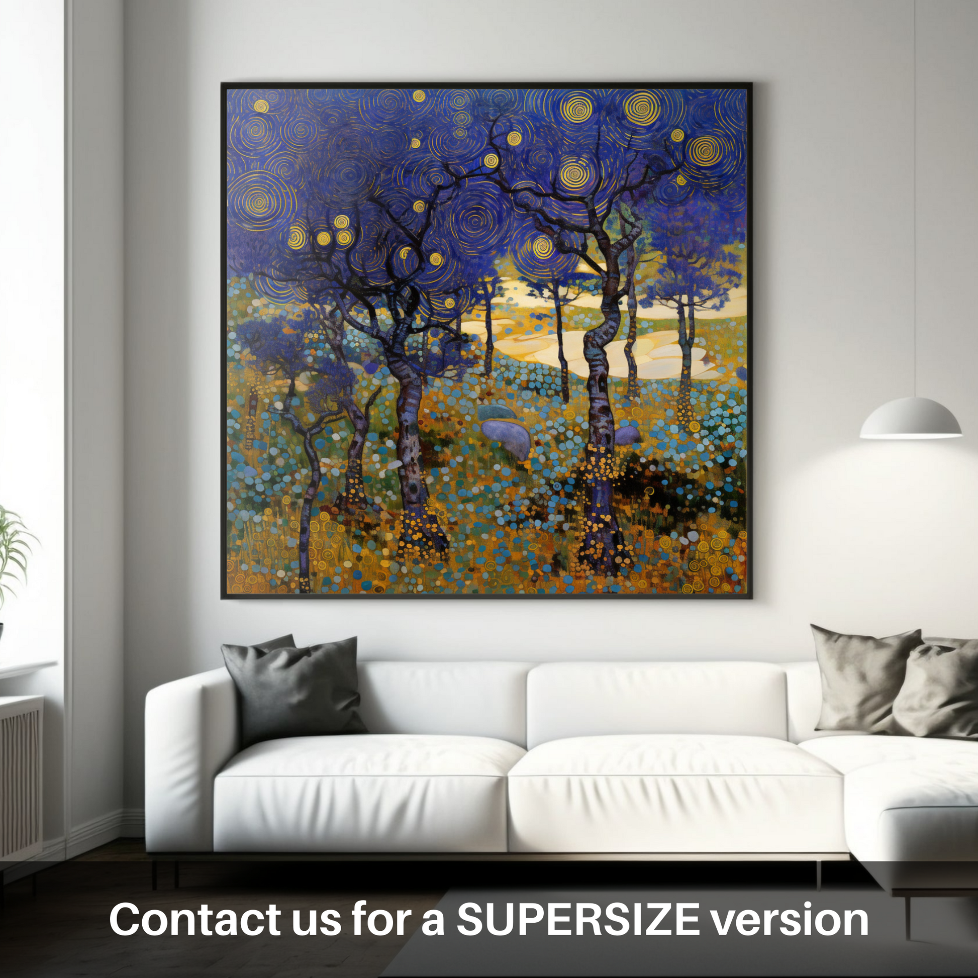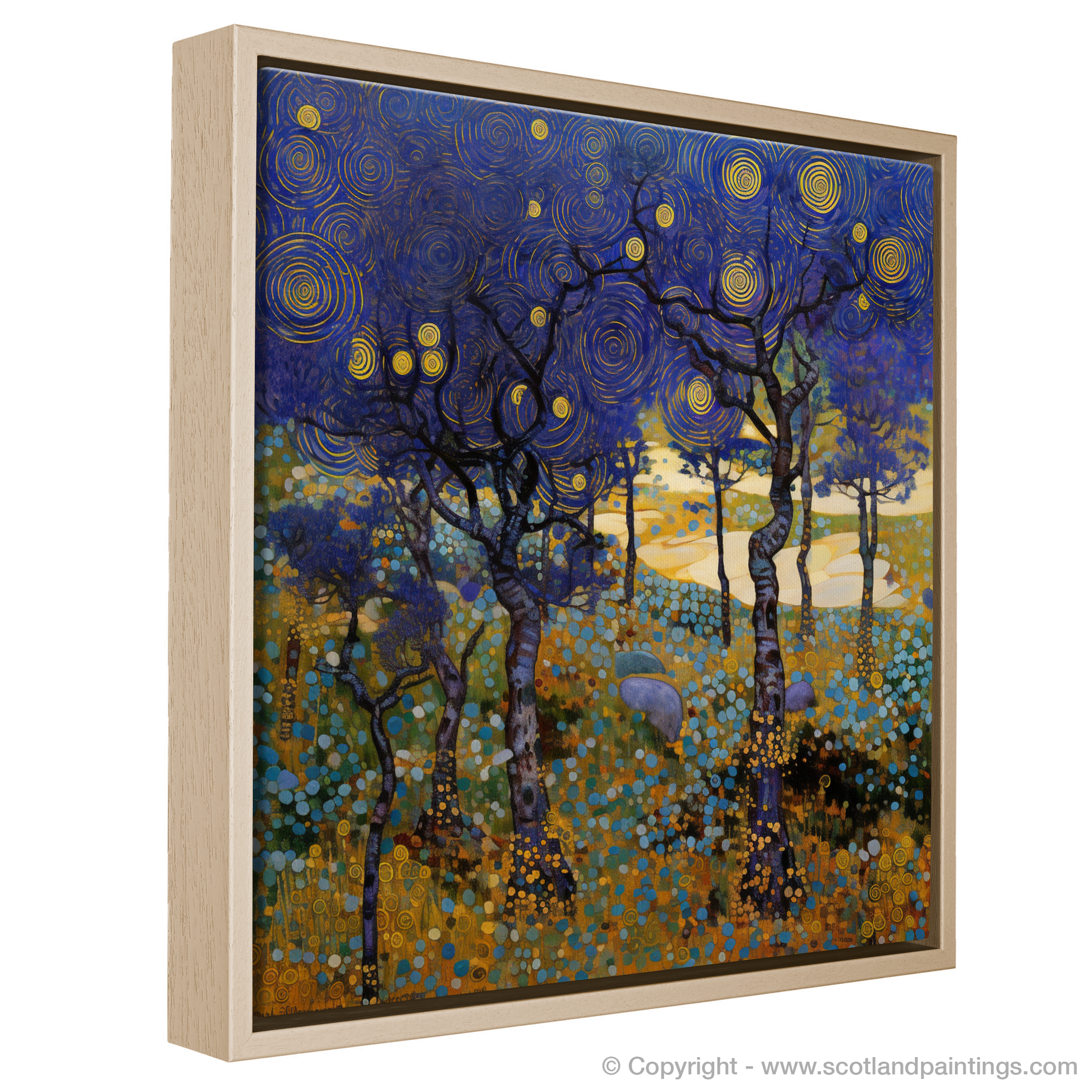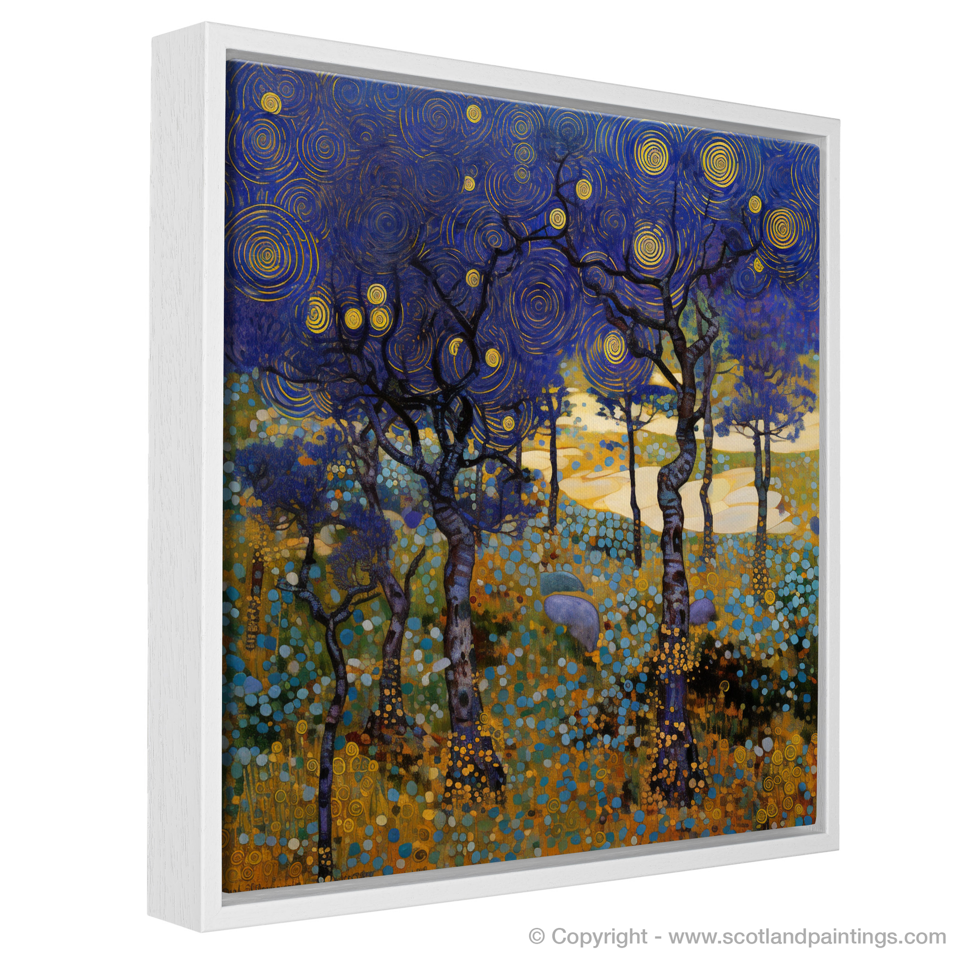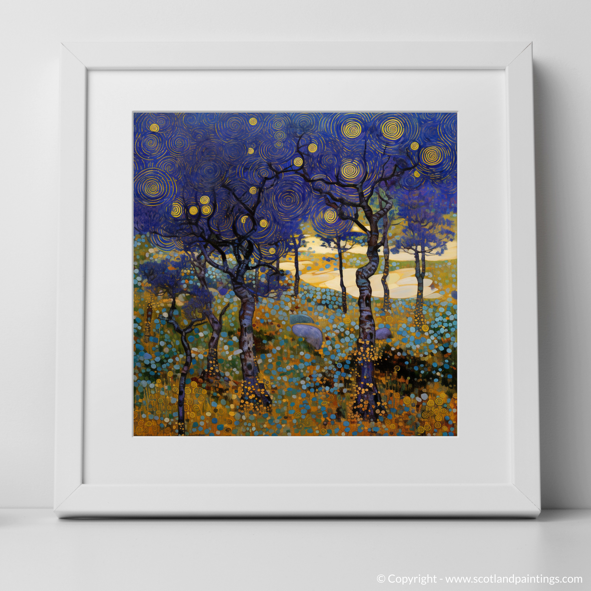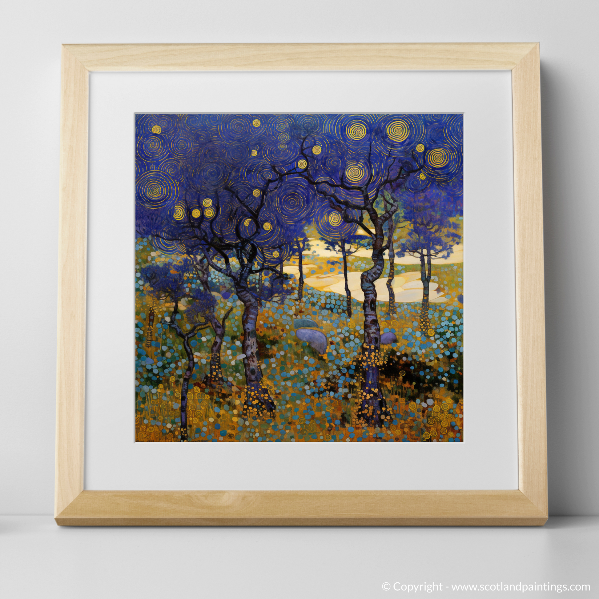 Capturing the whimsical essence of Scotland's natural charm, this exquisite print evokes the enchantment of Galloway Forest Park's heathlands. Rich in the stylistic flourishes of Art Nouveau, the composition features a mesmerising tableau of bilberries amidst the wild flora. The elegance of the sinuous lines and the interplay of organic forms against a labyrinth of swirling skies fuse to create a harmonious symphony of colour and pattern.
