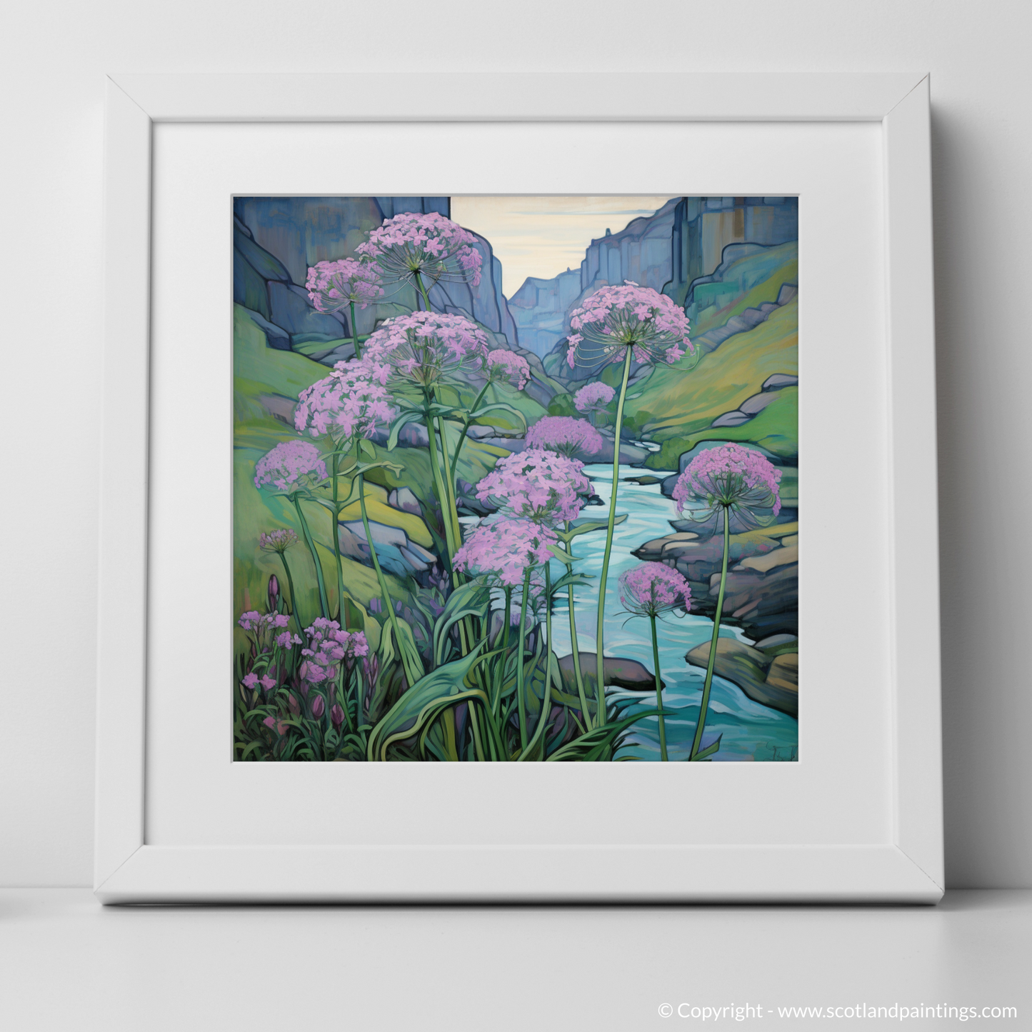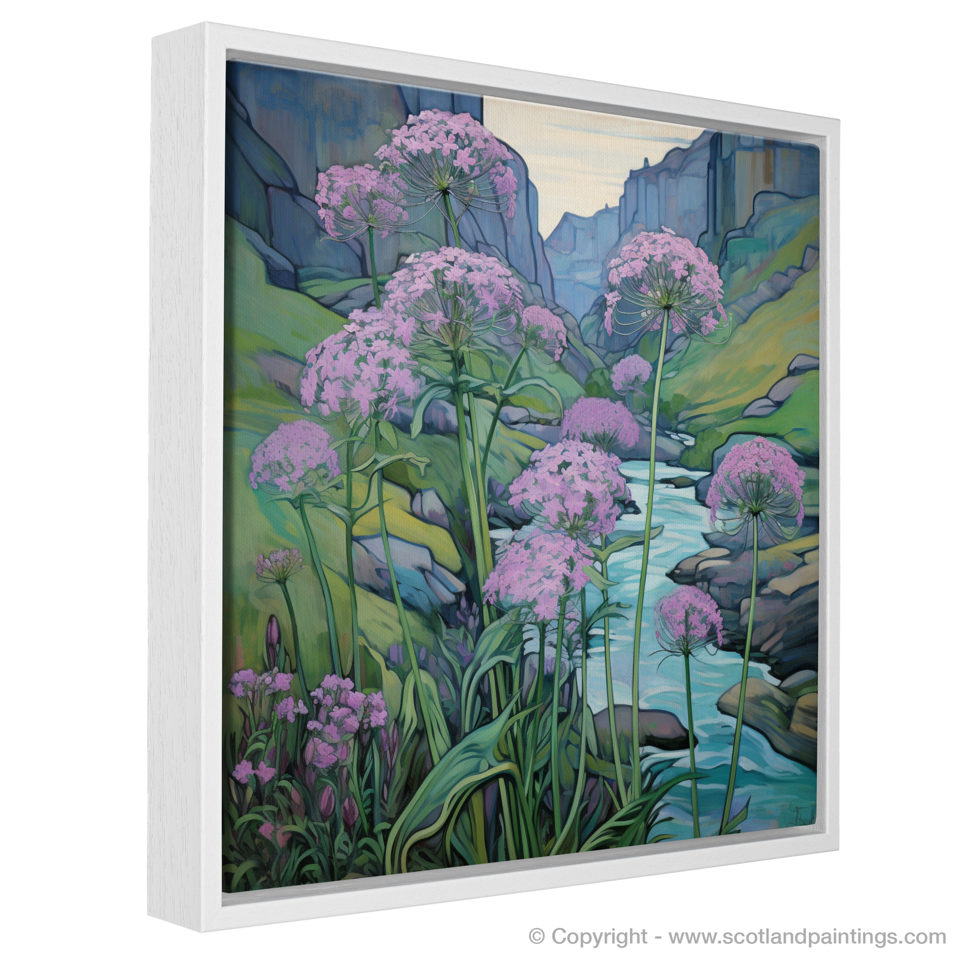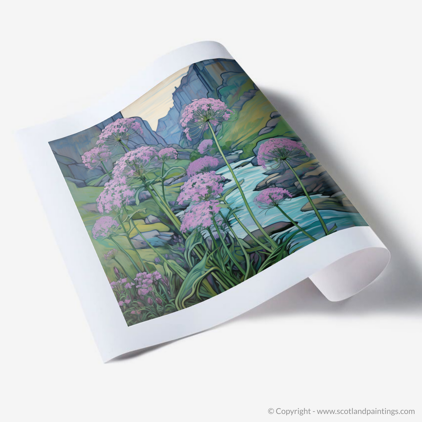 Step into the enchanting world of Rosslyn Glen with this exquisite art piece, embodying the serene beauty of Scottish riverbanks. Splashes of delicate pink hue dominate the scene, as clusters of valerian flowers stand tall against the tranquillity of the flowing waters. The flora is drawn with gentle curves and fine lines, a true testament to the Art Nouveau style's love for natural forms and structures.