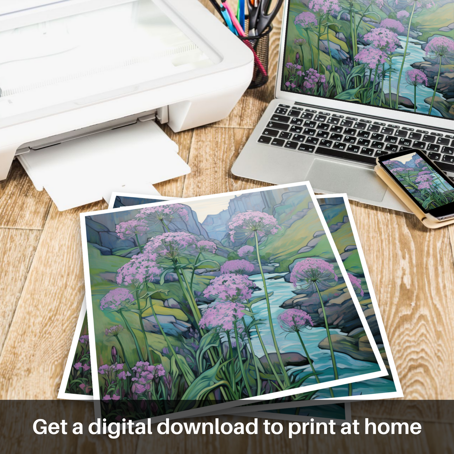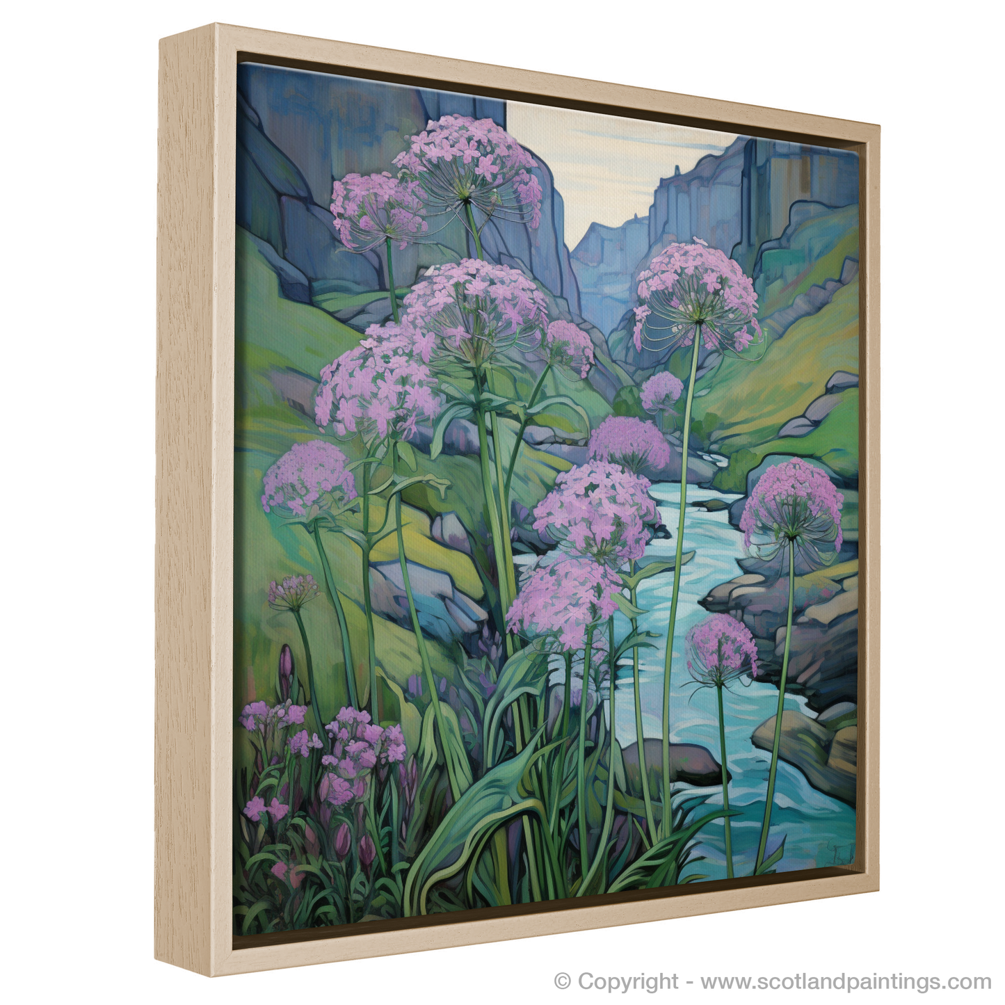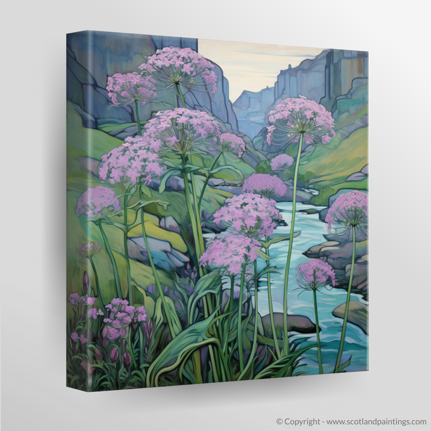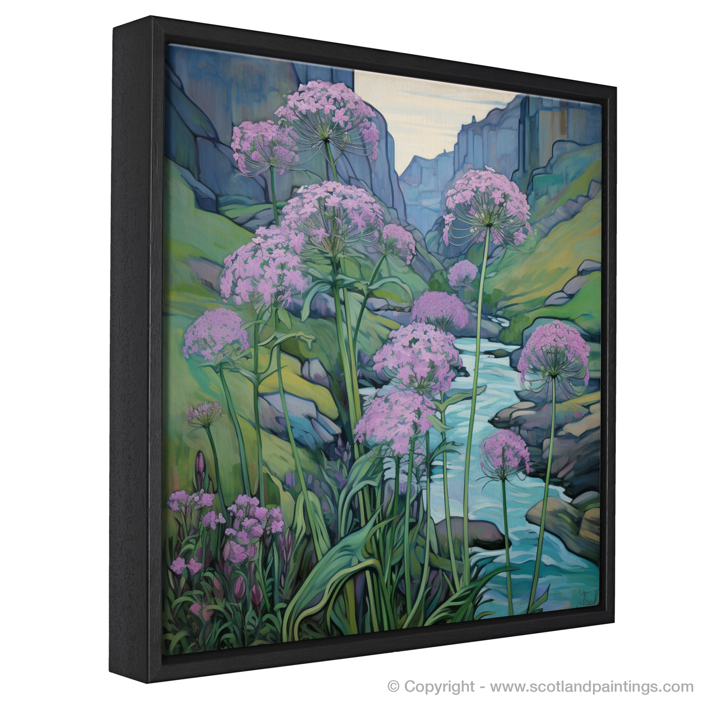Step into the enchanting world of Rosslyn Glen with this exquisite art piece, embodying the serene beauty of Scottish riverbanks. Splashes of delicate pink hue dominate the scene, as clusters of valerian flowers stand tall against the tranquillity of the flowing waters. The flora is drawn with gentle curves and fine lines, a true testament to the Art Nouveau style's love for natural forms and structures.