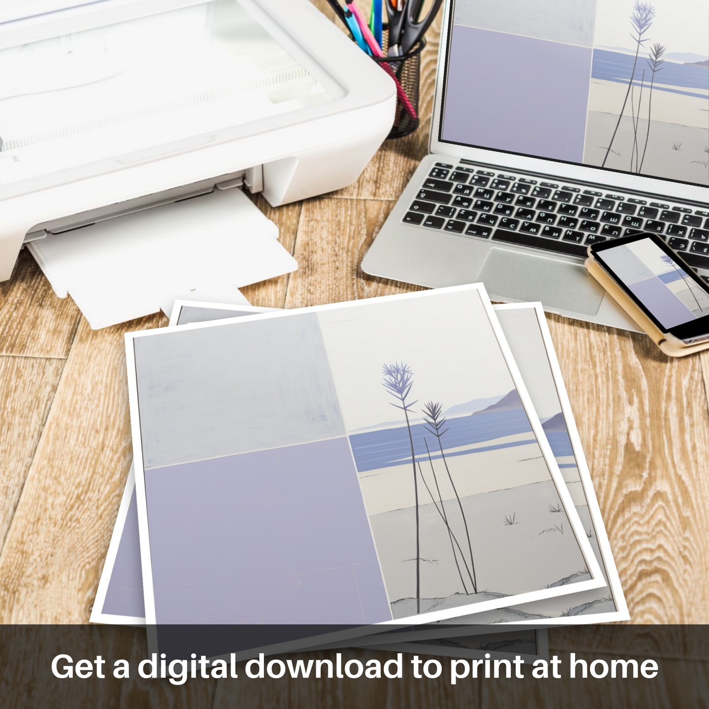Stretching toward the right on sandy dunes, minimalist representations of Sea holly plants stand tall and slender, their distinctive form reduced to essential lines and shapes. These botanical silhouettes make a bold but graceful statement, casting their metaphorical roots in the fine, sandy grains of the print's foreground, which bears a faint suggestion of other beach vegetation.