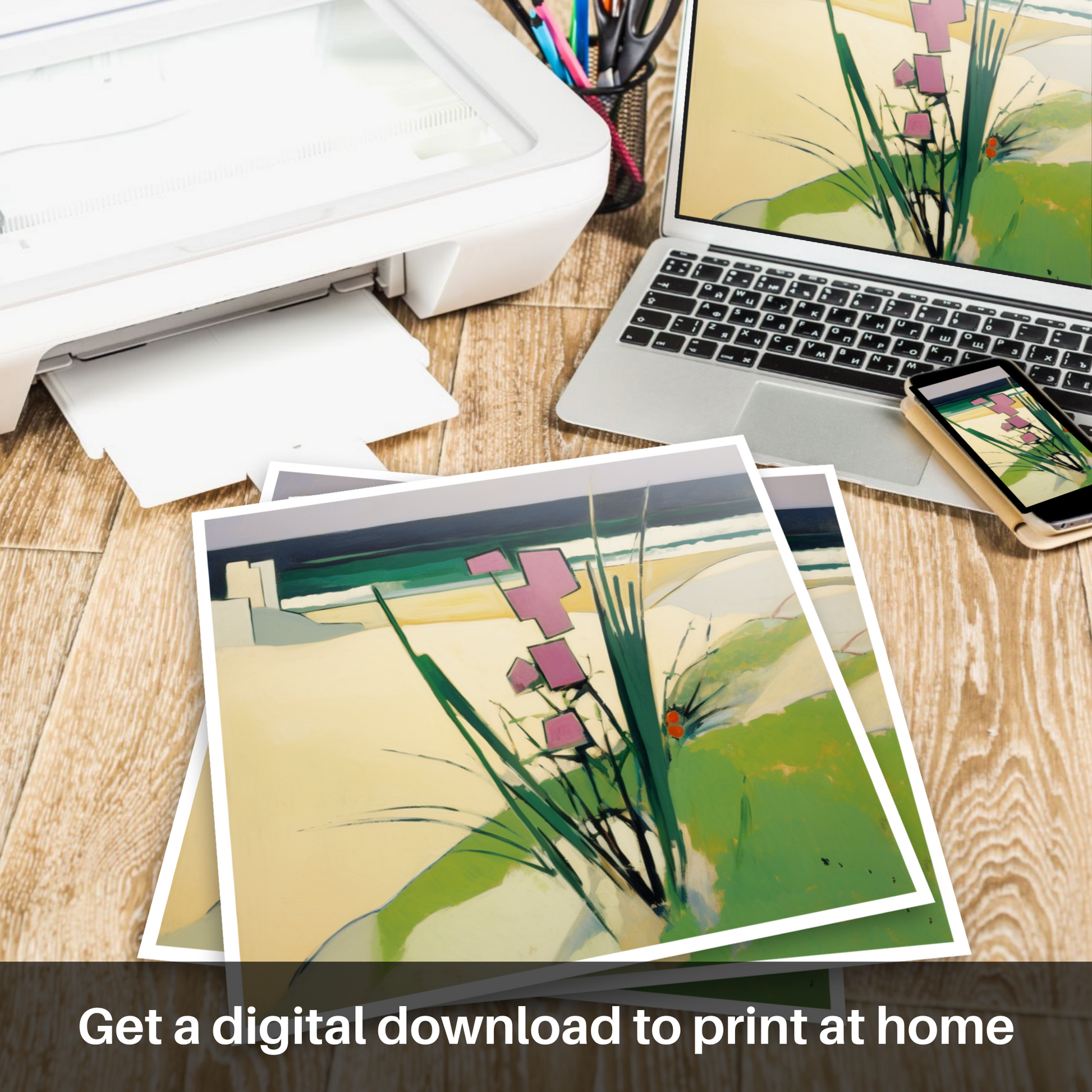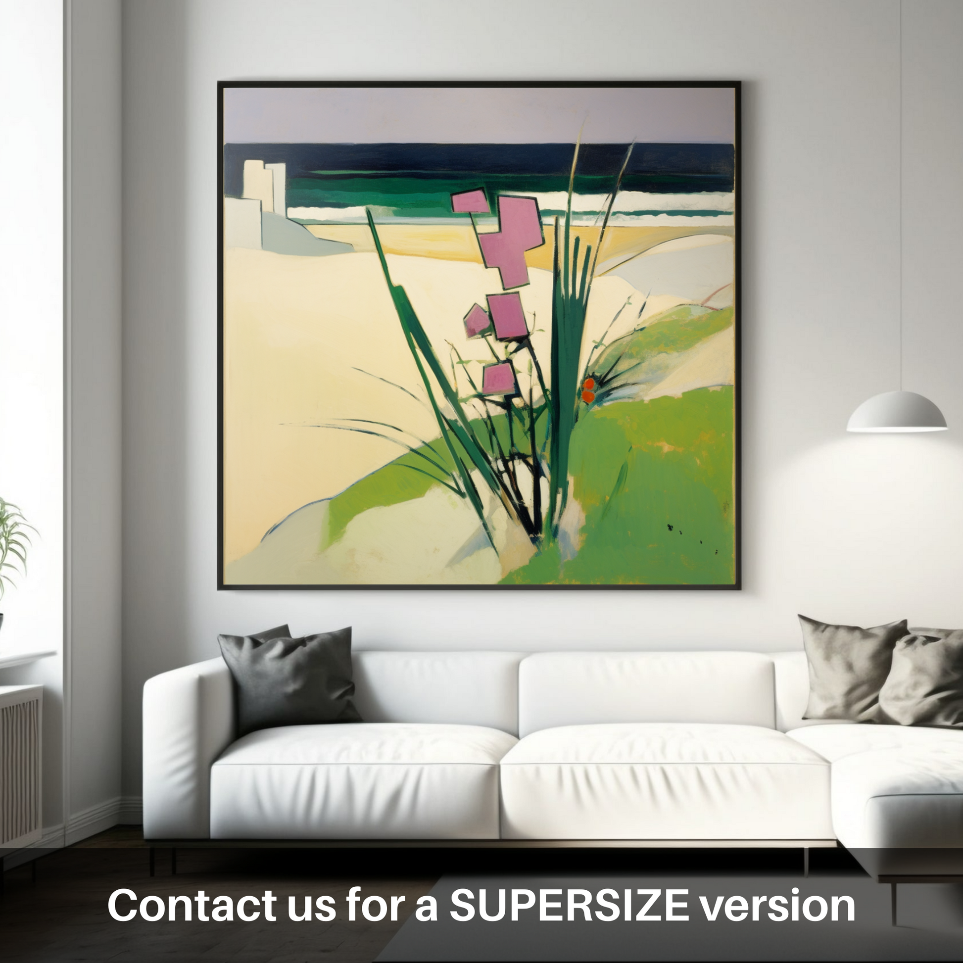 The composition thrives on contrast and colour, where the warmth of sun-kissed dunes meets the cool of ocean hues. The central motif, inspired by the resilient Sea rocket, emerges as geometric blossoms in blush tones — delicate yet defiant against the elements. Sharp lines and verdant green blades cut through the softness of the sand, with a single fiery bloom providing an arresting focal point, sparking curiosity and conversation.