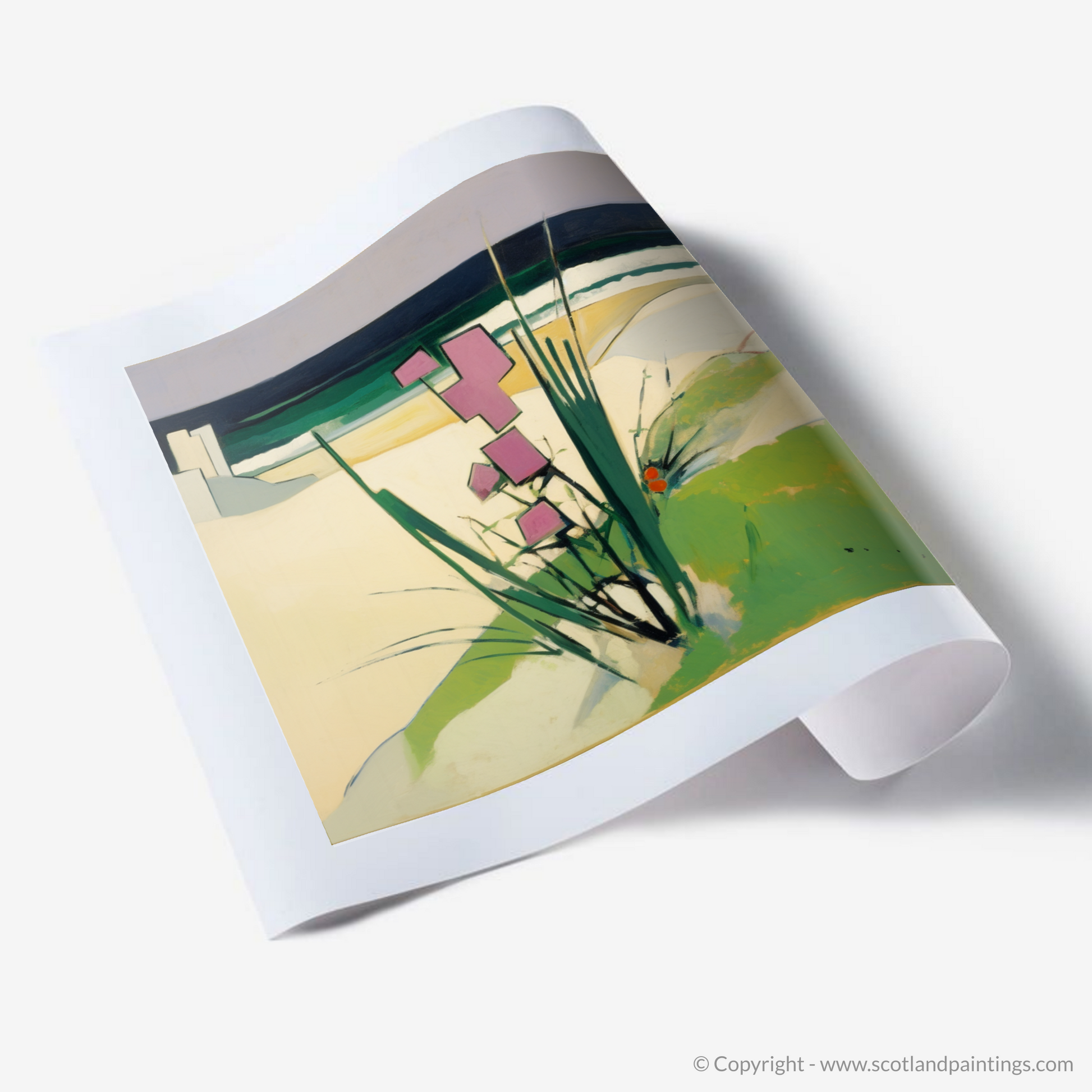 In the background, the abstract interpretation continues as serene whites and blues suggest an expanse of beach meeting water and sky, with a secondary layer of landscape peering through, adding depth and intrigue. This print stands as a poetic testament to the wild, untamed beauty of Balmedie Beach, offering an abstract portal to Scotland's coast that invites interpretation and introspection.