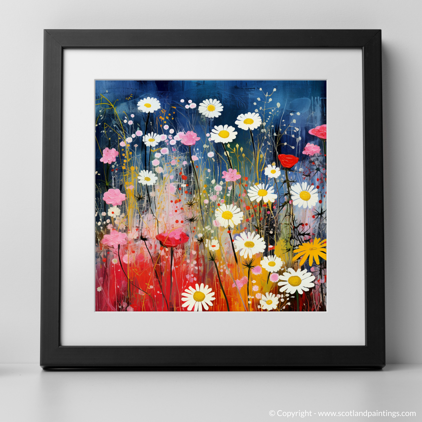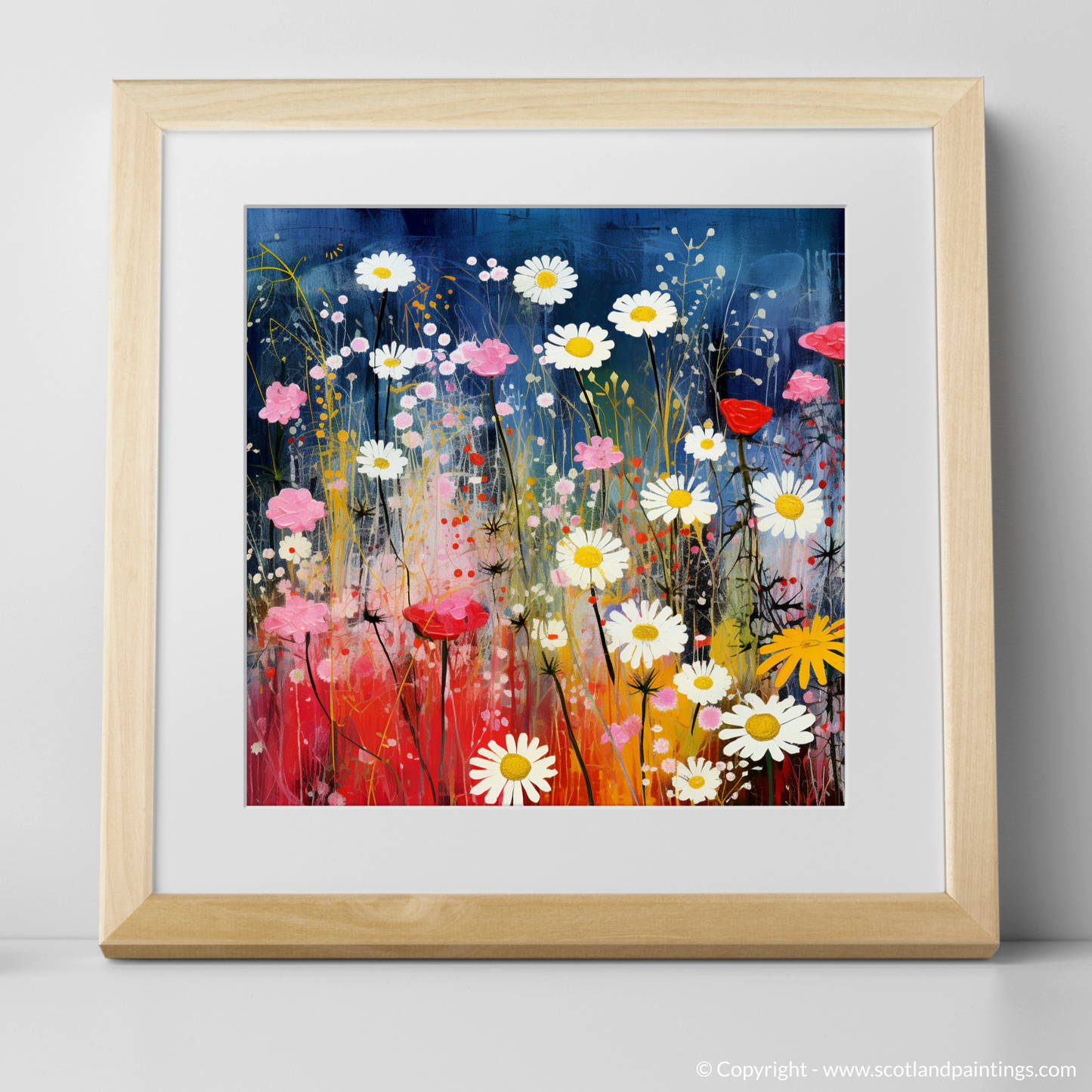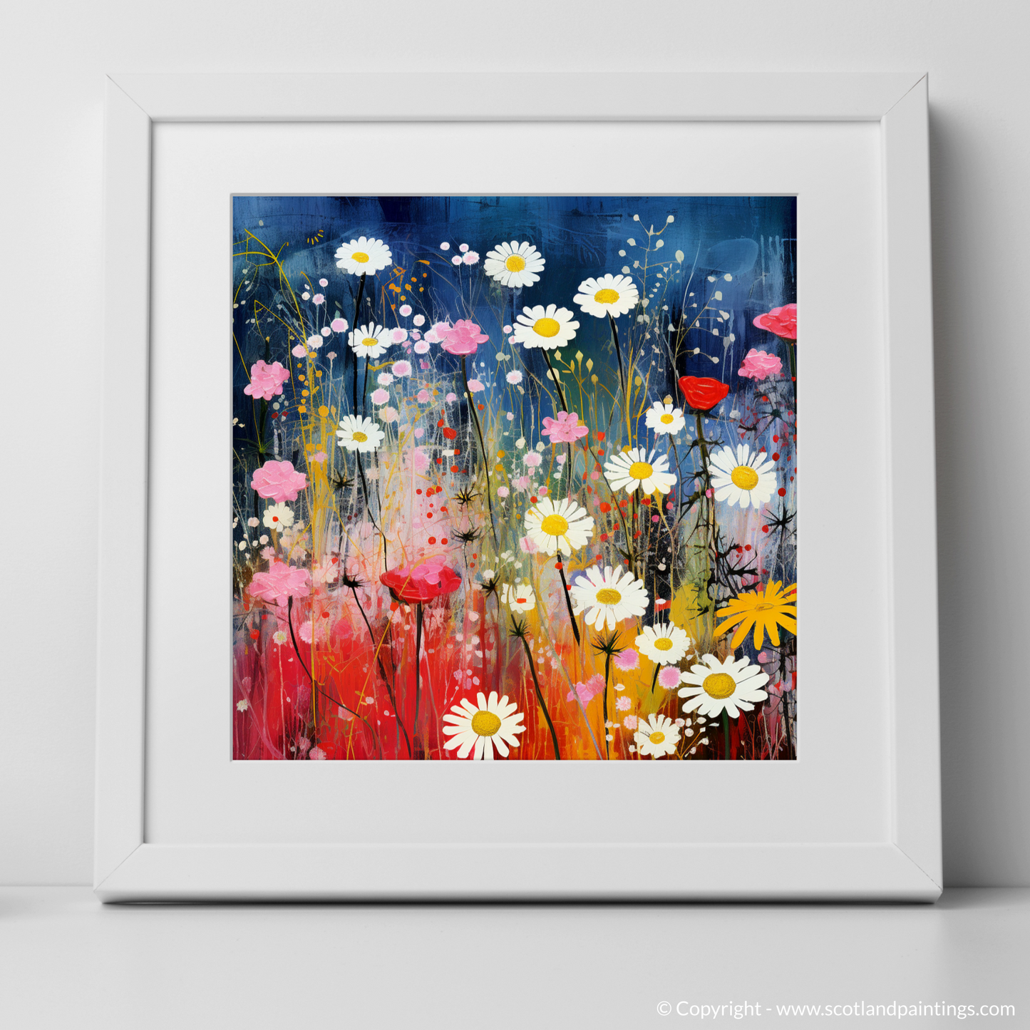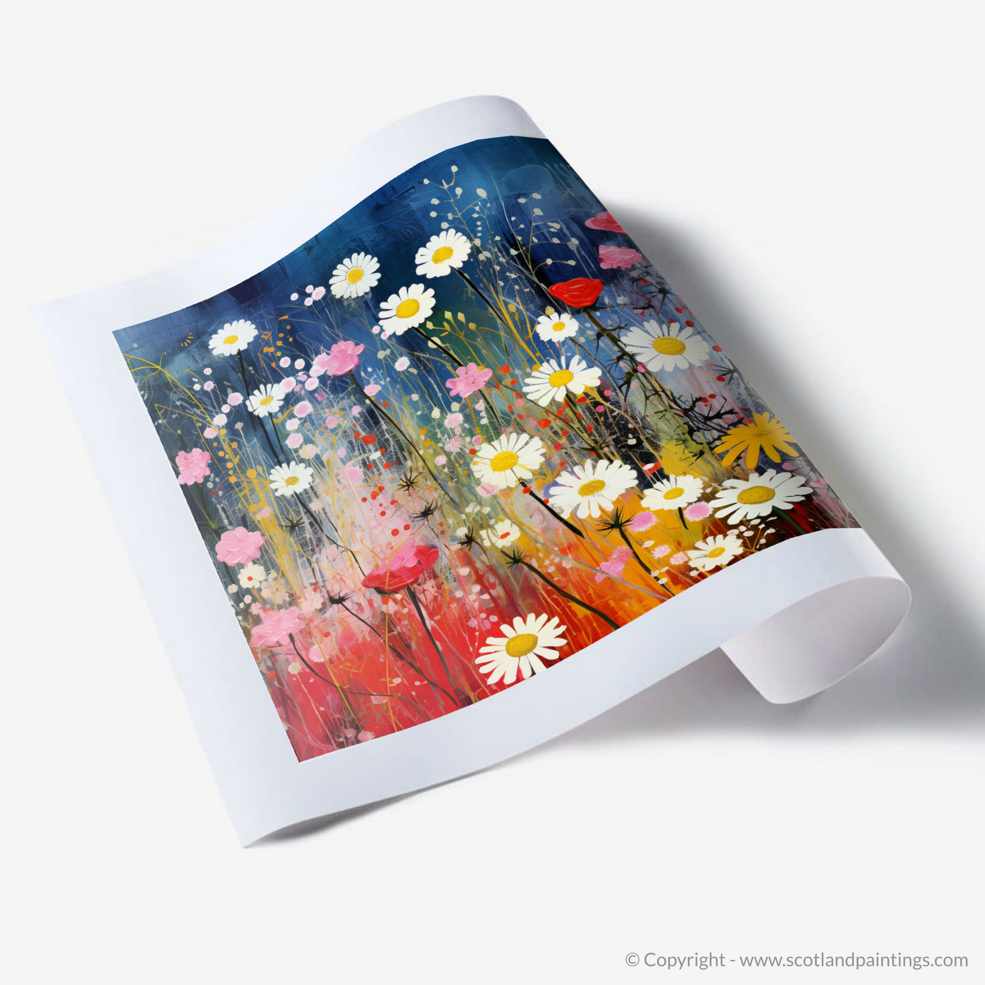 Step into a dreamlike meadow where the wildflowers of The Trossachs come alive in an exquisite dance of colour and whimsy. This charismatic print eloquently captures the vibrant essence of Scottish flora, where the delicate red campions, radiant oxeye daisies, and the understated charm of yellow rattle are celebrated in a surrealistic tableau that seems to pulsate with life.