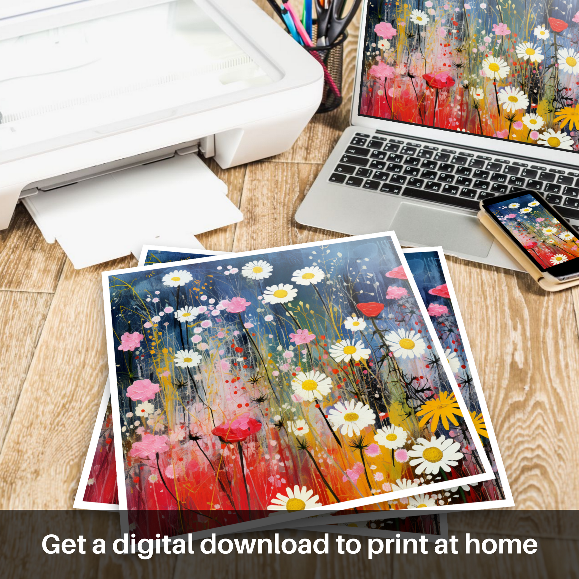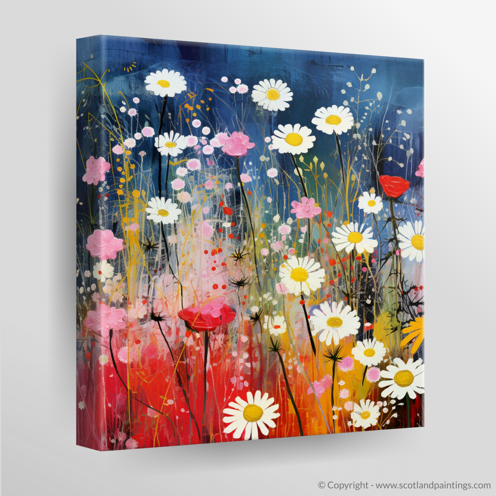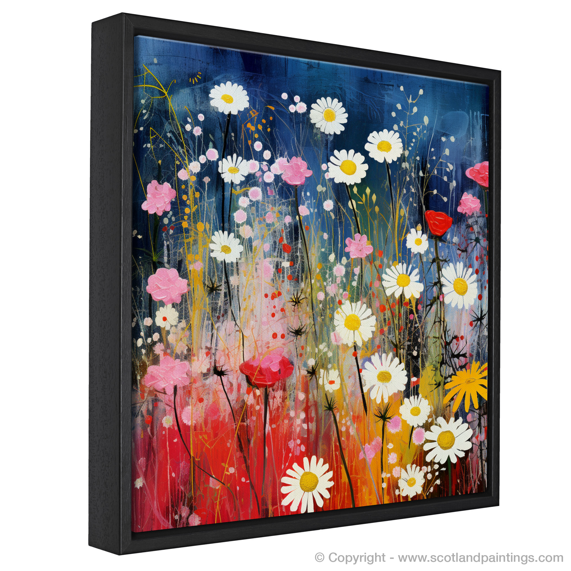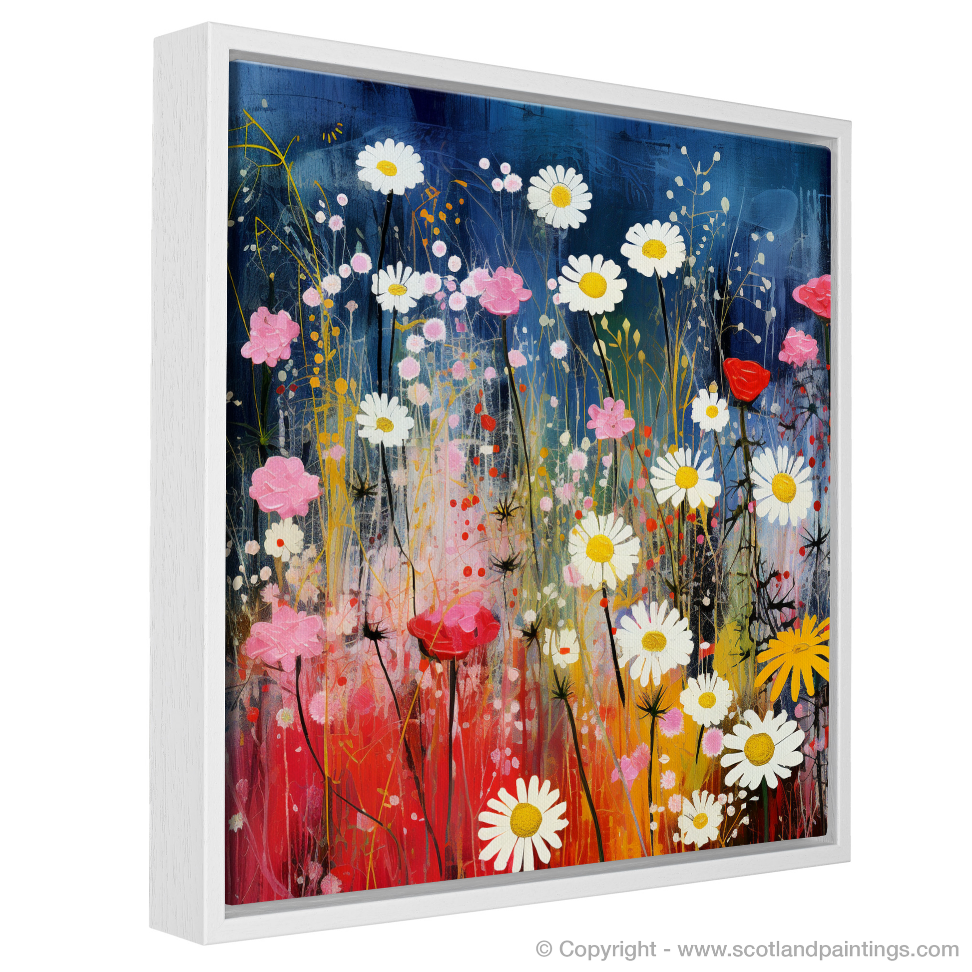 Step into a dreamlike meadow where the wildflowers of The Trossachs come alive in an exquisite dance of colour and whimsy. This charismatic print eloquently captures the vibrant essence of Scottish flora, where the delicate red campions, radiant oxeye daisies, and the understated charm of yellow rattle are celebrated in a surrealistic tableau that seems to pulsate with life.