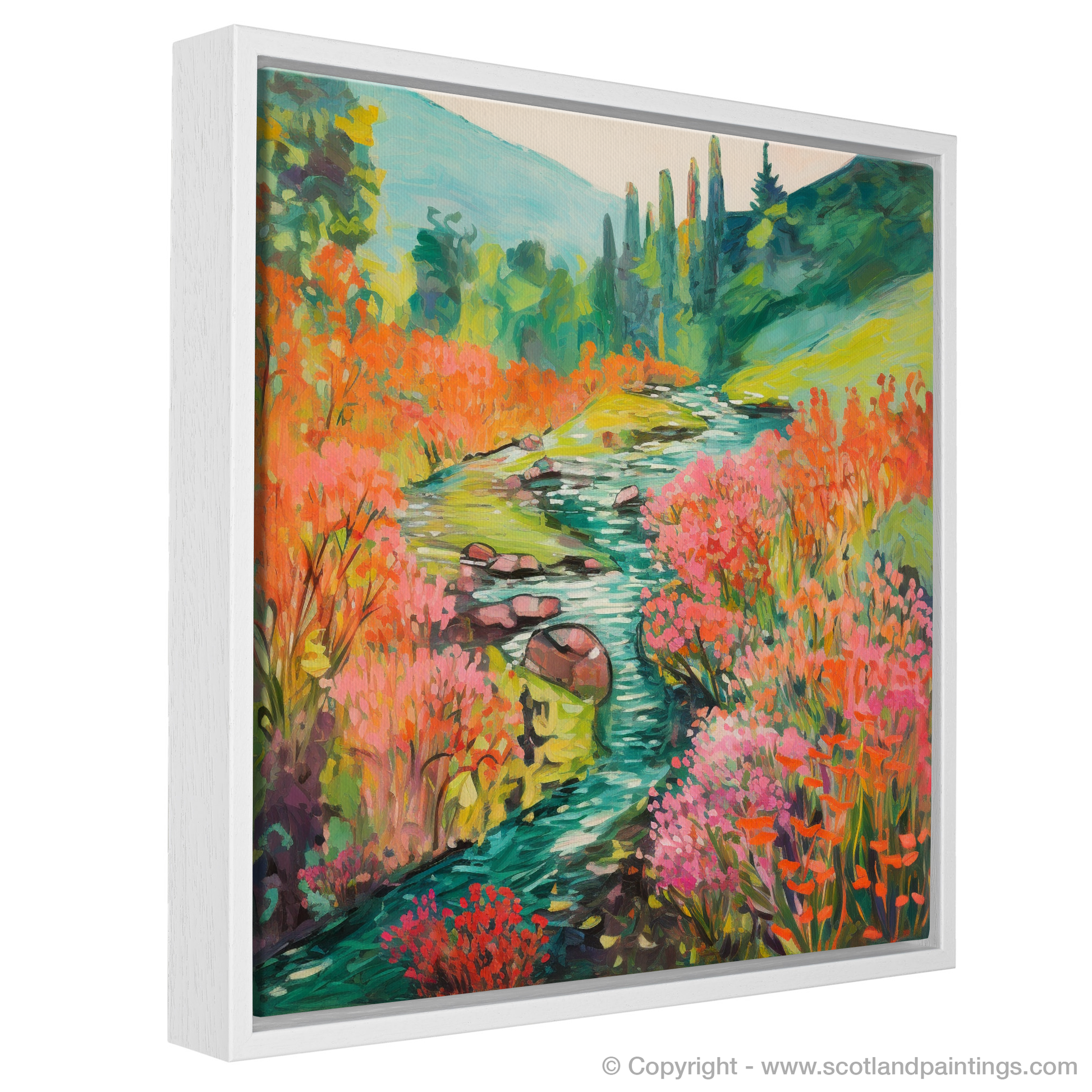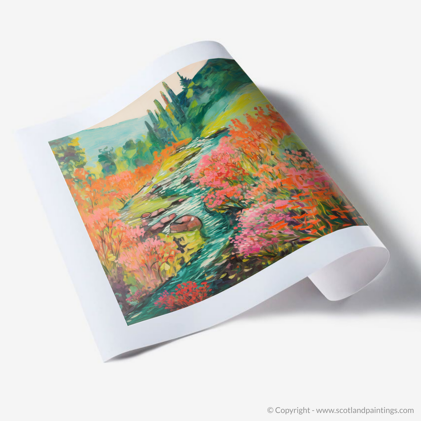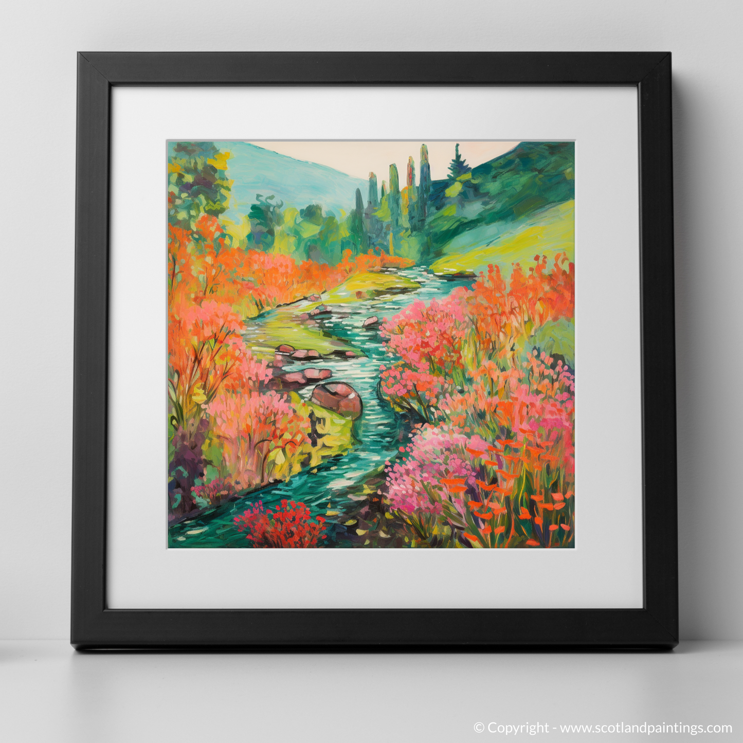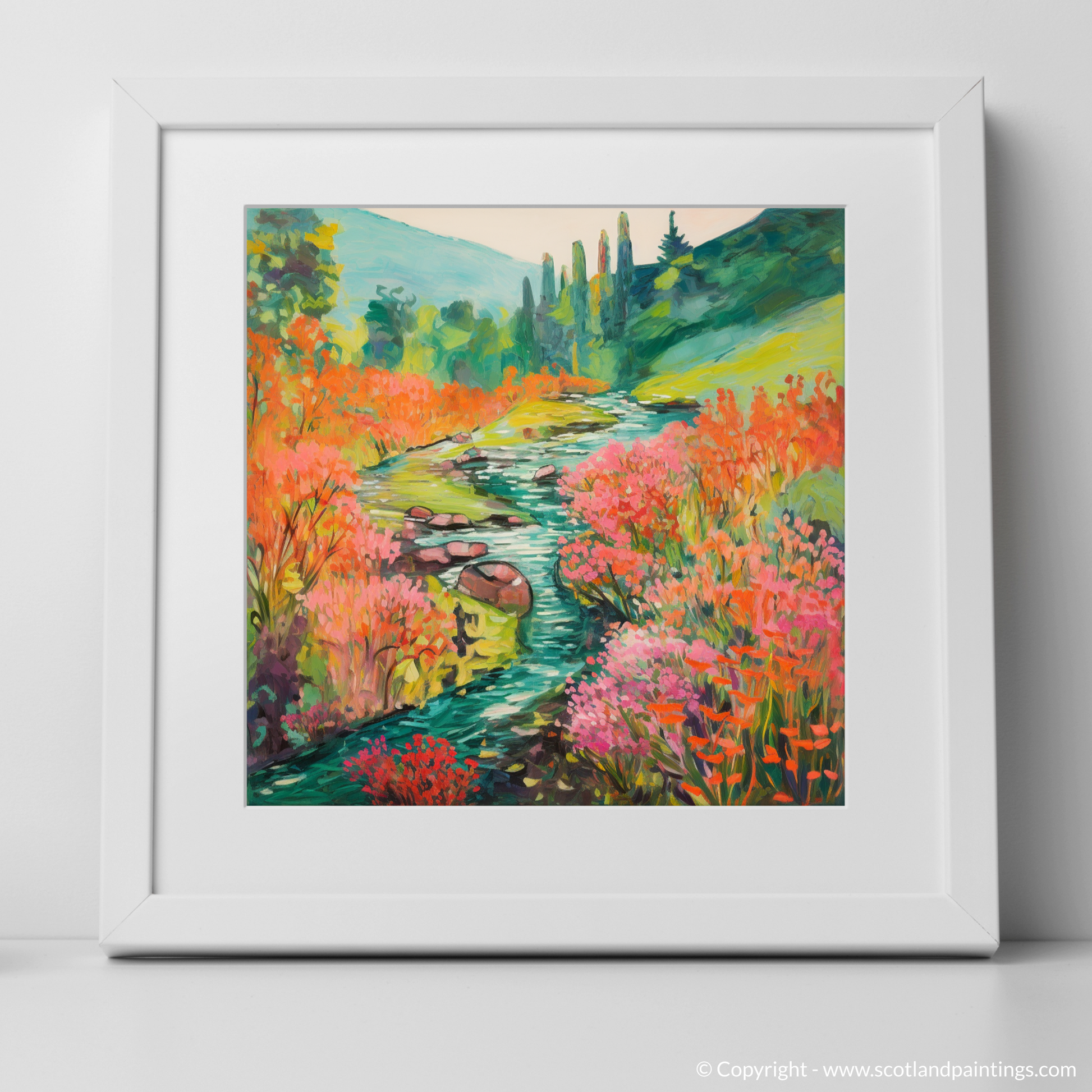 Capturing the enchanting essence of Rosslyn Glen's natural beauty, this exquisite print showcases a meandering river, its banks caressed by the vibrant hues of blooming Valerian. Embraced by the serene majesty of Scottish flora, this piece invites the onlooker to a world where colour becomes the primary language of expression.
