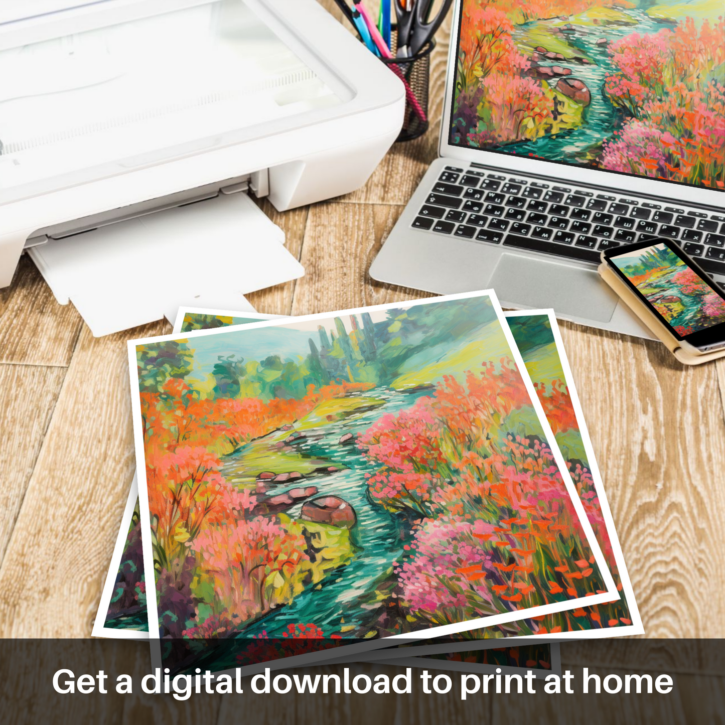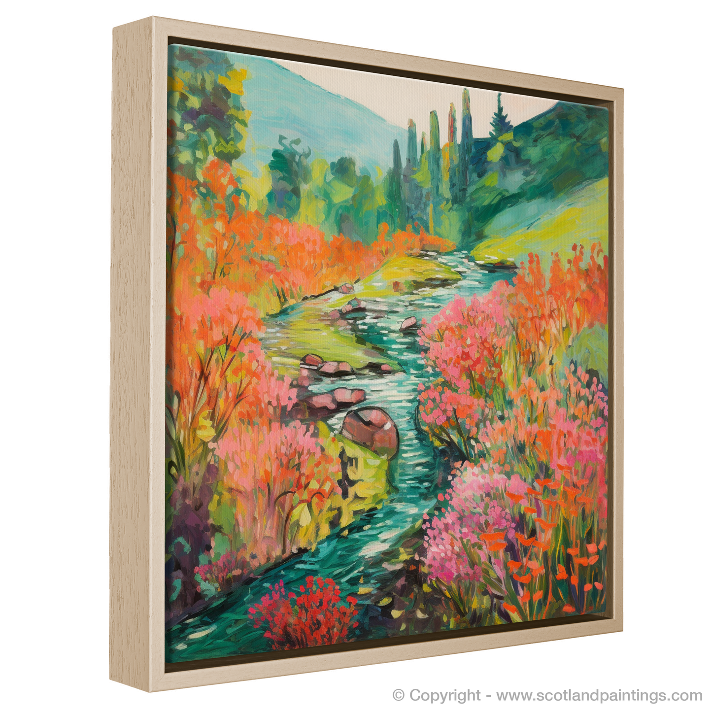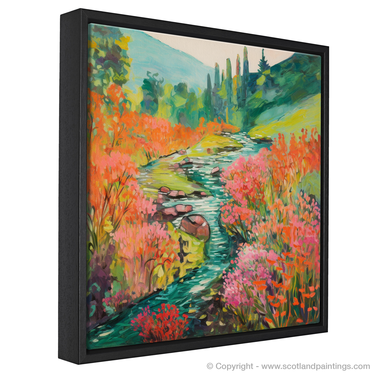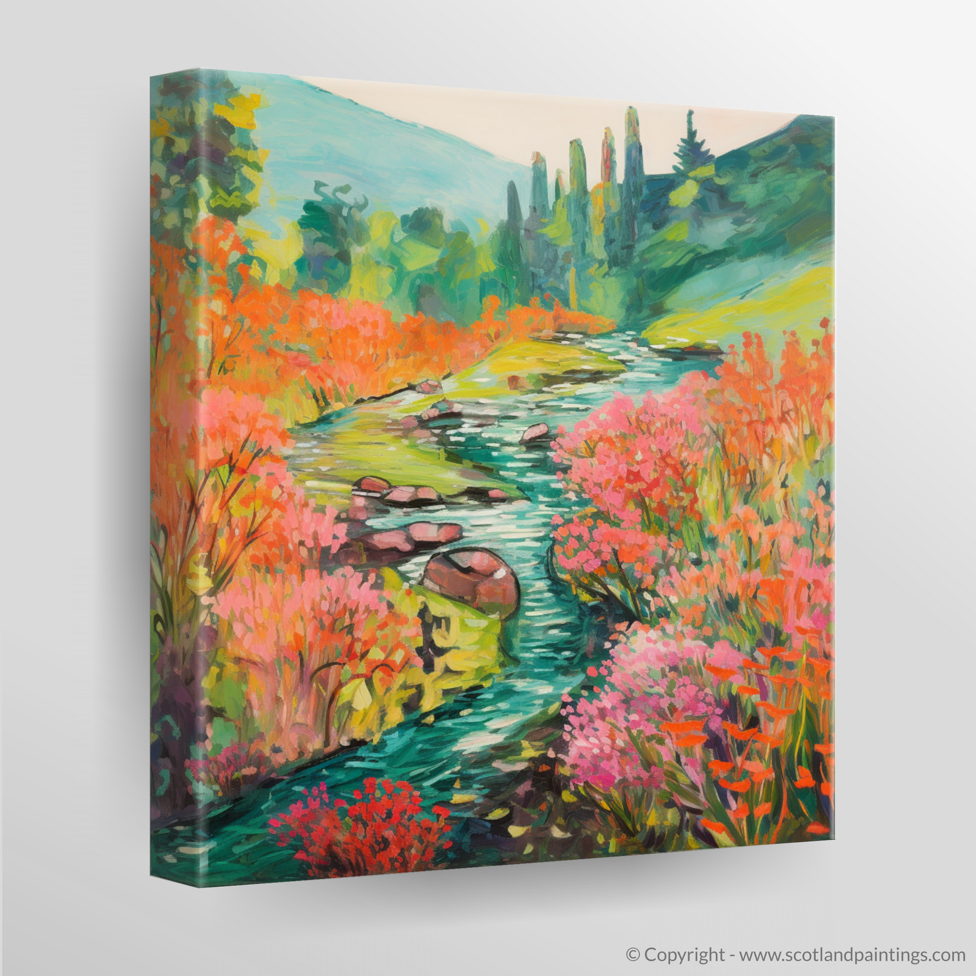 Capturing the enchanting essence of Rosslyn Glen's natural beauty, this exquisite print showcases a meandering river, its banks caressed by the vibrant hues of blooming Valerian. Embraced by the serene majesty of Scottish flora, this piece invites the onlooker to a world where colour becomes the primary language of expression.