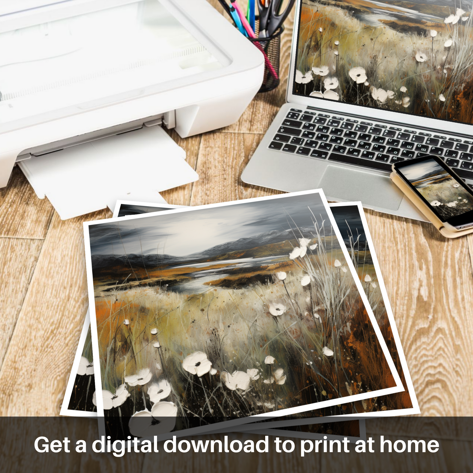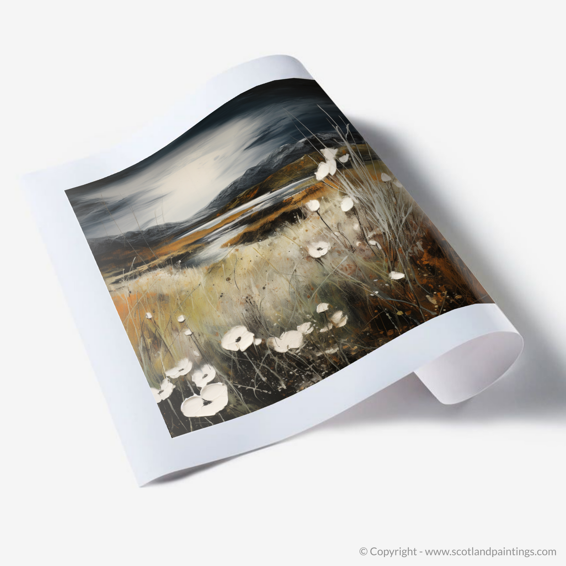 Immerse yourself in the captivating charm of the Isle of Skye's upland bogs with this mesmerising print, where the delicate, ethereal beauty of Cotton grass emerges as the focal star. This seminal piece, employing a surrealist touch, evokes a dreamscape where the gentle sway of each Cotton grass tuft is rendered with a ghostly translucence against a backdrop of a starkly contrasting palette.