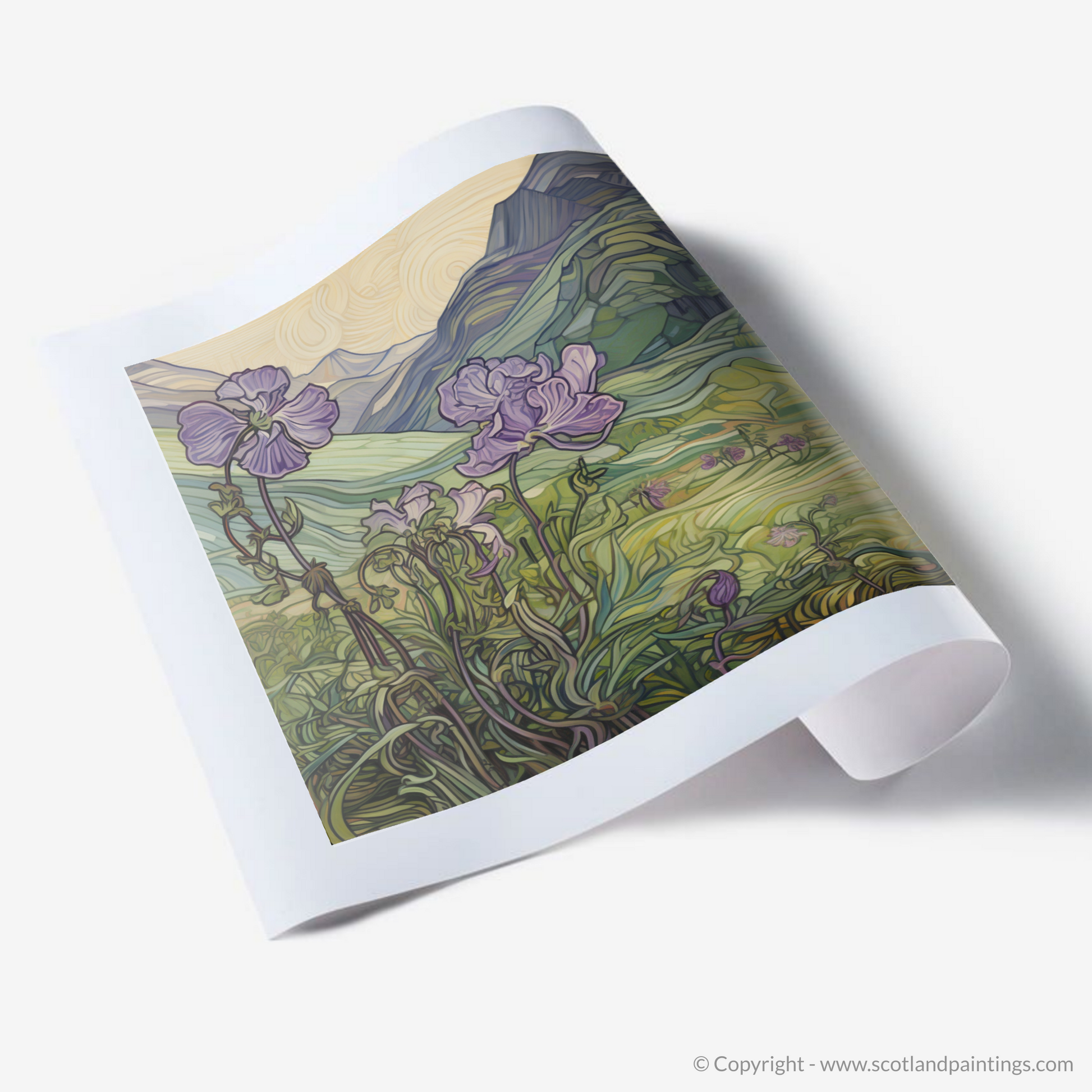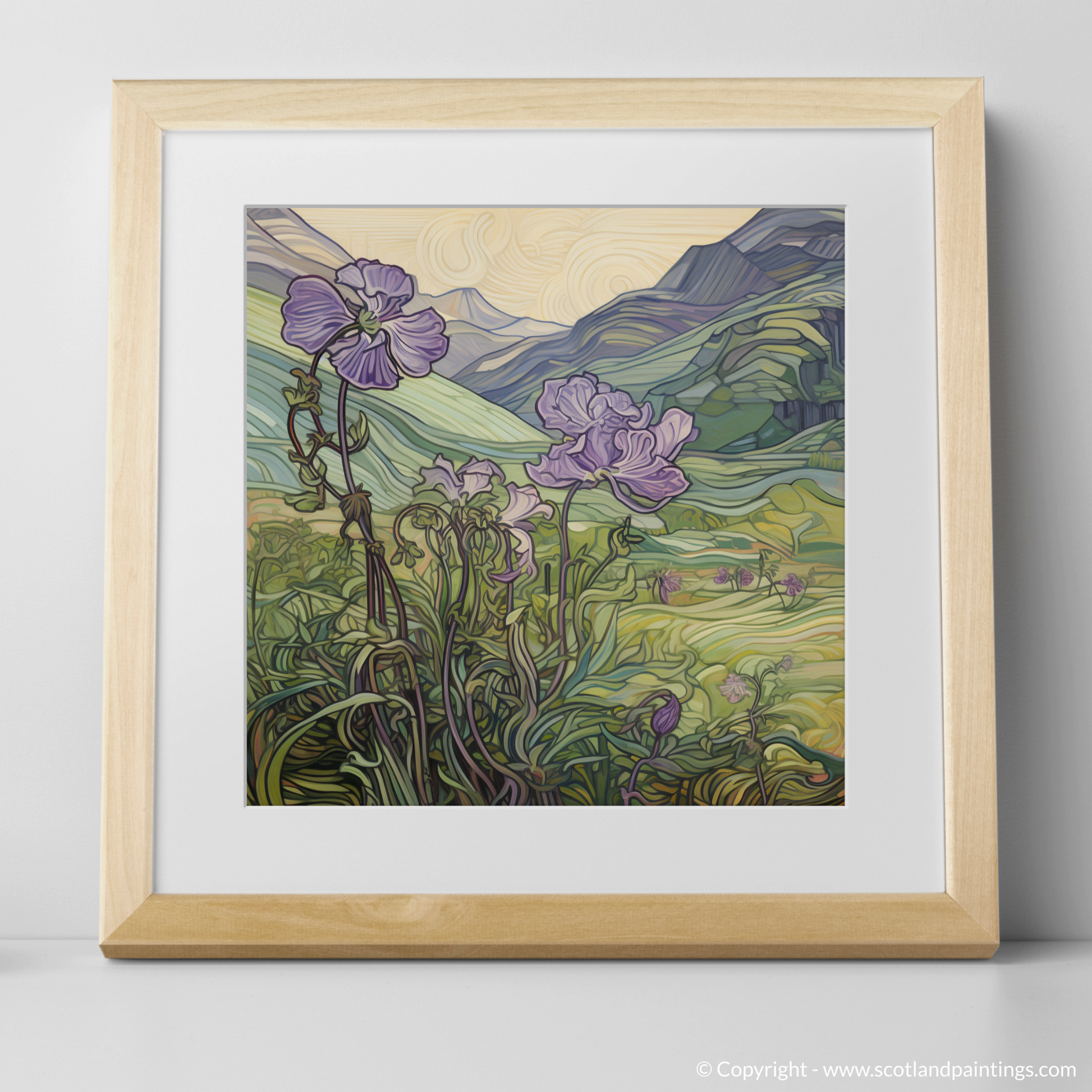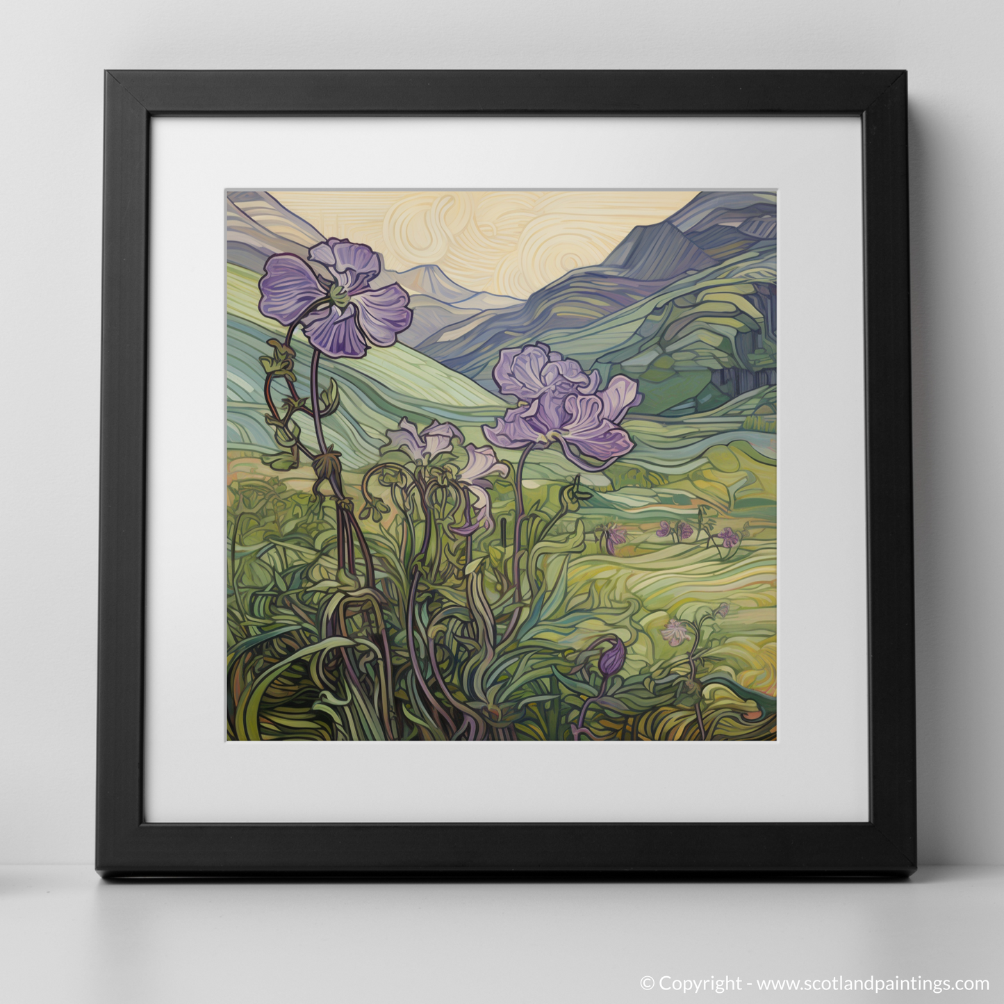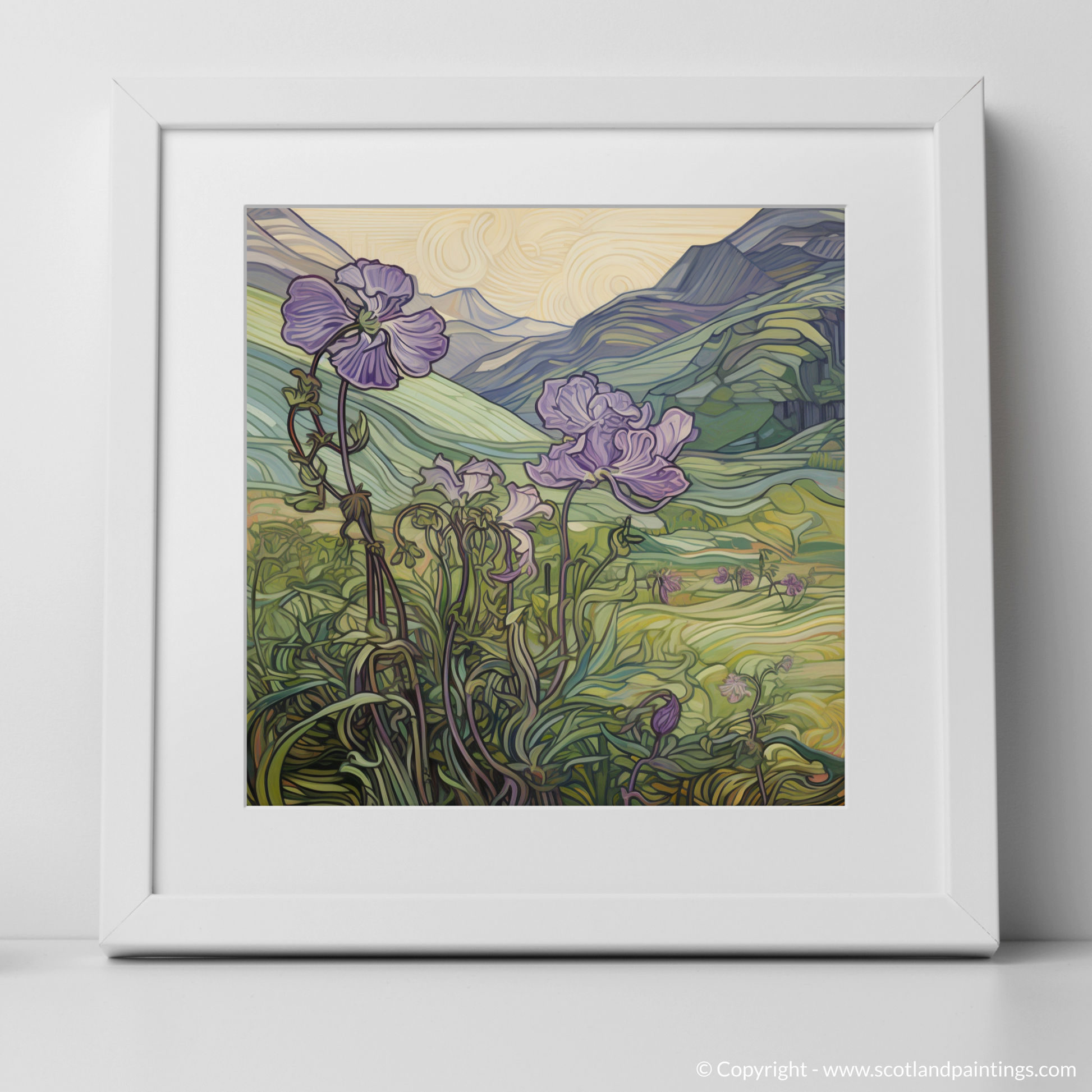 Capturing the evocative beauty of the Scottish highlands, this captivating print presents the delicate Wood cranesbill in a swirl of Art Nouveau elegance. Poised against an enchanting backdrop of Glencoe's undulating meadows, the rich purples and subtle pinks of the blooms contrast harmoniously with the verdant greens and muted earth tones of the landscape.