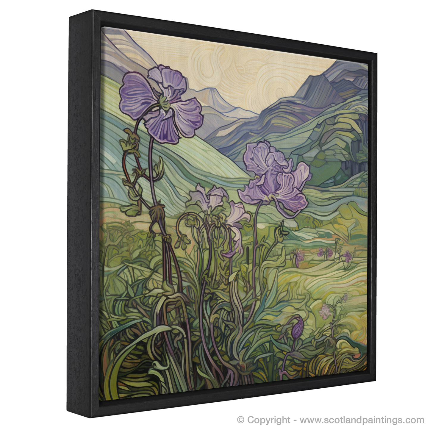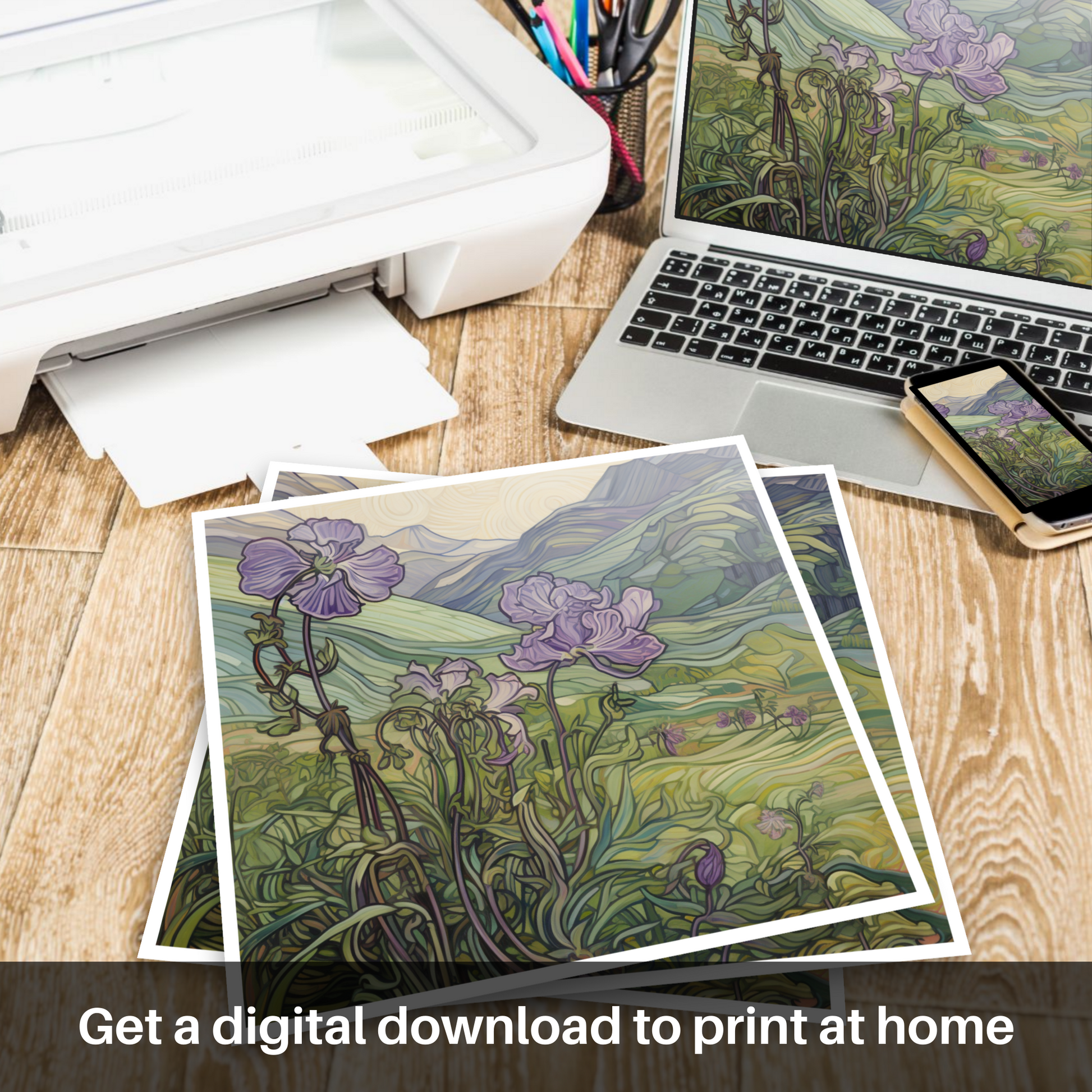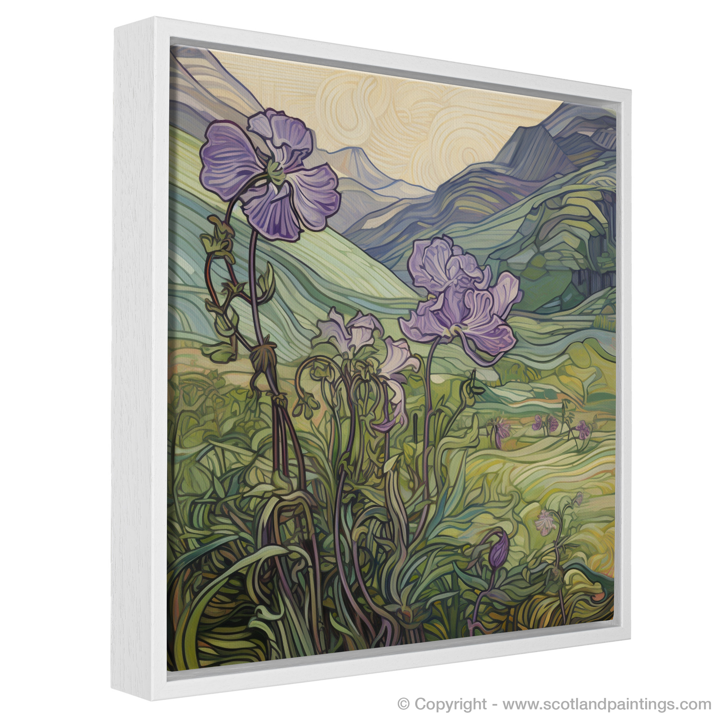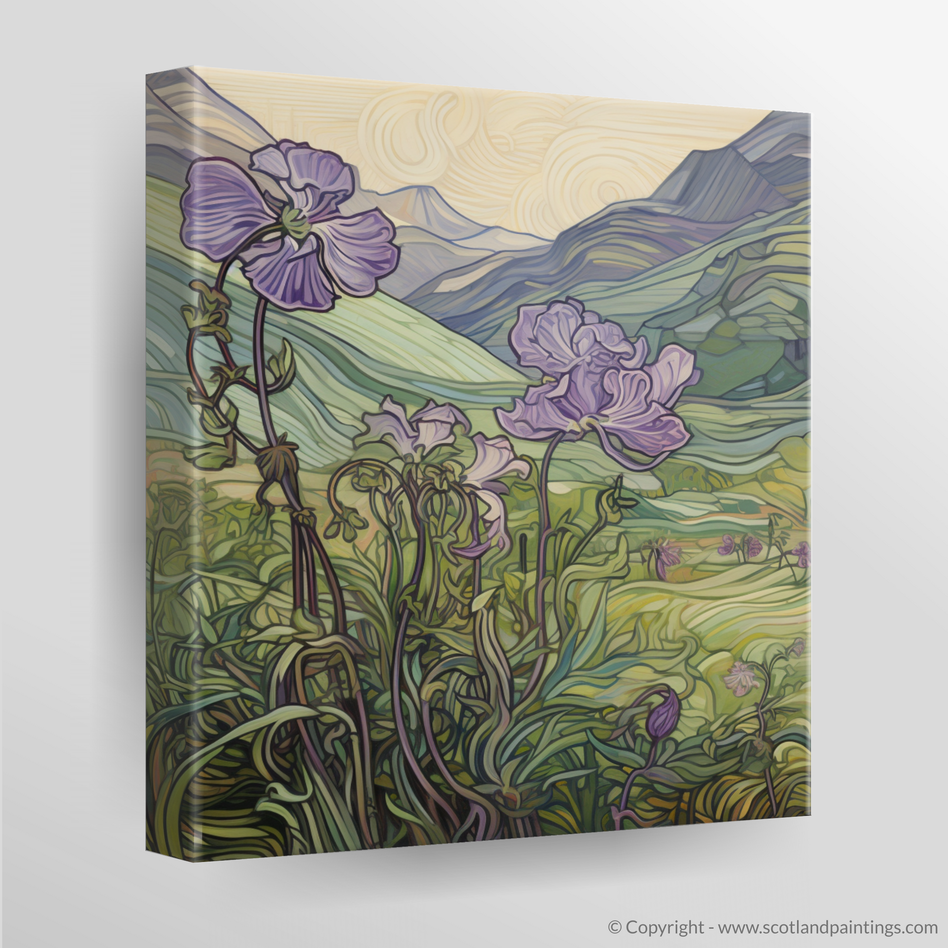Capturing the evocative beauty of the Scottish highlands, this captivating print presents the delicate Wood cranesbill in a swirl of Art Nouveau elegance. Poised against an enchanting backdrop of Glencoe's undulating meadows, the rich purples and subtle pinks of the blooms contrast harmoniously with the verdant greens and muted earth tones of the landscape.