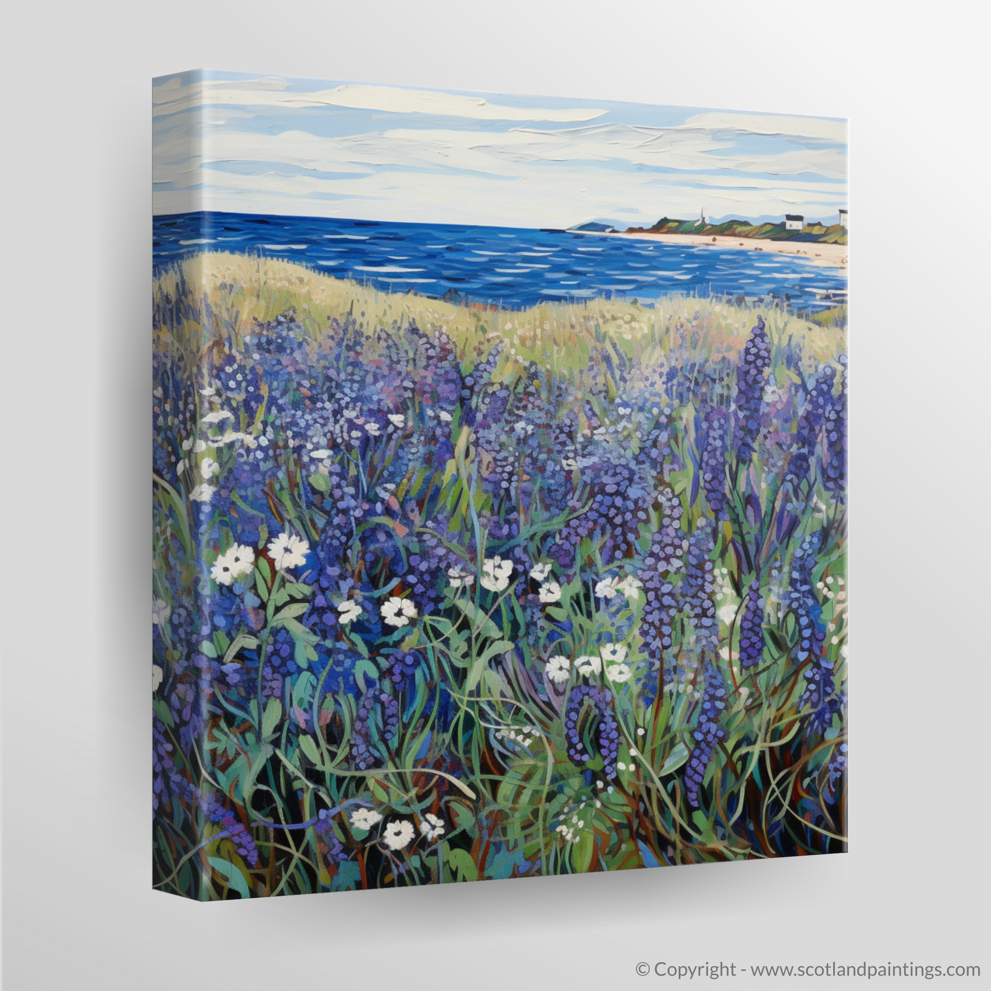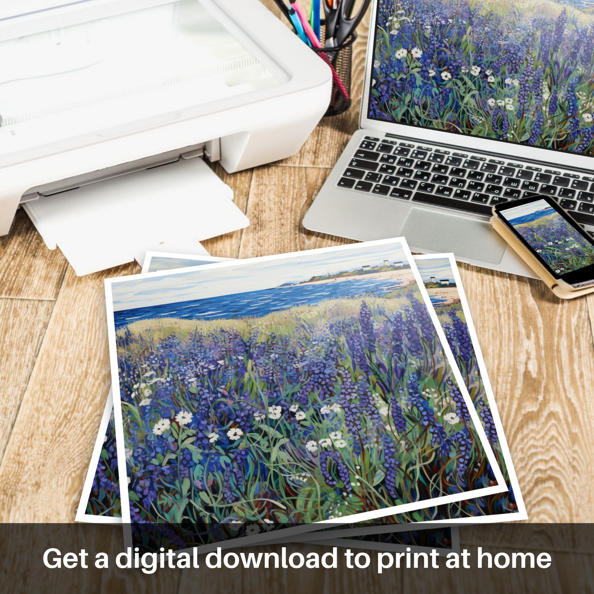 At the forefront, a vibrant cluster of Viper's bugloss stands tall, a riot of deep purples and indigos against the soft greens of the coastal grass. Each brushstroke builds upon the next, creating a dense thicket of colour that invites the viewer to lose themselves in its intricate details. Intermittent specks of stark white and subtle pastels give life to the surrounding wildflowers, offering a harmonious contrast to the dominance of the striking blues.