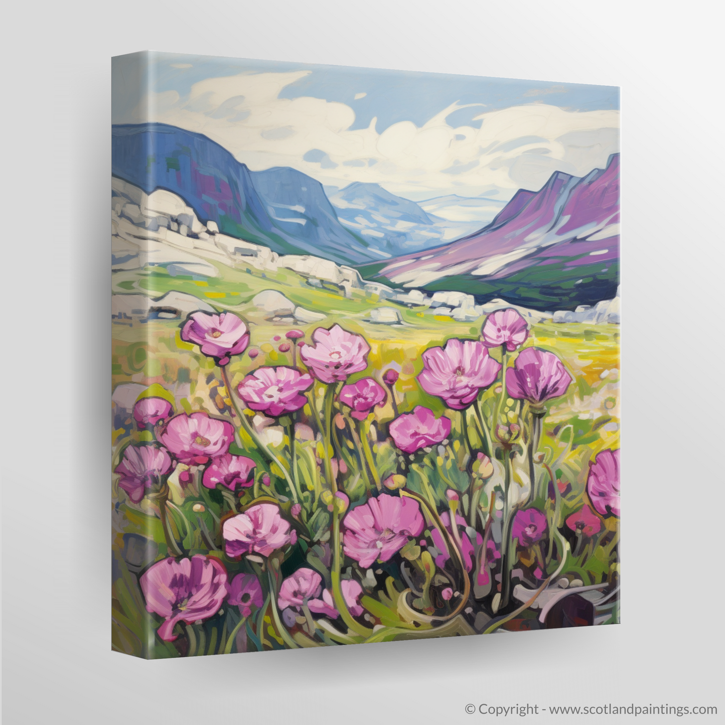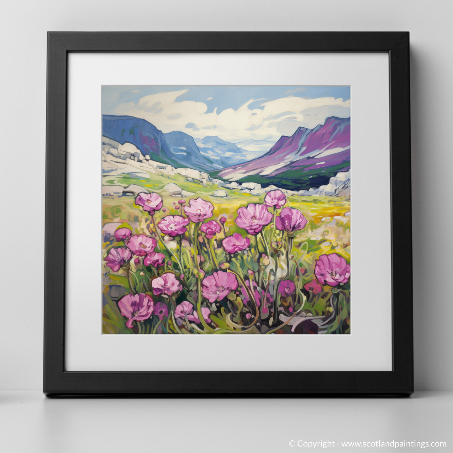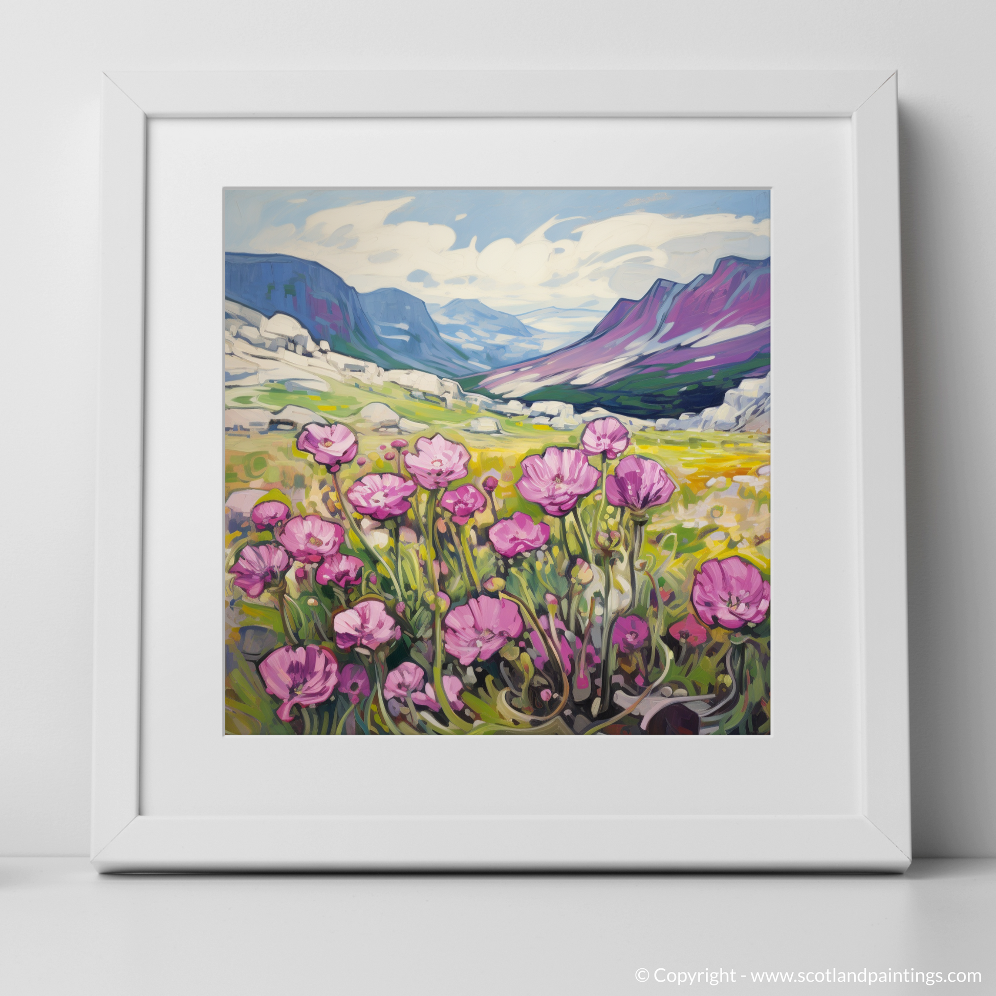 Invoking the vibrant energy of Fauvism, this evocative print captures the raw beauty of Moss campion amidst the wild majesty of the Cairngorms' alpine zones. With expressive brushstrokes, the artwork comes alive with pinks as vivid as the first blush of dawn, the delicate petals standing out against the calling contrast of the lush greenery and the golden hues of the surrounding grasslands.