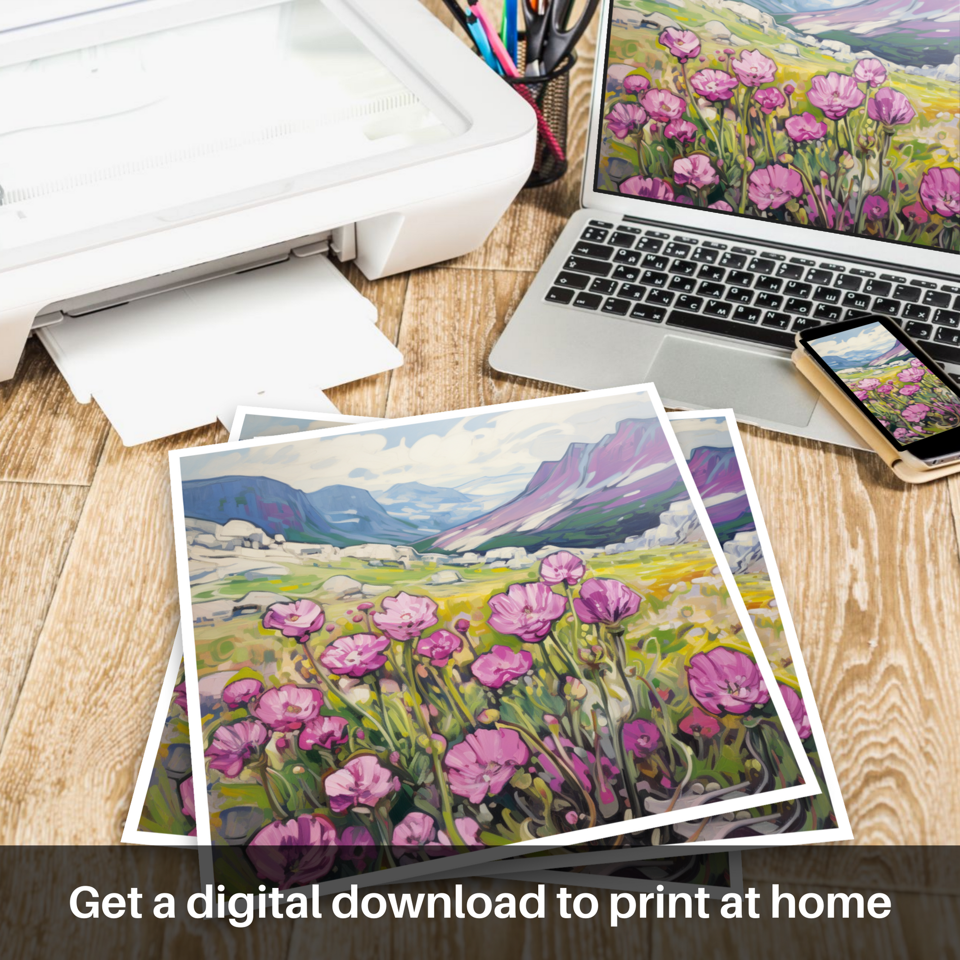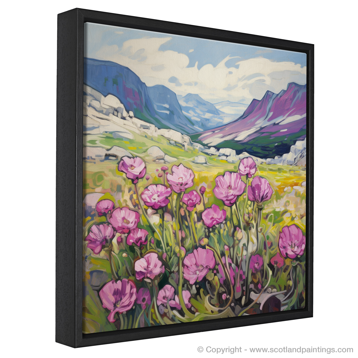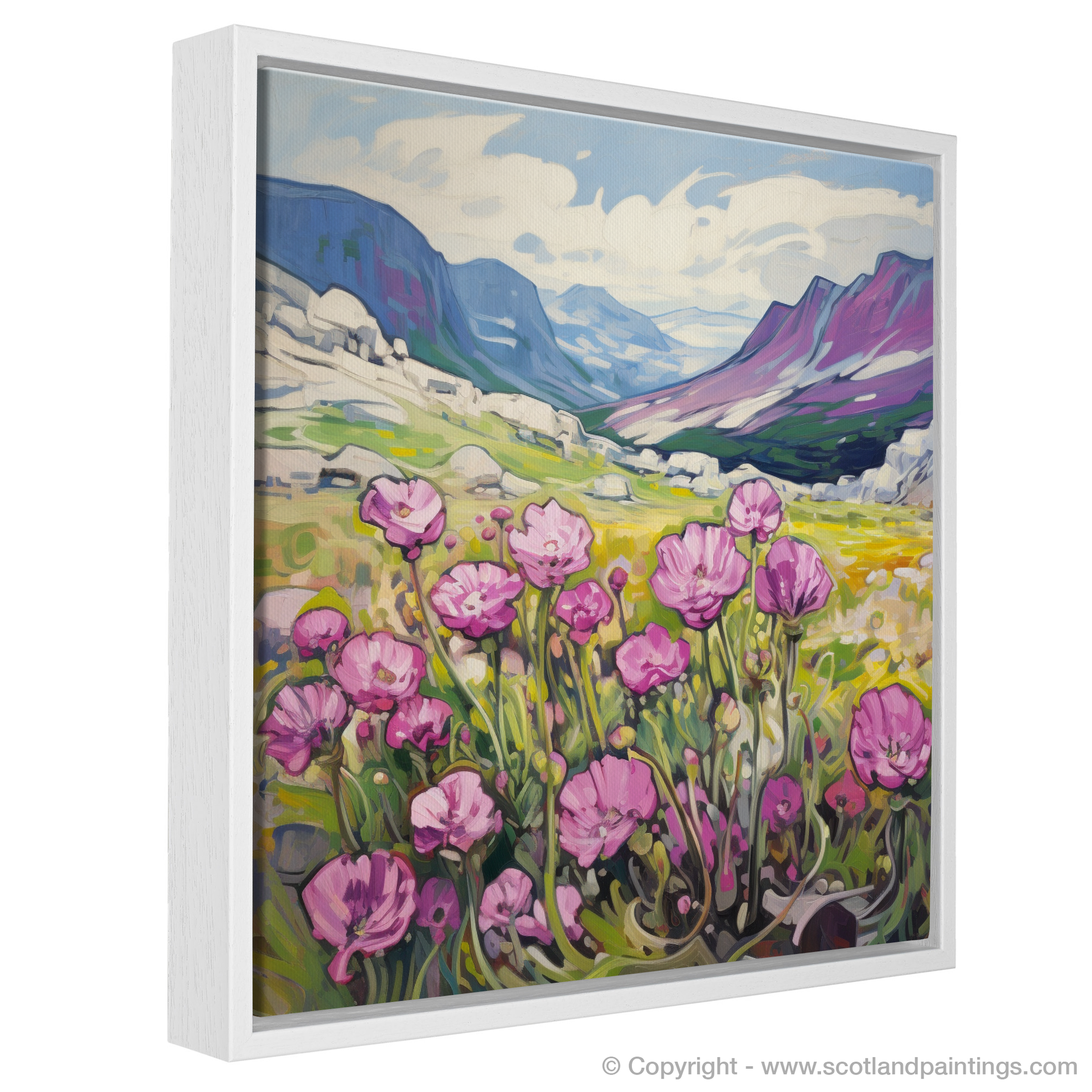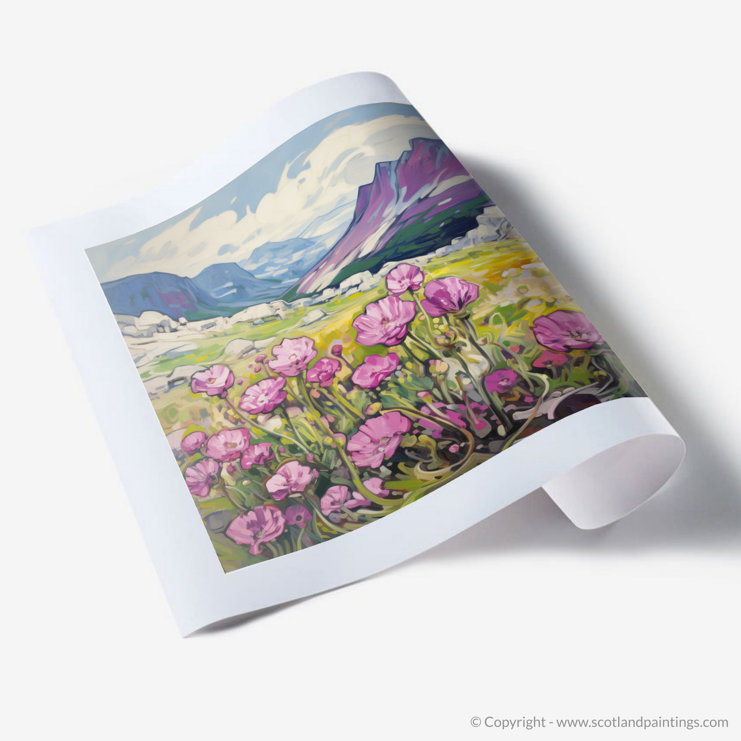 Invoking the vibrant energy of Fauvism, this evocative print captures the raw beauty of Moss campion amidst the wild majesty of the Cairngorms' alpine zones. With expressive brushstrokes, the artwork comes alive with pinks as vivid as the first blush of dawn, the delicate petals standing out against the calling contrast of the lush greenery and the golden hues of the surrounding grasslands.