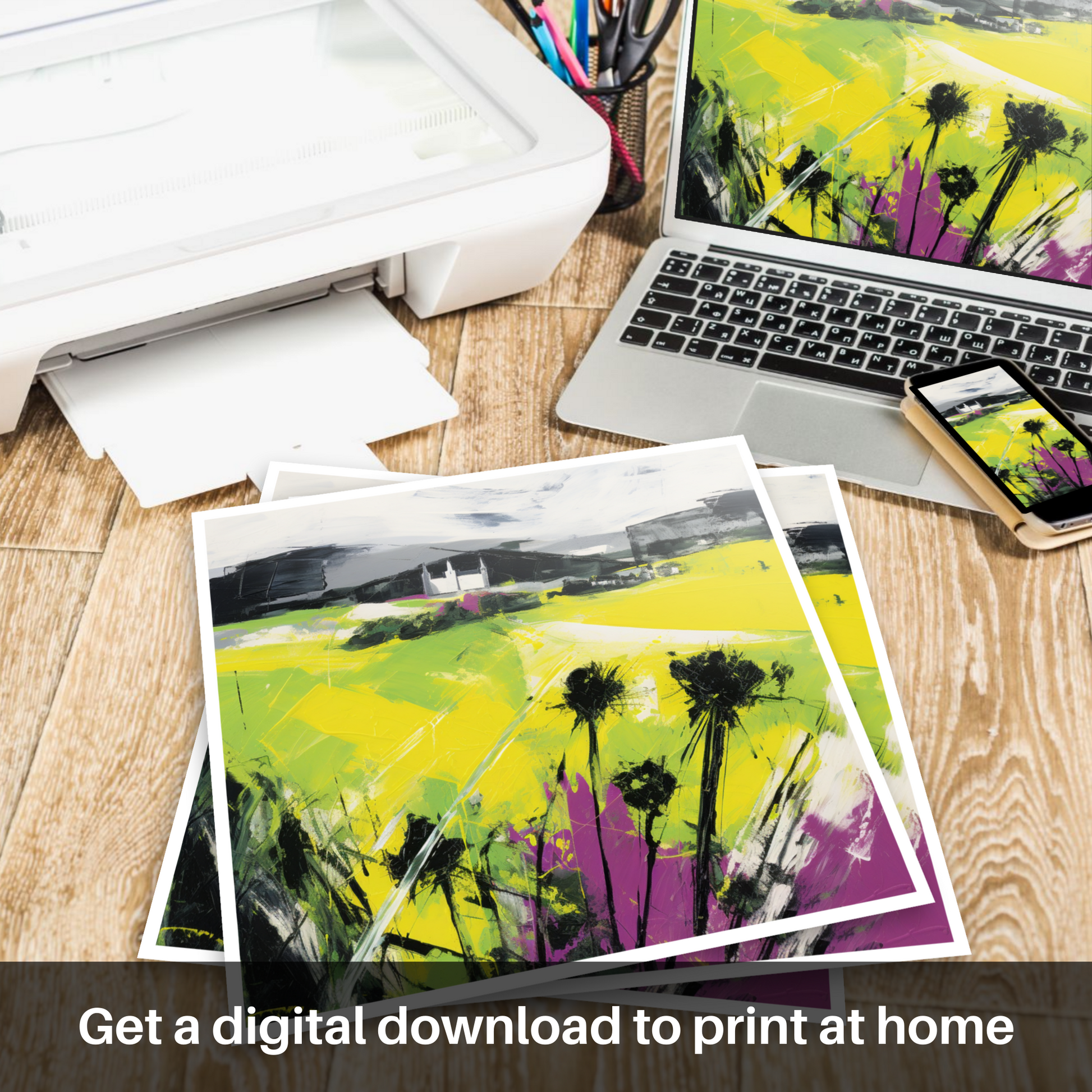 Immerse yourself in the vibrant essence of Scotland with this abstract interpretation of Scotland's national flower, the thistle, embraced by the rustic charm of the fields that meander around Stirling Castle. Dominated by bold strokes and an energising palette, this print juxtaposes the dark, spikey silhouettes of the thistles against the dazzling yellows of the Scottish meadows, with the majestic castle in the distance offering a quiet nod to the country's storied past.